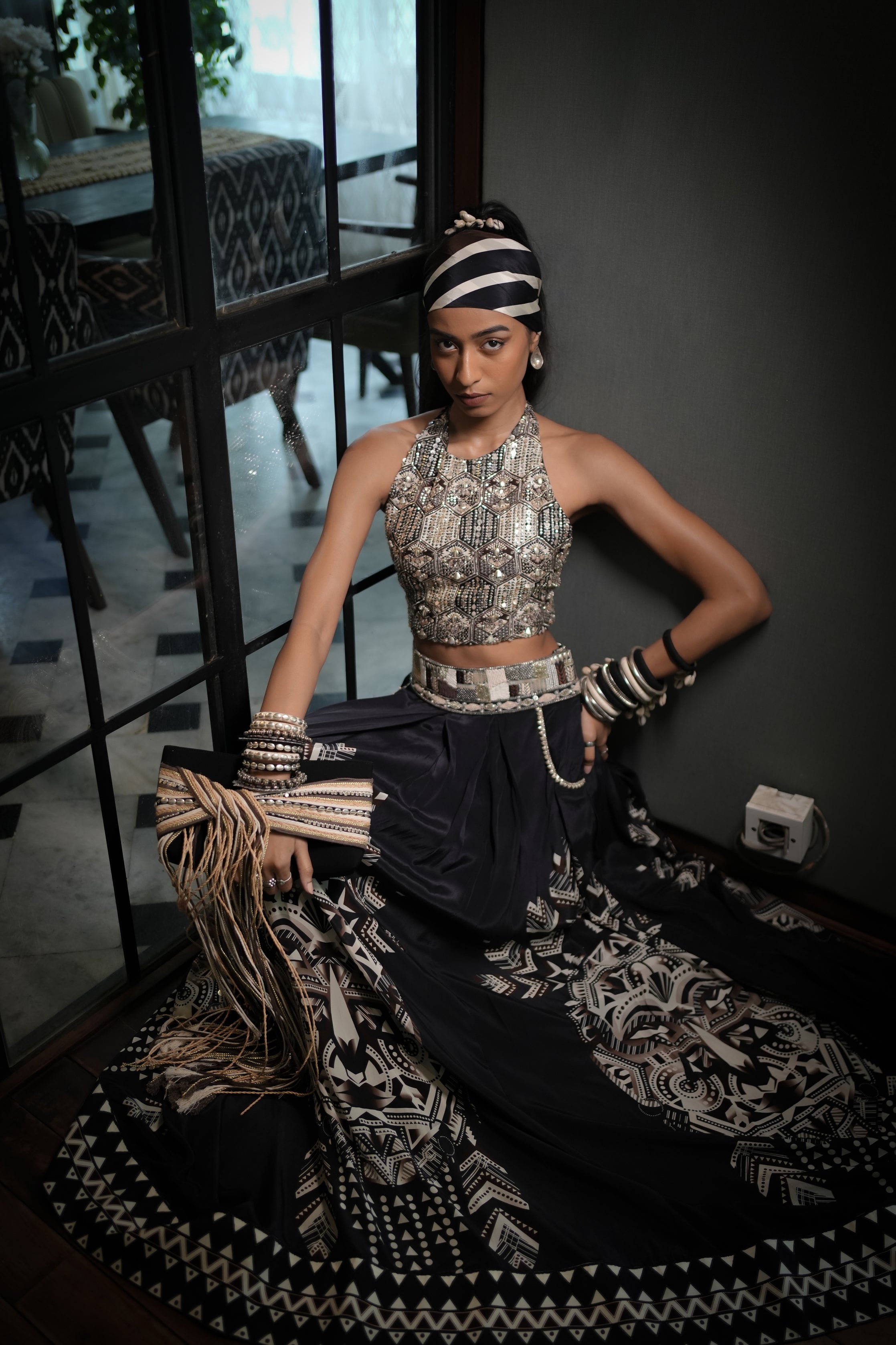 This ensemble features a striking hexagon printed embellished halter neck croptop It is paired with a box pleat printed lehenga adorned with bold geometric and mask motifs in earthy tones. The combination of metallic elements with bold prints creates a perfect fusion of contemporary and ethnic aesthetics, ideal for modern festive wear.
