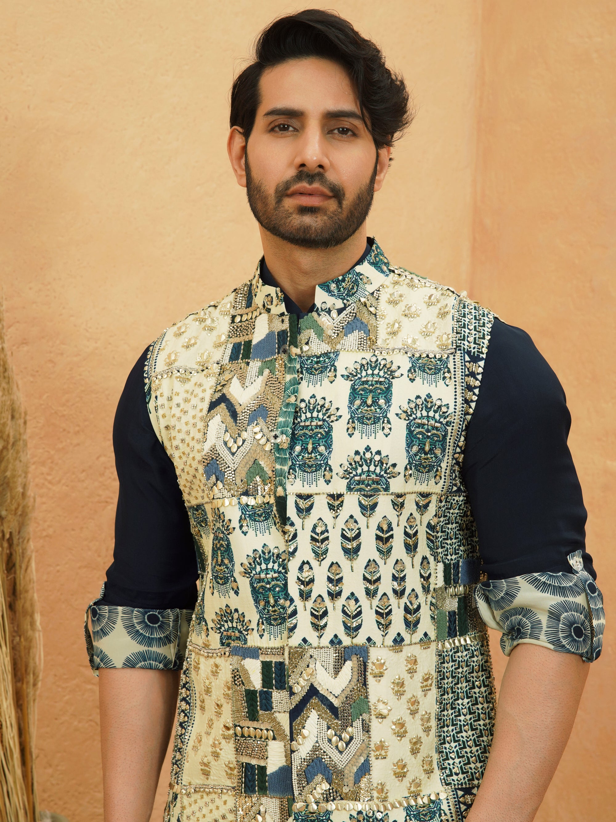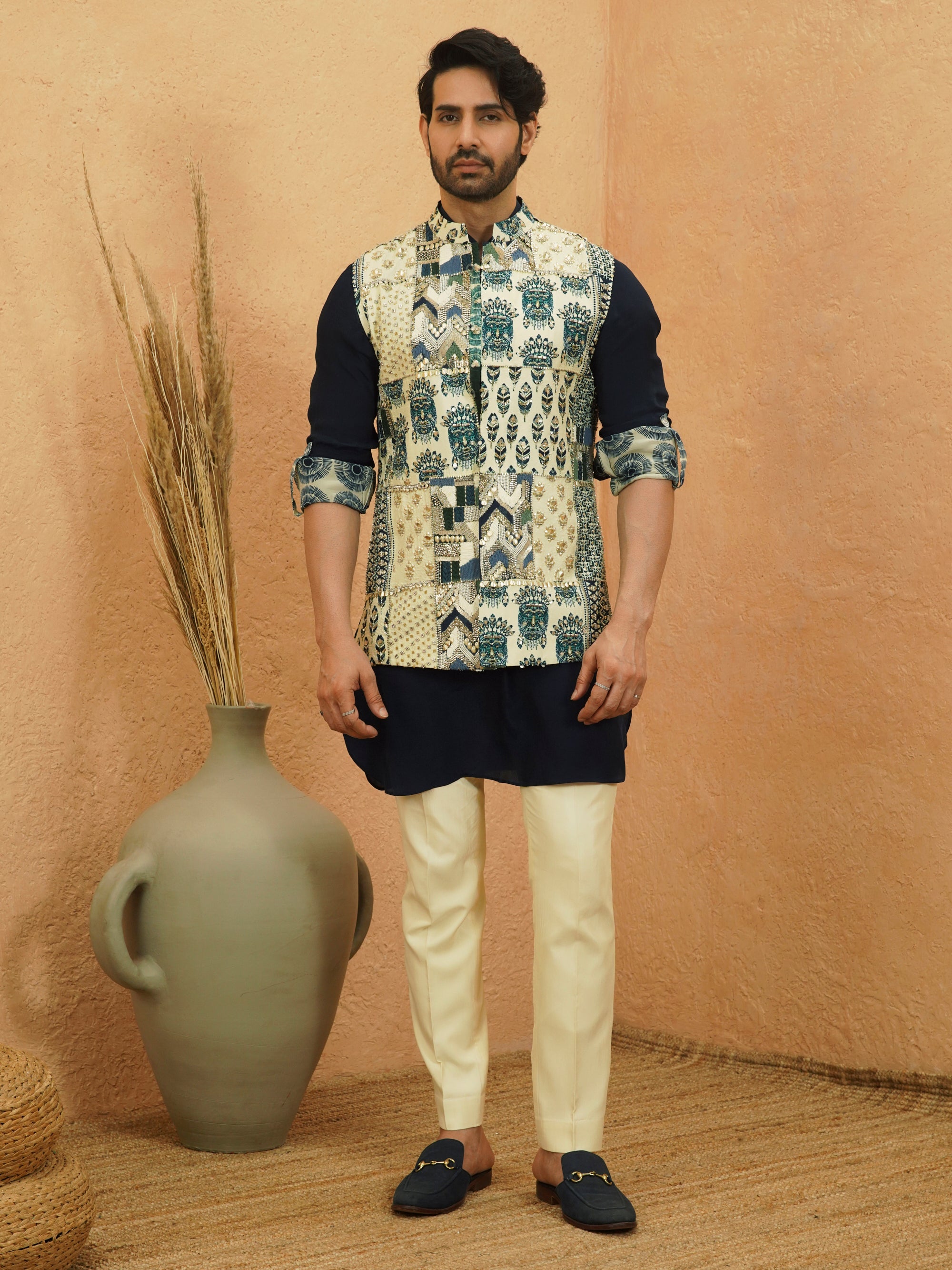 This ensemble pairs a patchwork bundi featuring an eclectic mix of prints in neutral and blue tones with a sleek navy kurta and crisp ivory trousers. The bold pattern on the bundi and the refined silhouettes create a stylish, contemporary look perfect for festive or special occasions.