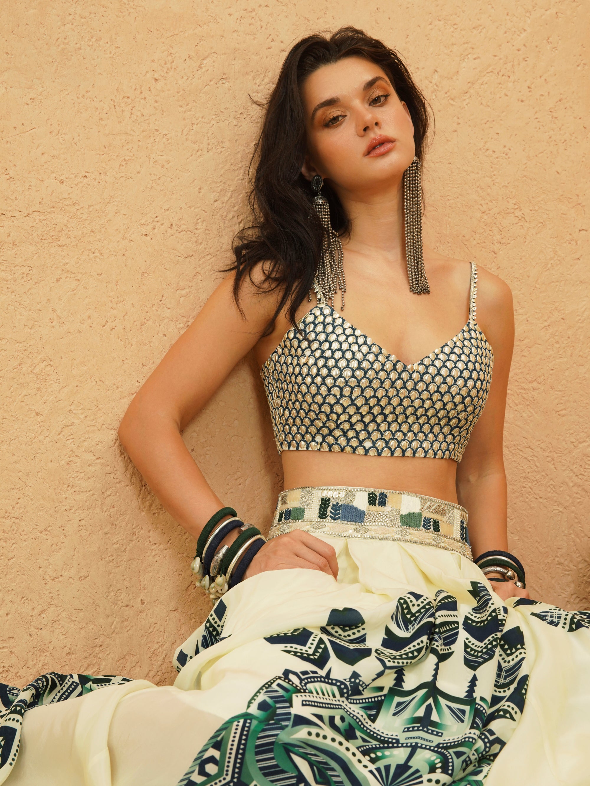This ensemble features a striking metallic bustier with intricate patterns, adding a touch of shimmer and structure. It is paired with a box pleat printed lehenga adorned with bold geometric and mask motifs in earthy tones. The combination of metallic elements with bold prints creates a perfect fusion of contemporary and ethnic aesthetics, ideal for modern festive wear.