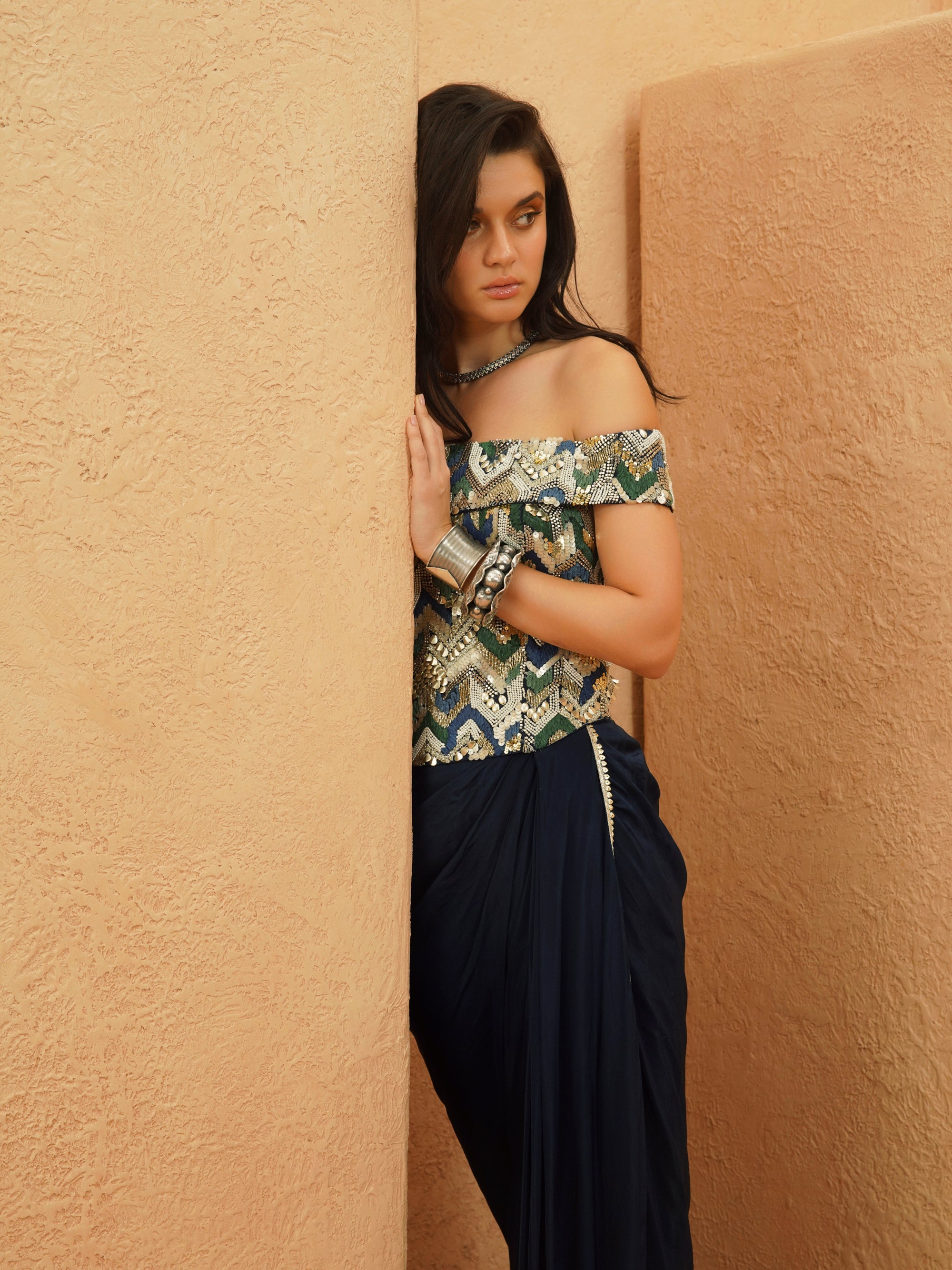 An off-shoulder corset adorned with intricate sequin and metallic embellishments, paired with a gracefully draped skirt. The fusion of structured and fluid elements creates a contemporary yet elegant look, perfect for modern festive dressing.