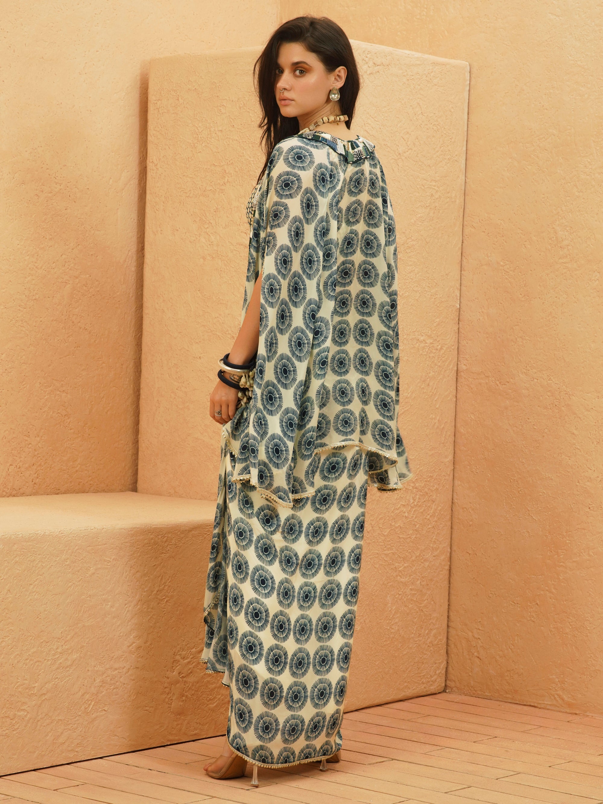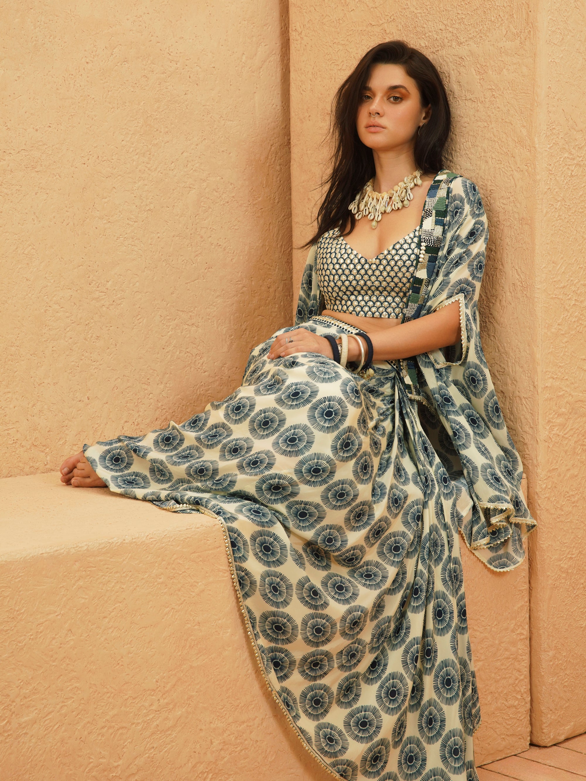 A breezy ensemble featuring a printed cape, a metallic embellished bustier with geometric patterns, and a draped skirt in a fluid silhouette. The mix of prints and textures creates a chic, bohemian-inspired look.