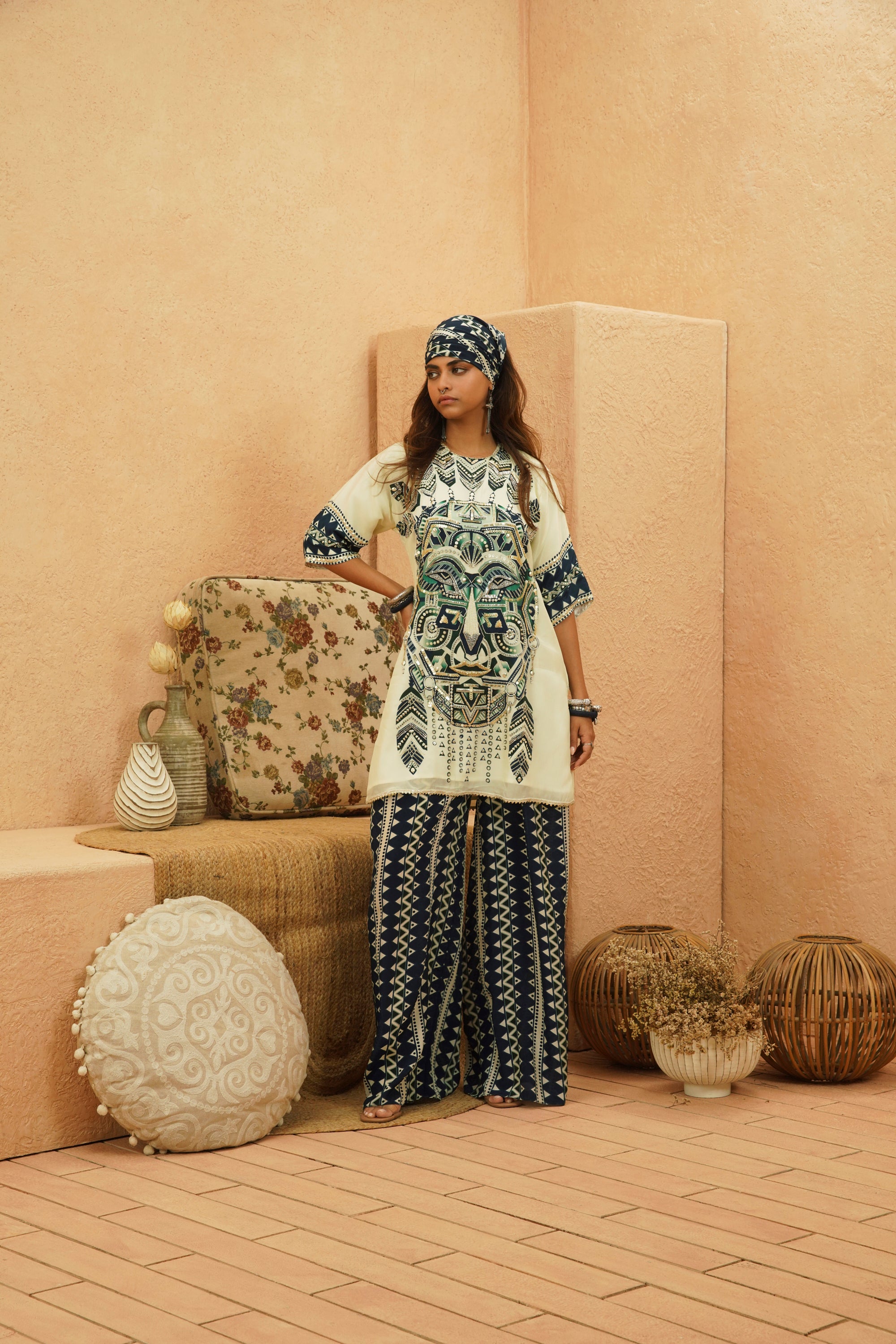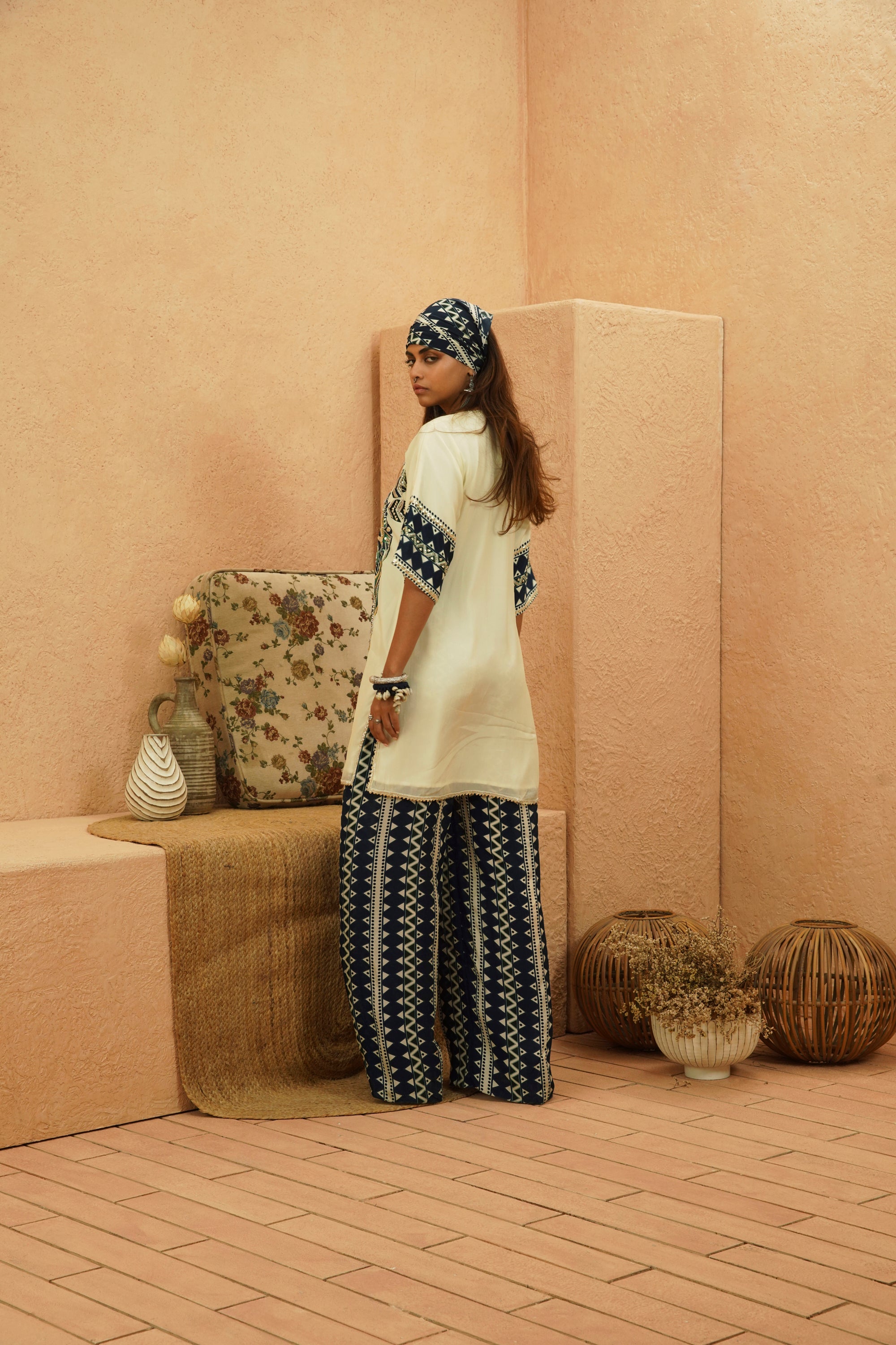 A statement ensemble featuring an intricately embellished kurta with bold geometric and tribal-inspired patterns, paired with pleated wide-leg pants in a matching navy and ivory print.