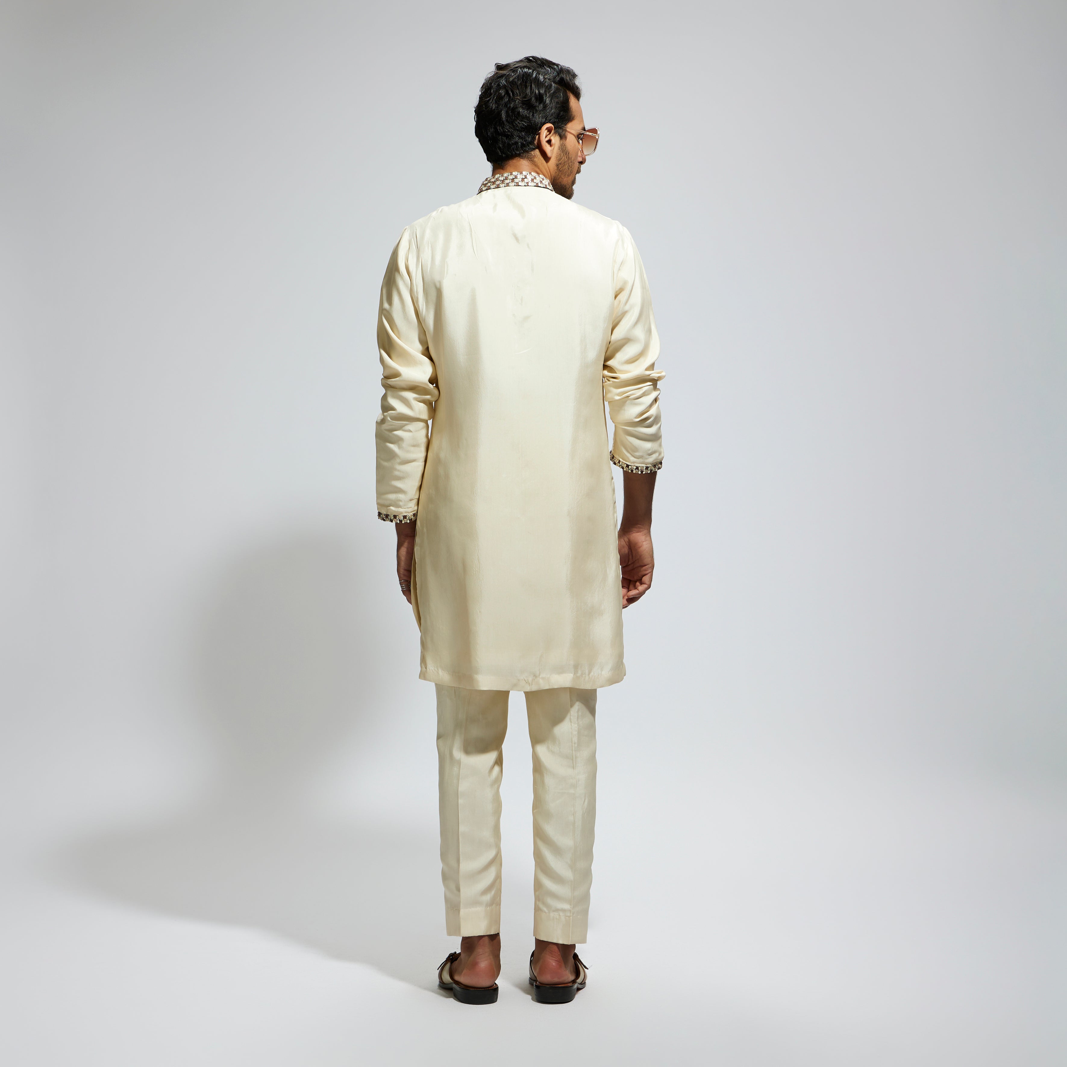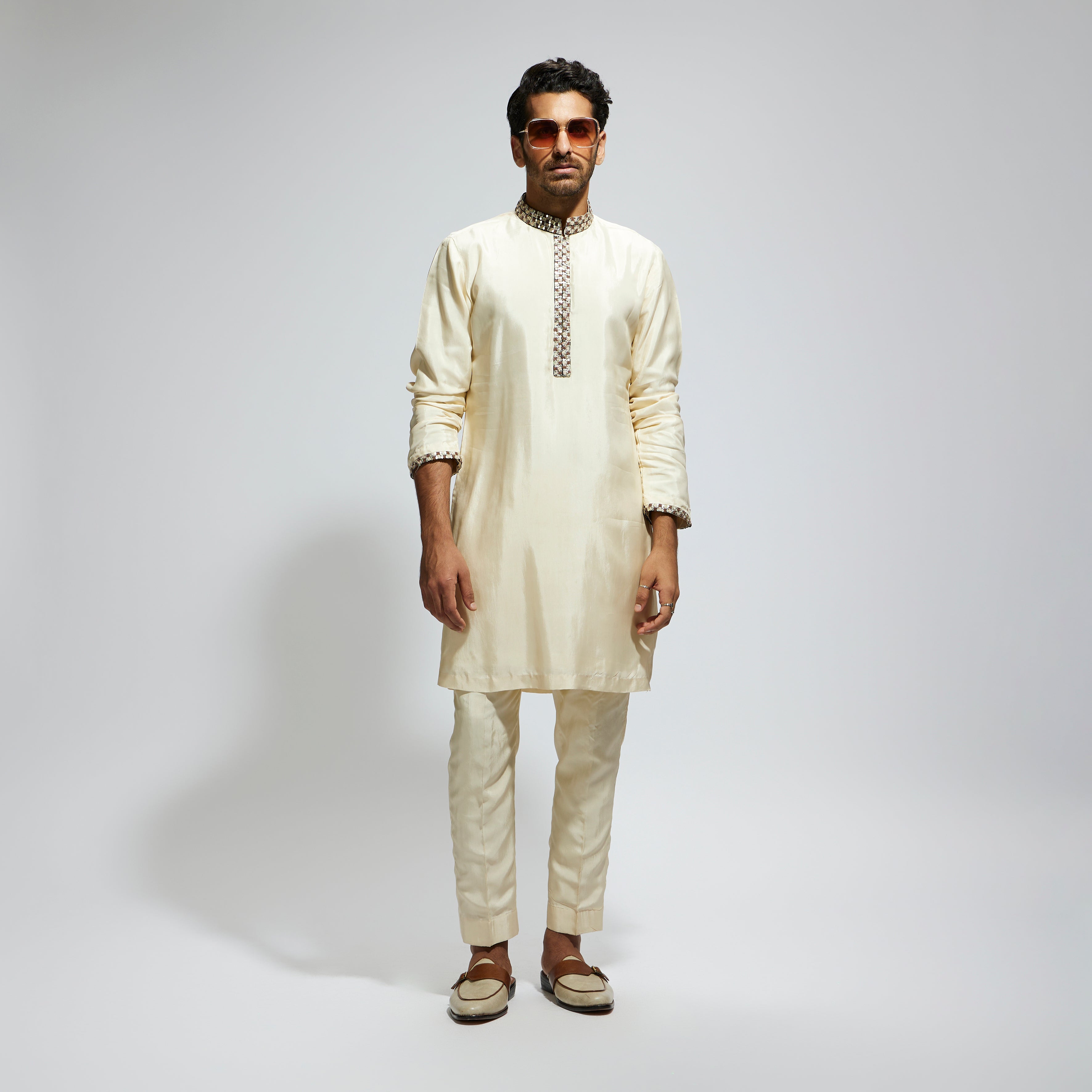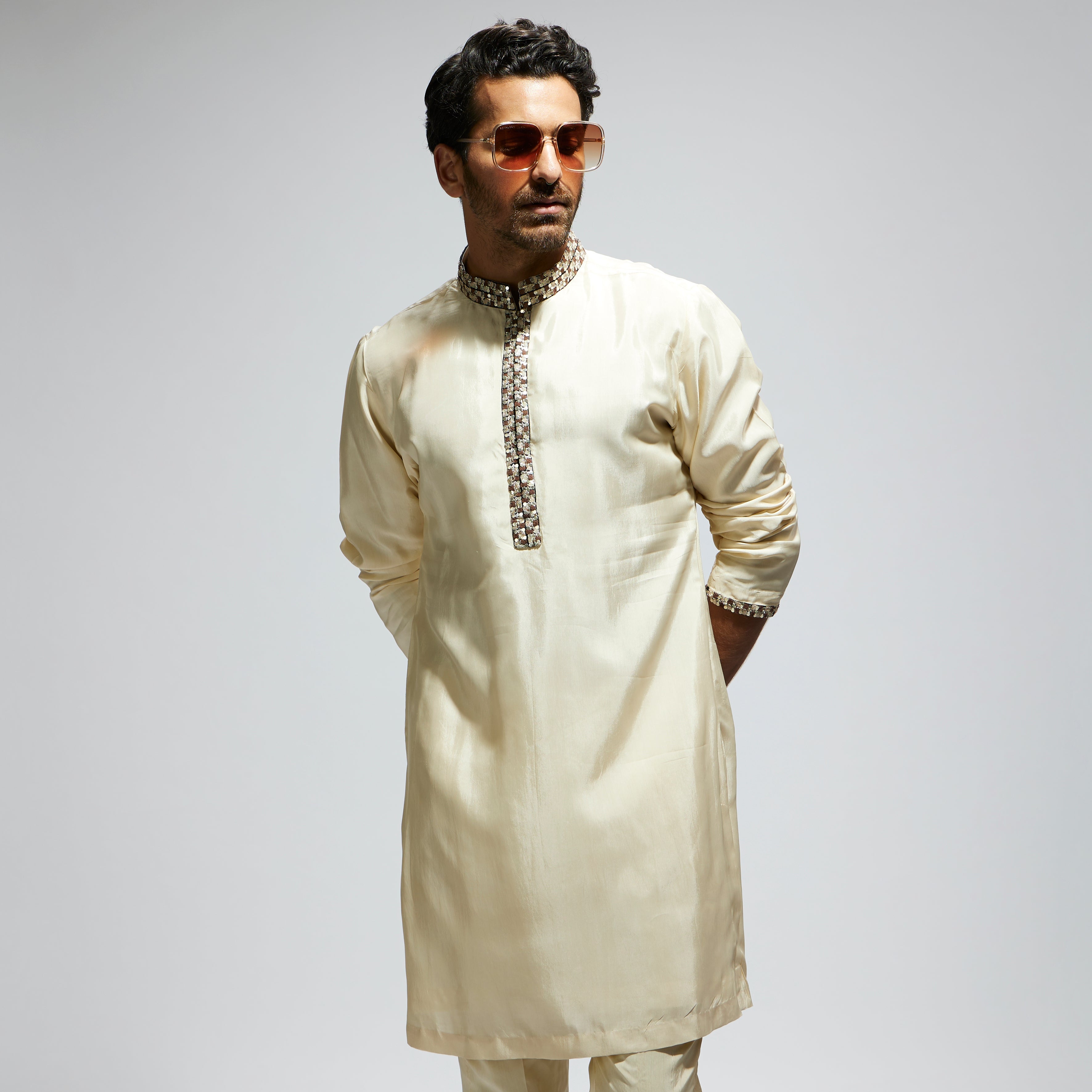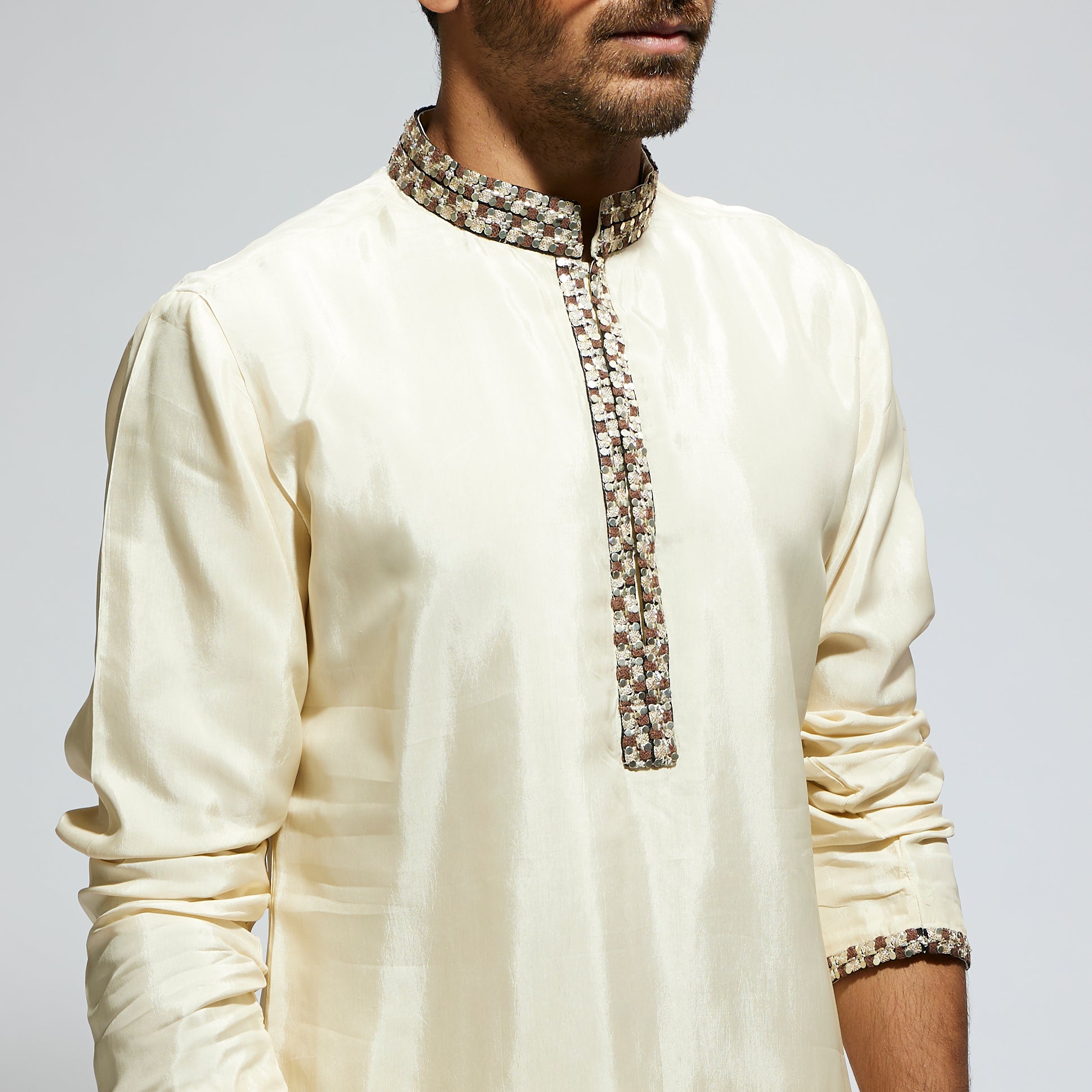 BEIGE SOLID KURTA WITH EMBELLISHED COLLAR AND KURTA PATTI