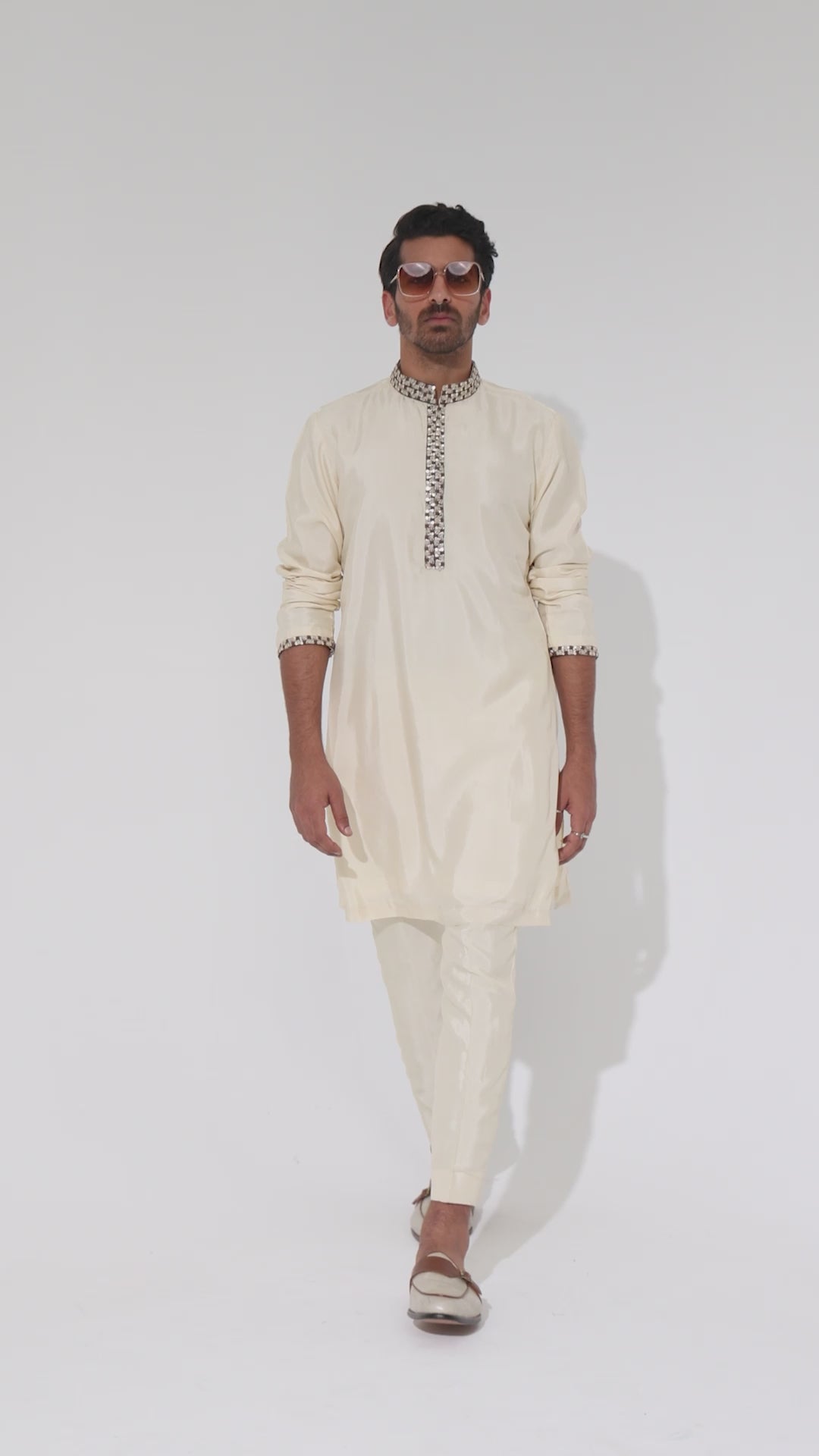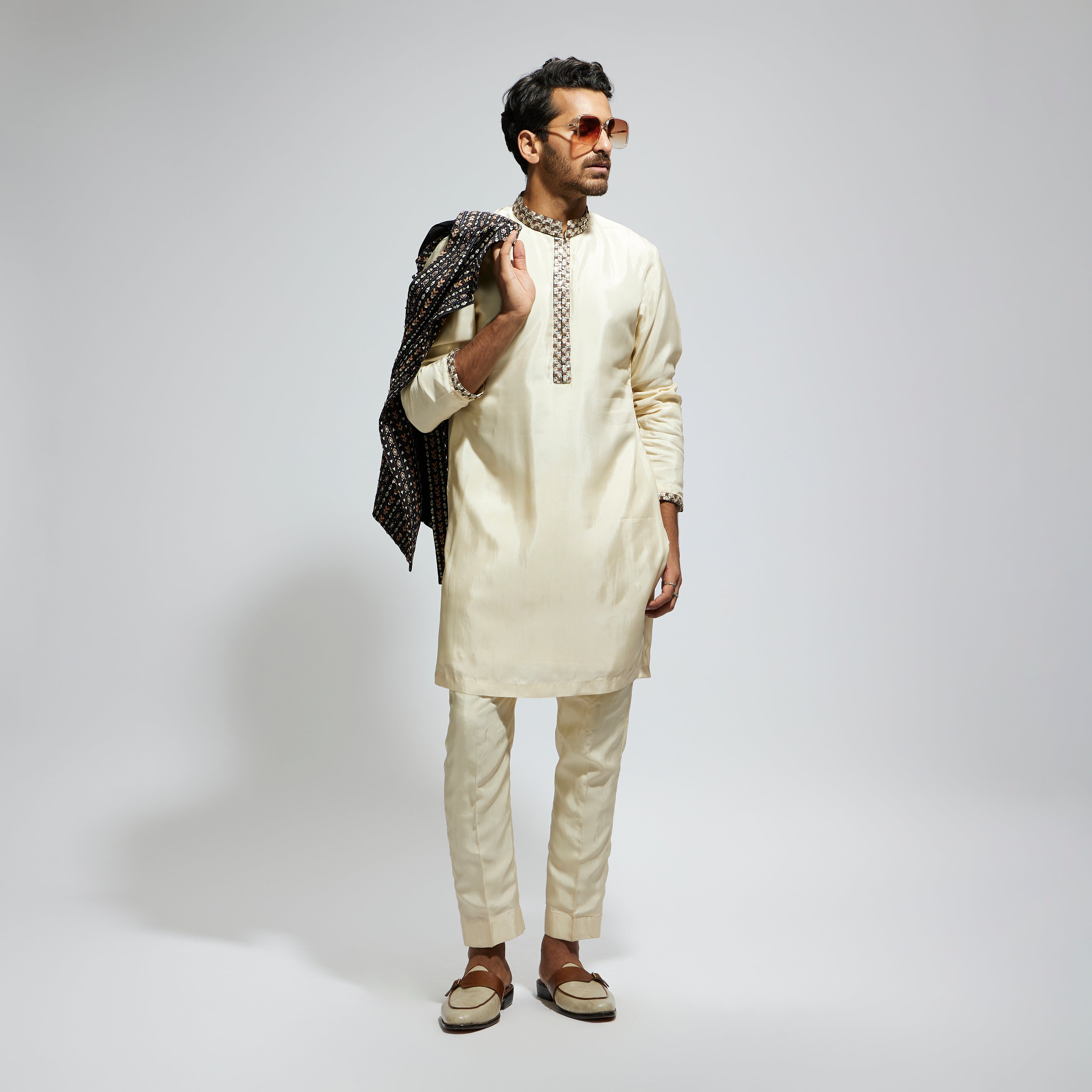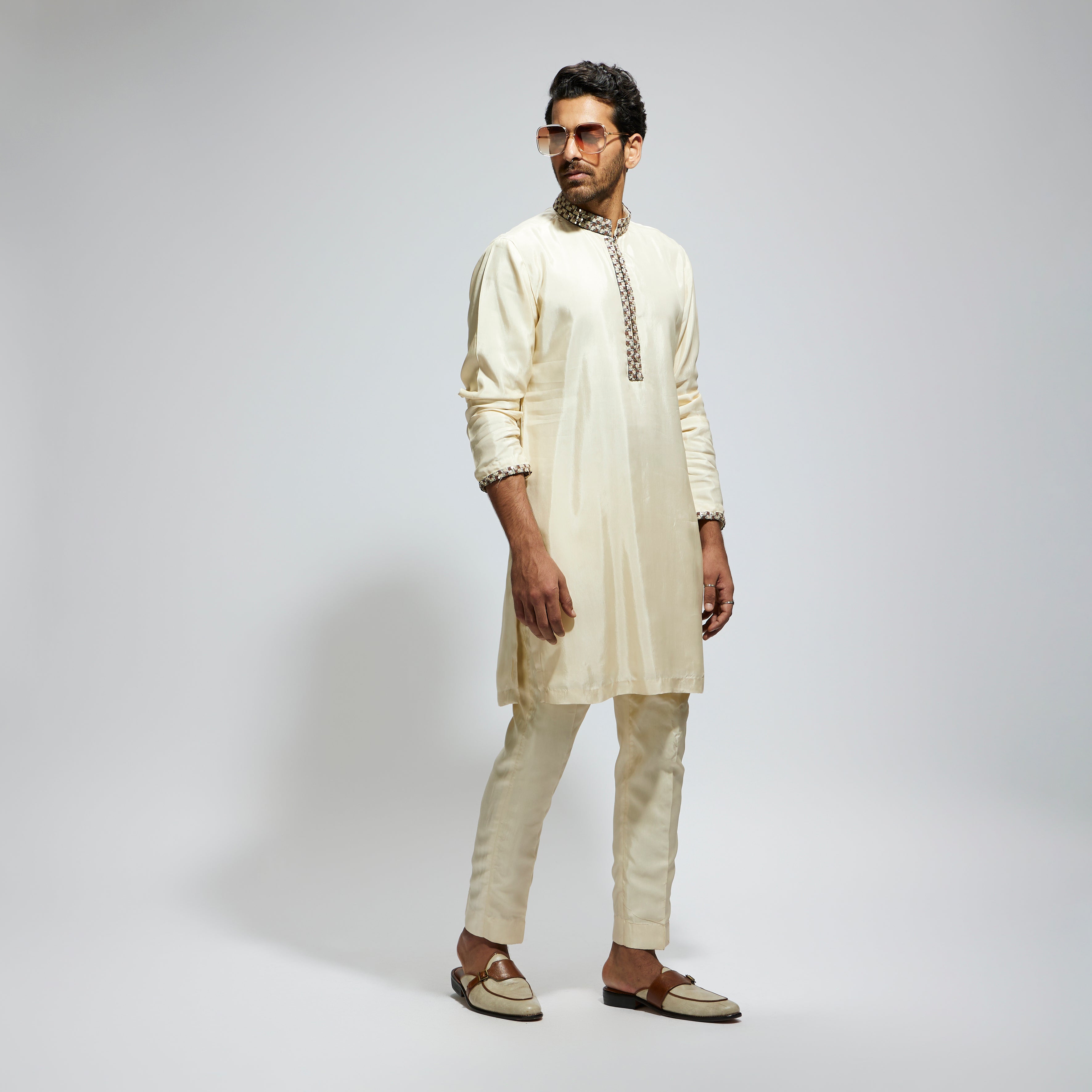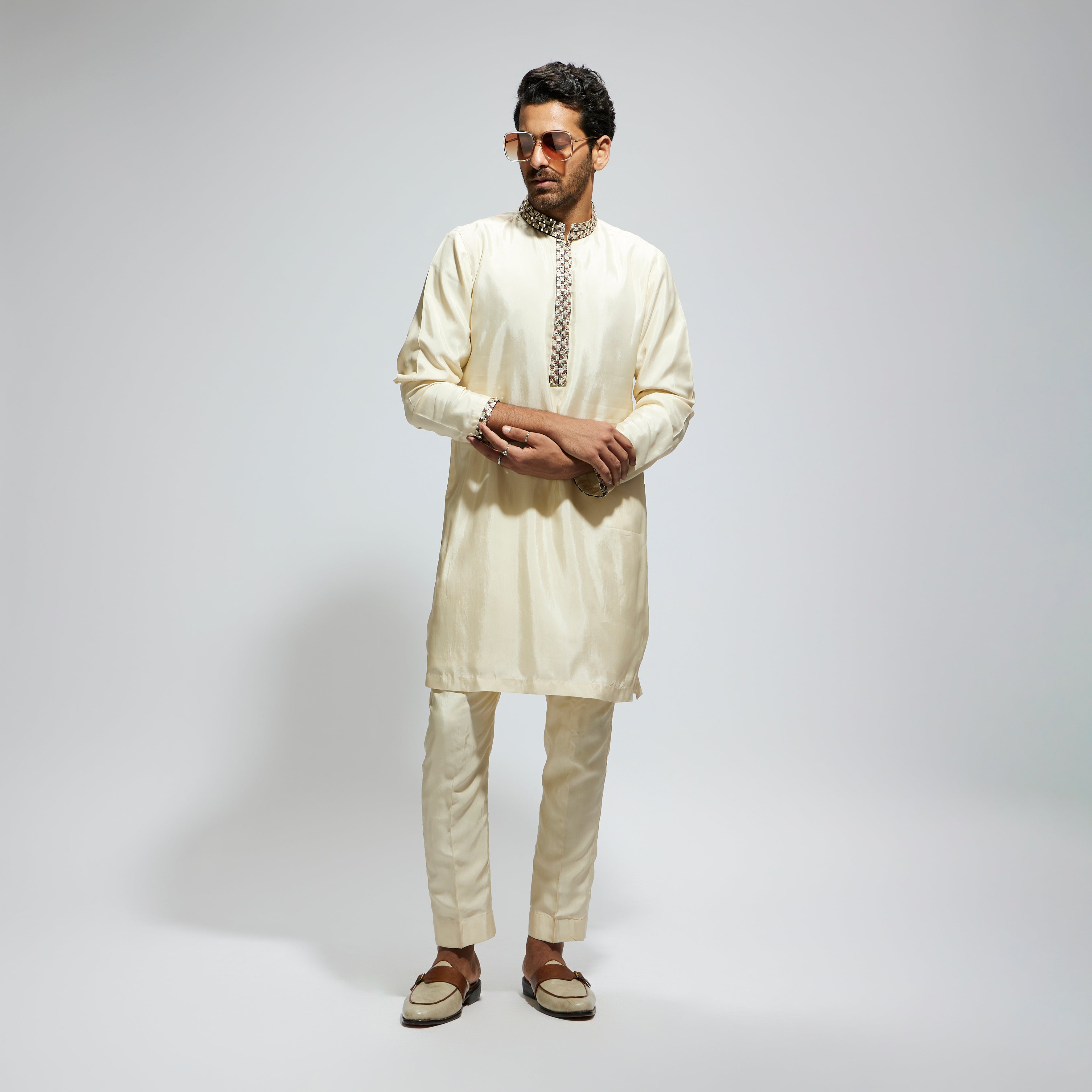 BEIGE SOLID KURTA WITH EMBELLISHED COLLAR AND KURTA PATTI