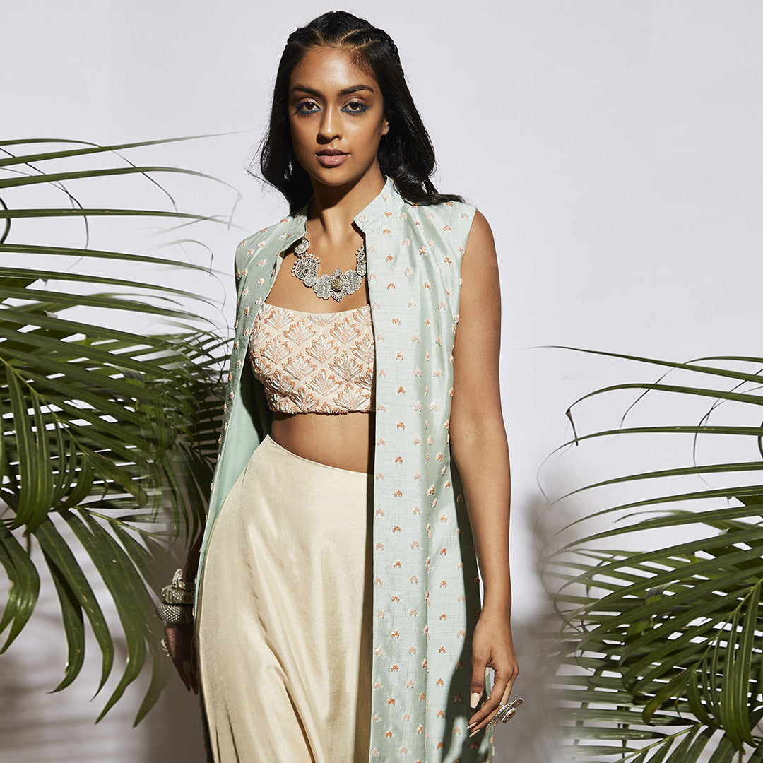 BIEGE MINT OMBRE DRAPE SKIRT WITH BIEGE AND MINT EMBROIDERED STRUCTURED JACKET