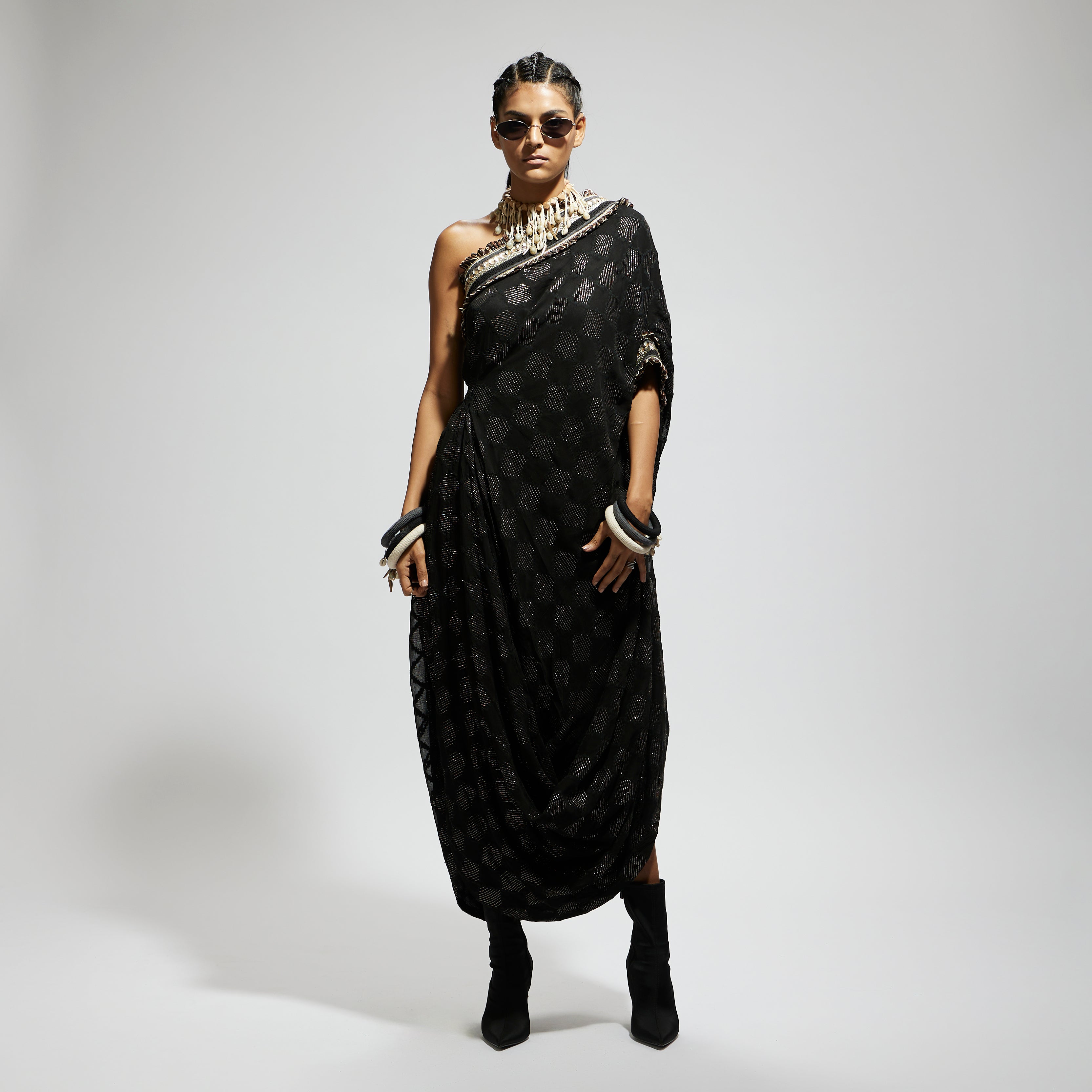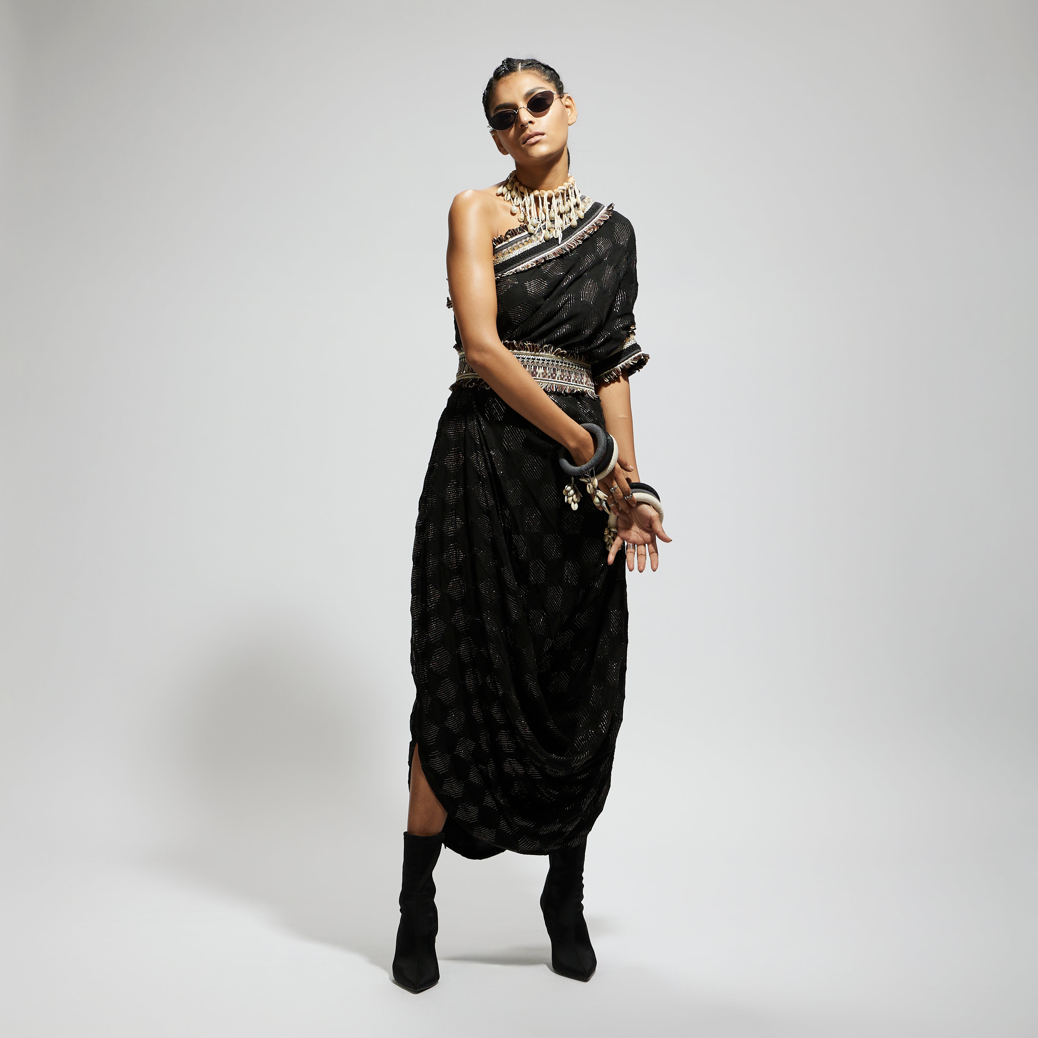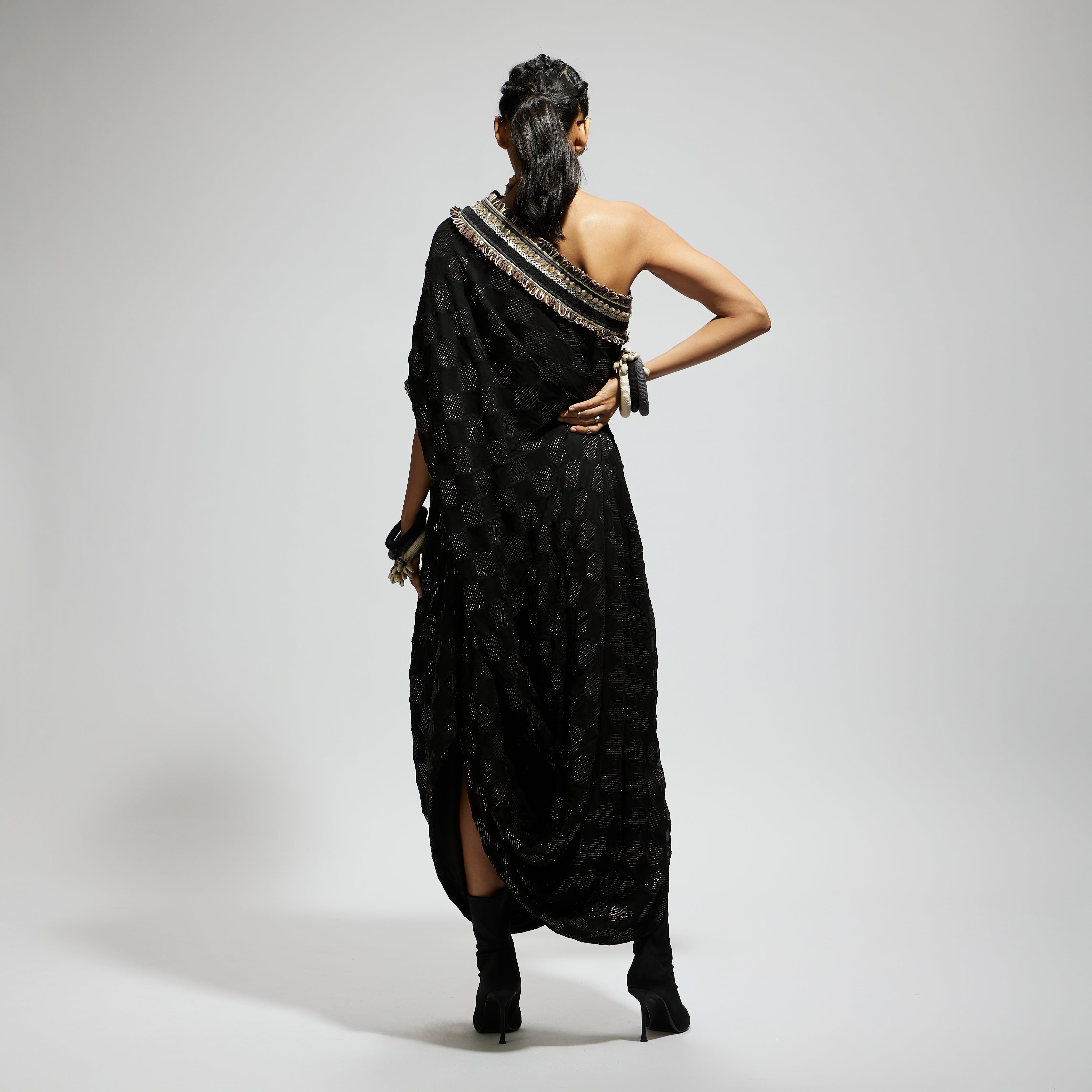 BLACK AZTEC ONE SHOULDER COWL DRESS WITH CUFF