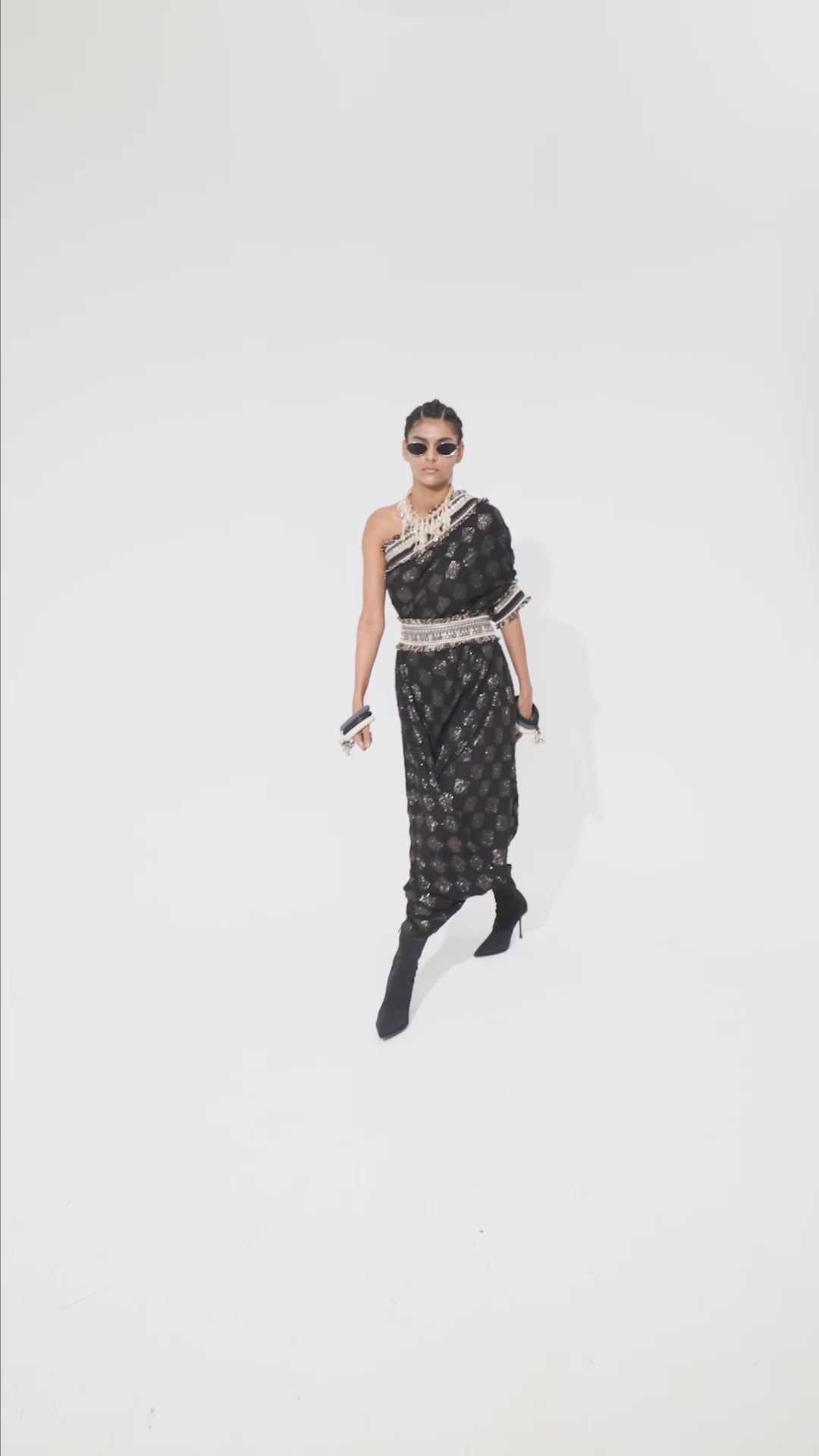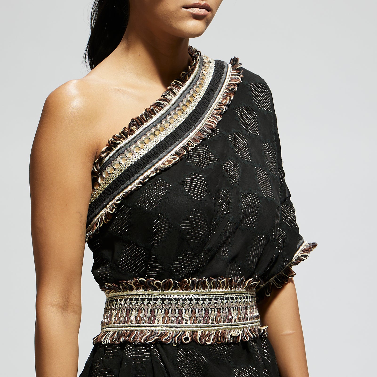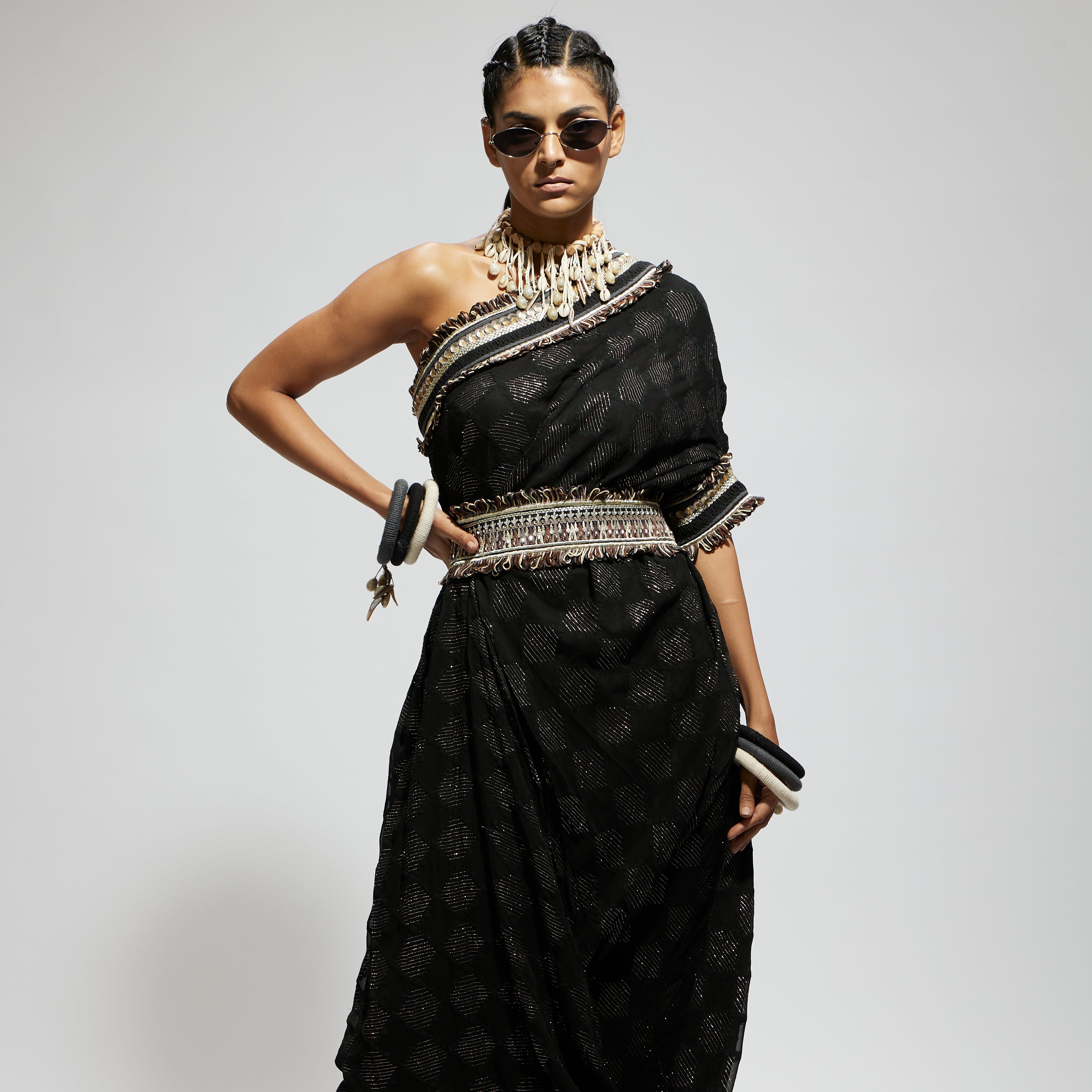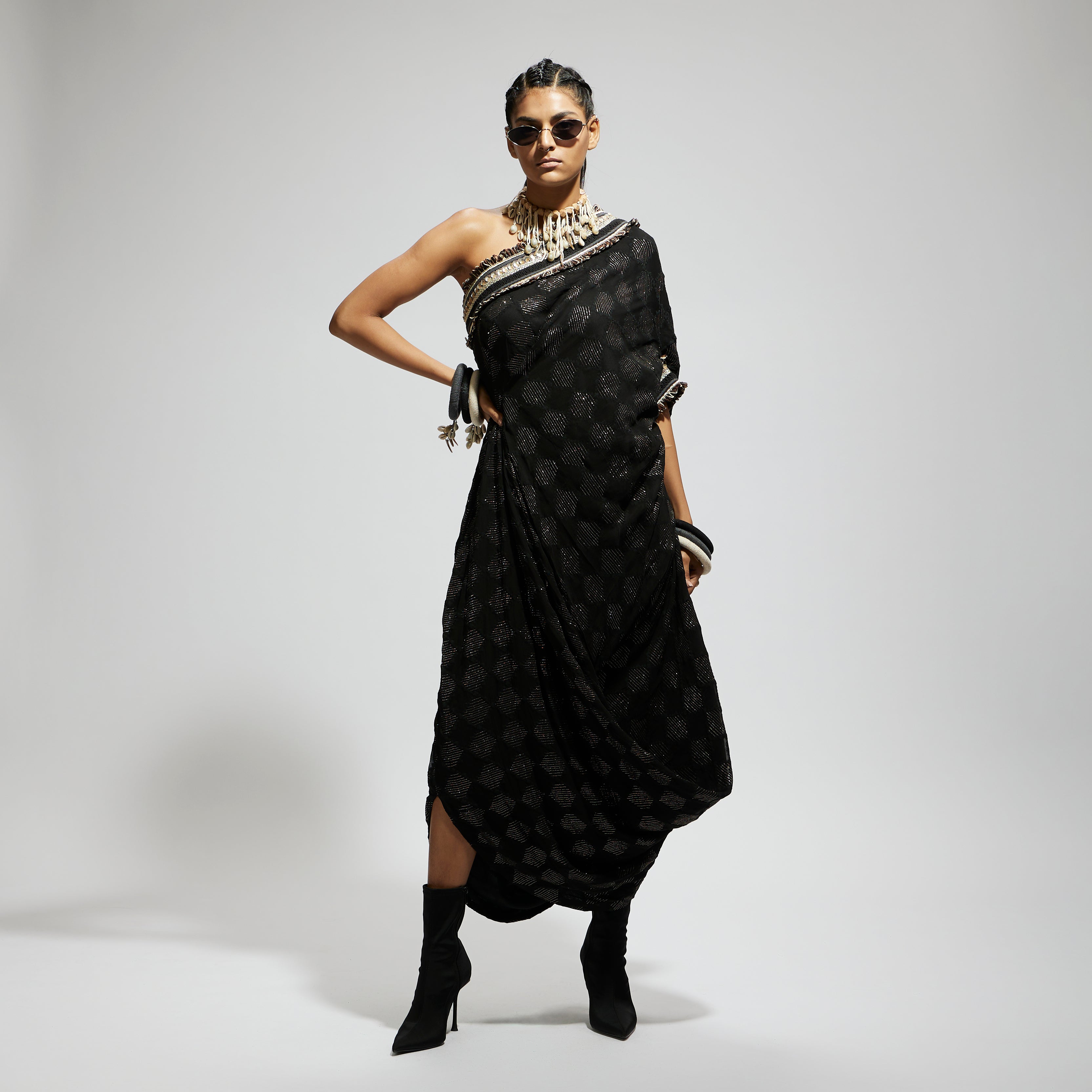 BLACK AZTEC ONE SHOULDER COWL DRESS WITH CUFF