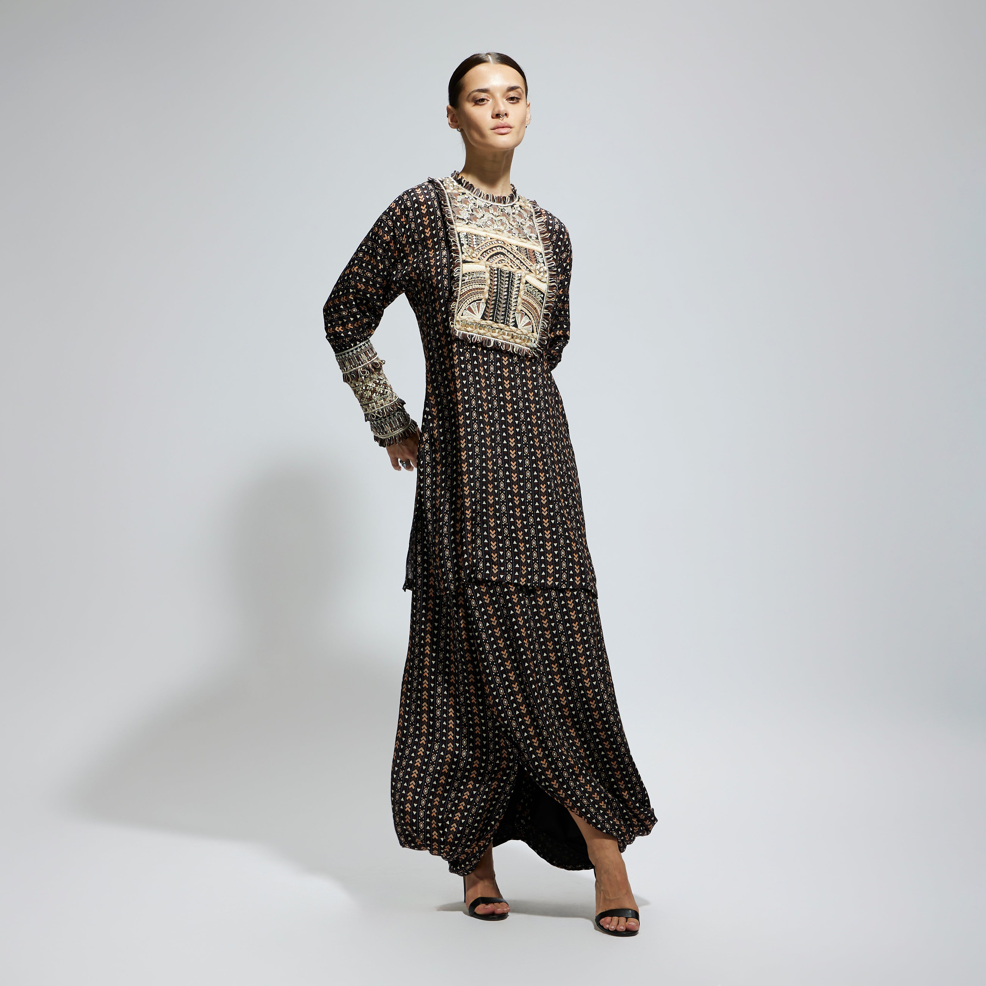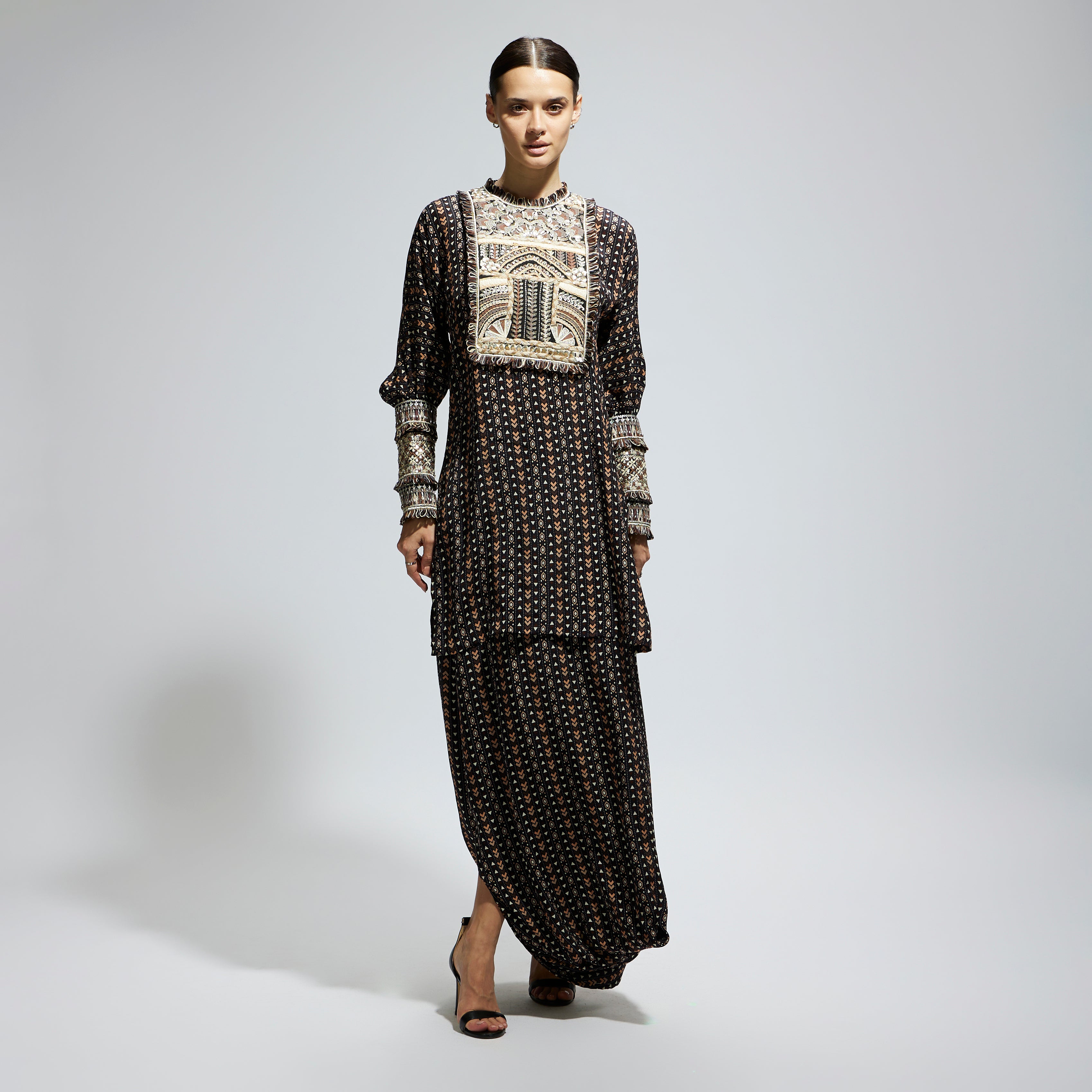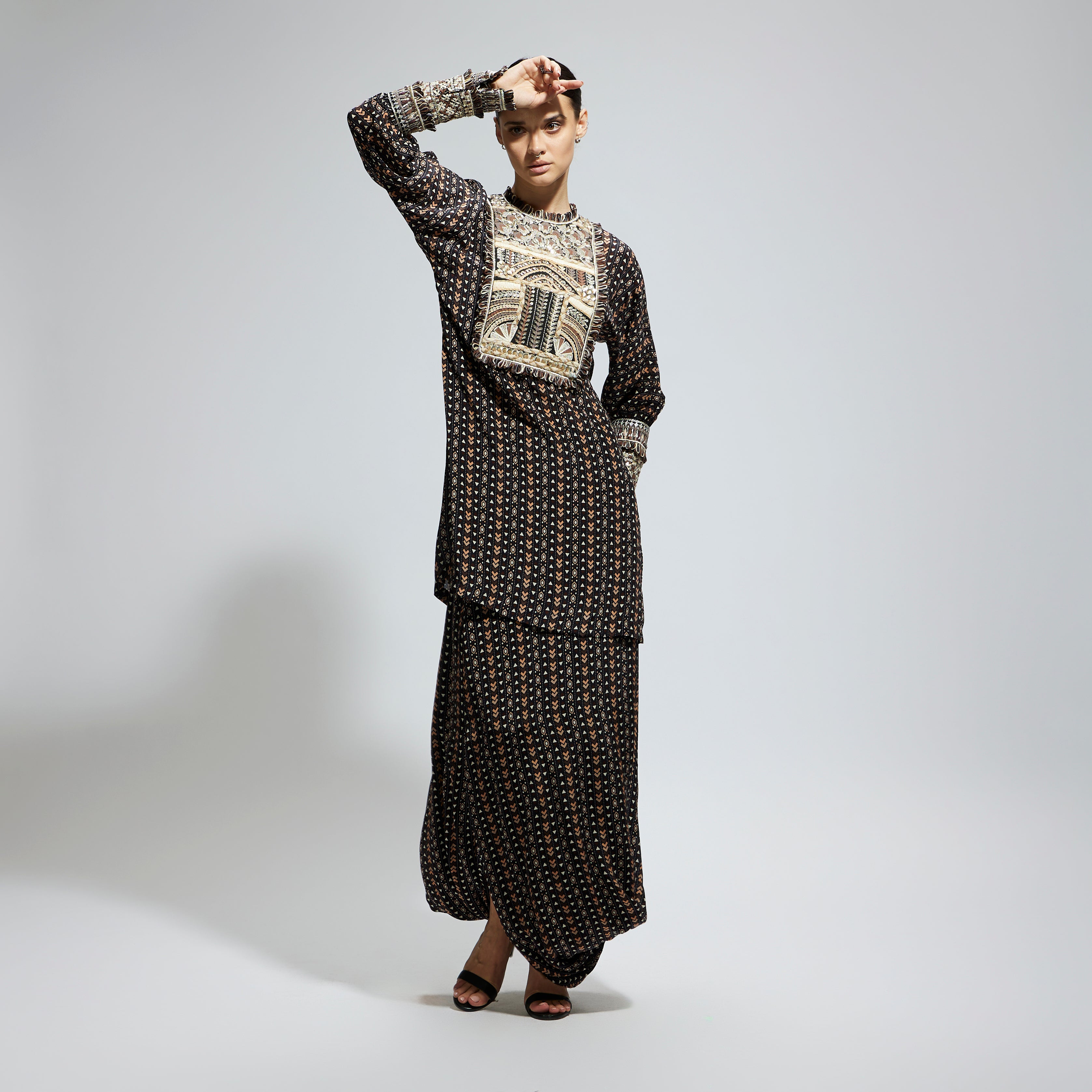BLACK BOHO PRINTED YOKE EMBROIDERED KURTA WITH DRAPE SKIRT