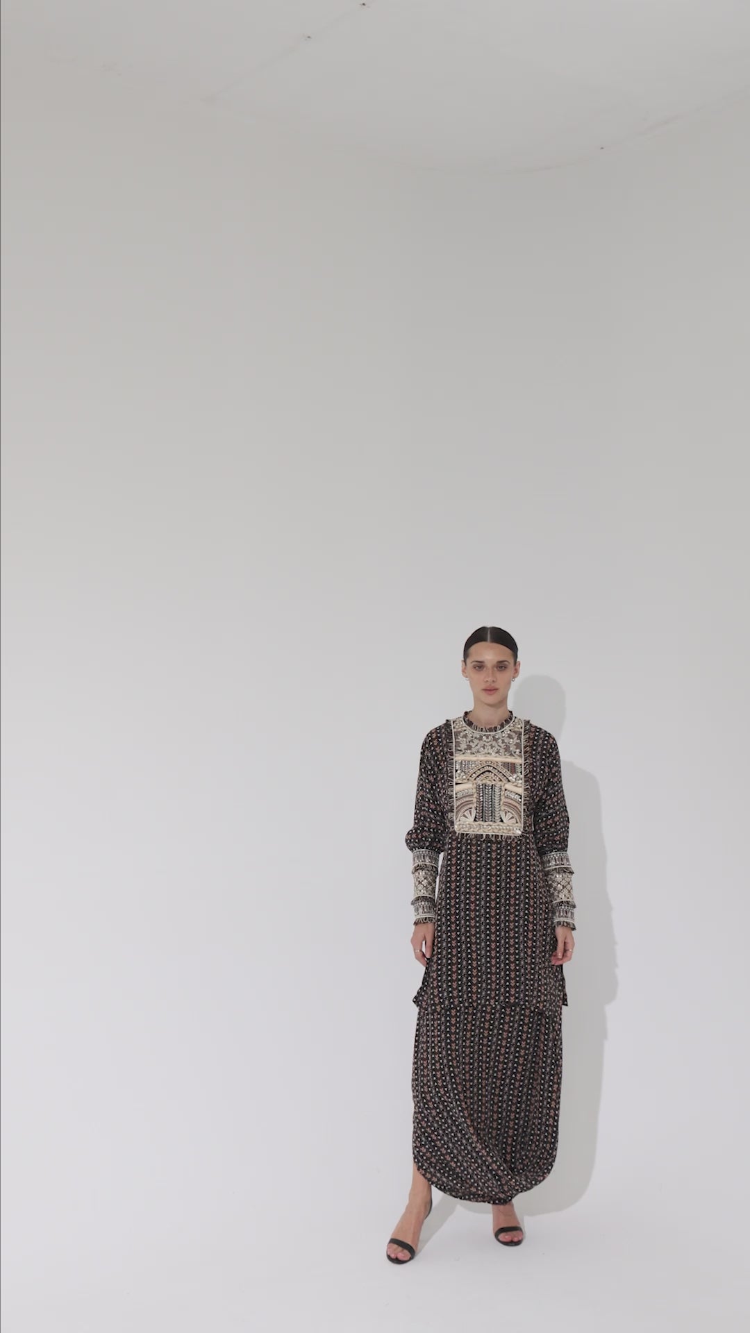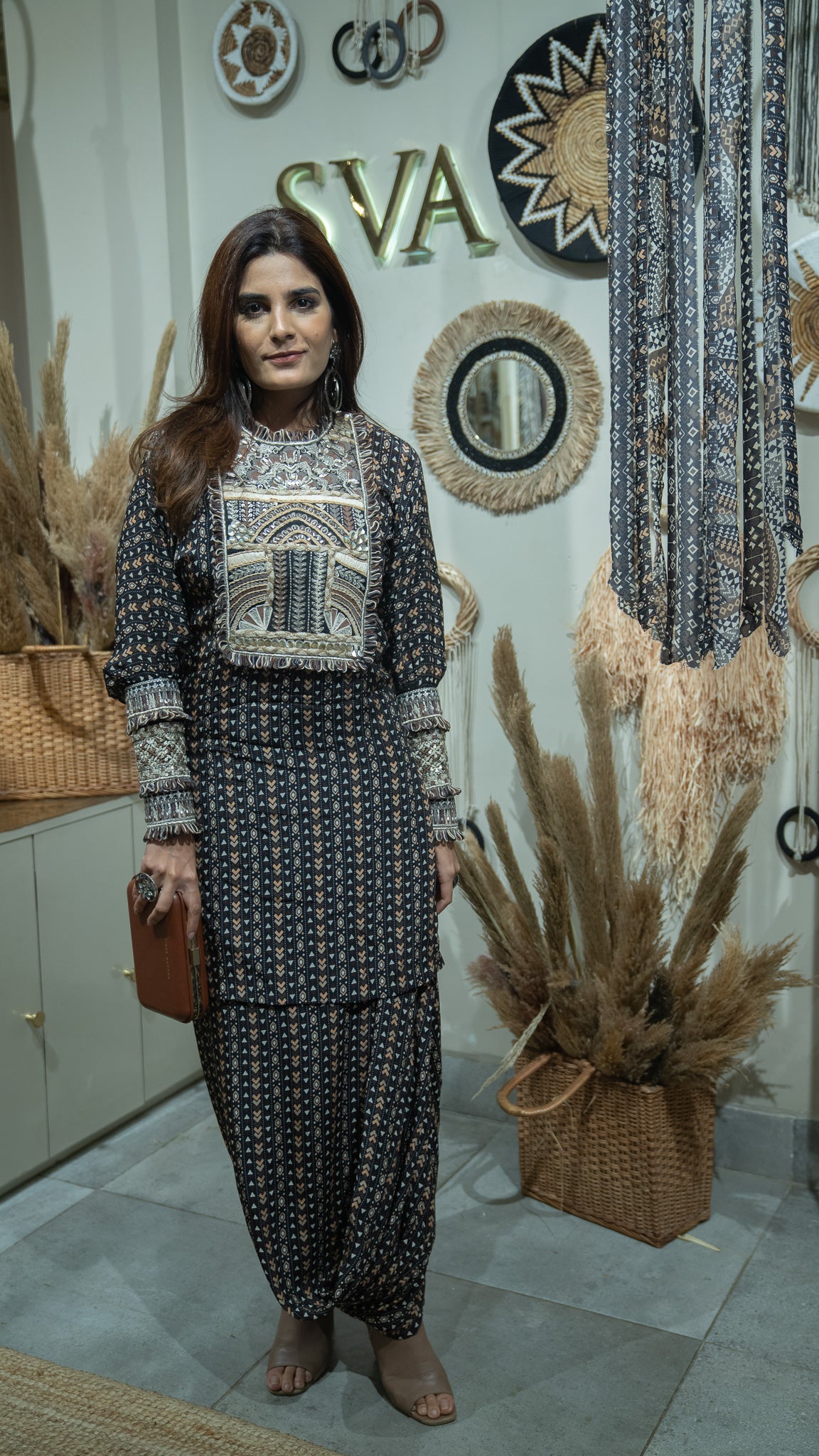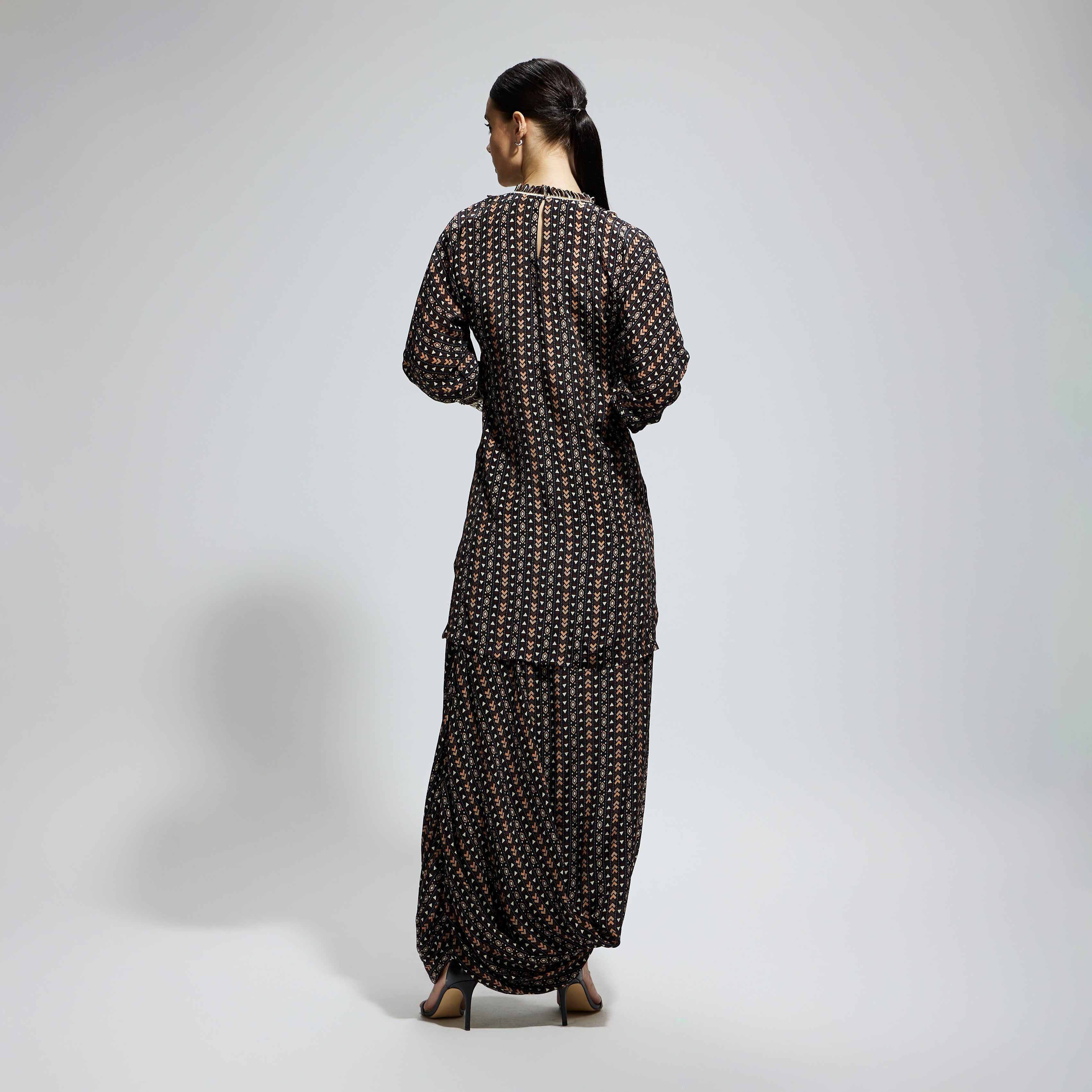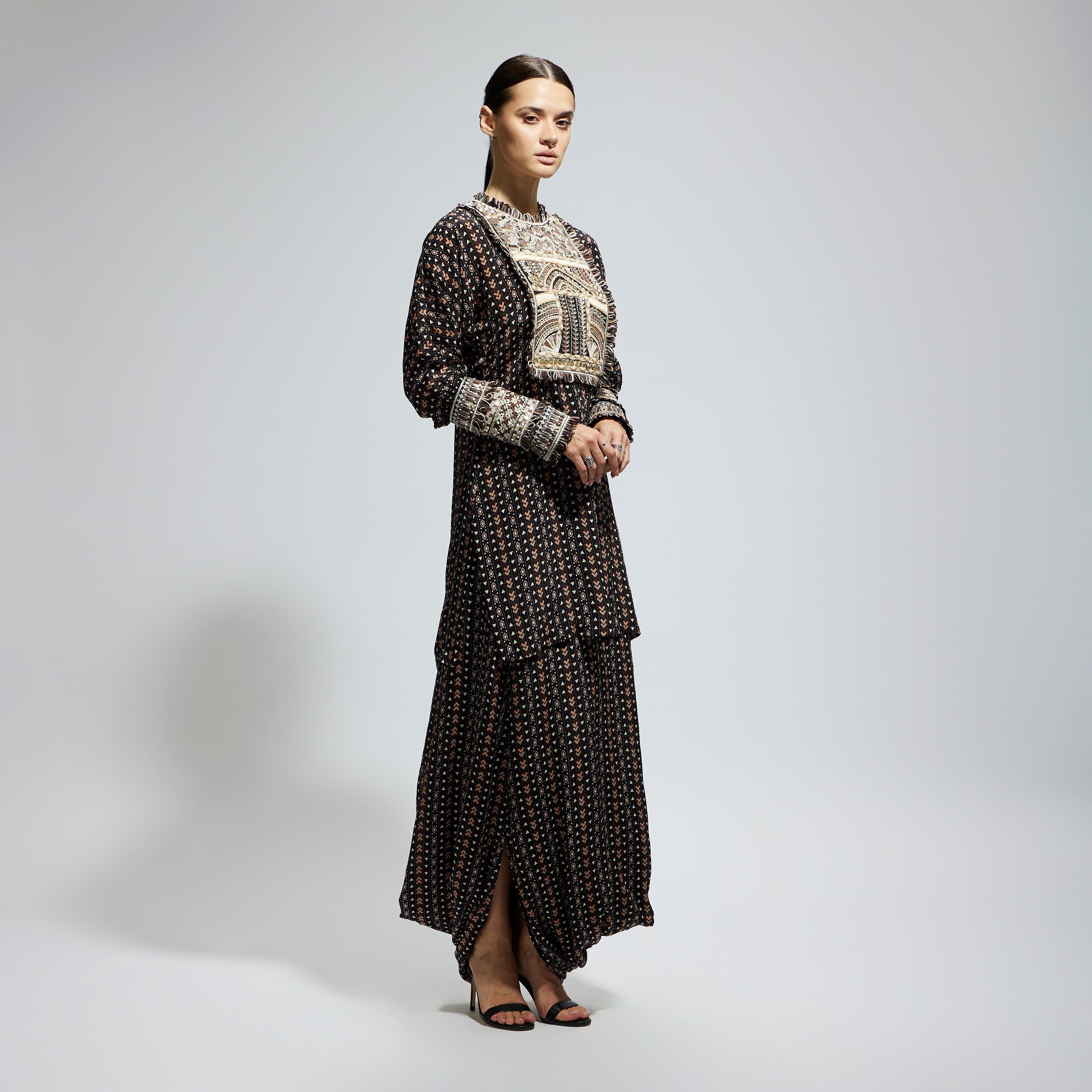 BLACK BOHO PRINTED YOKE EMBROIDERED KURTA WITH DRAPE SKIRT