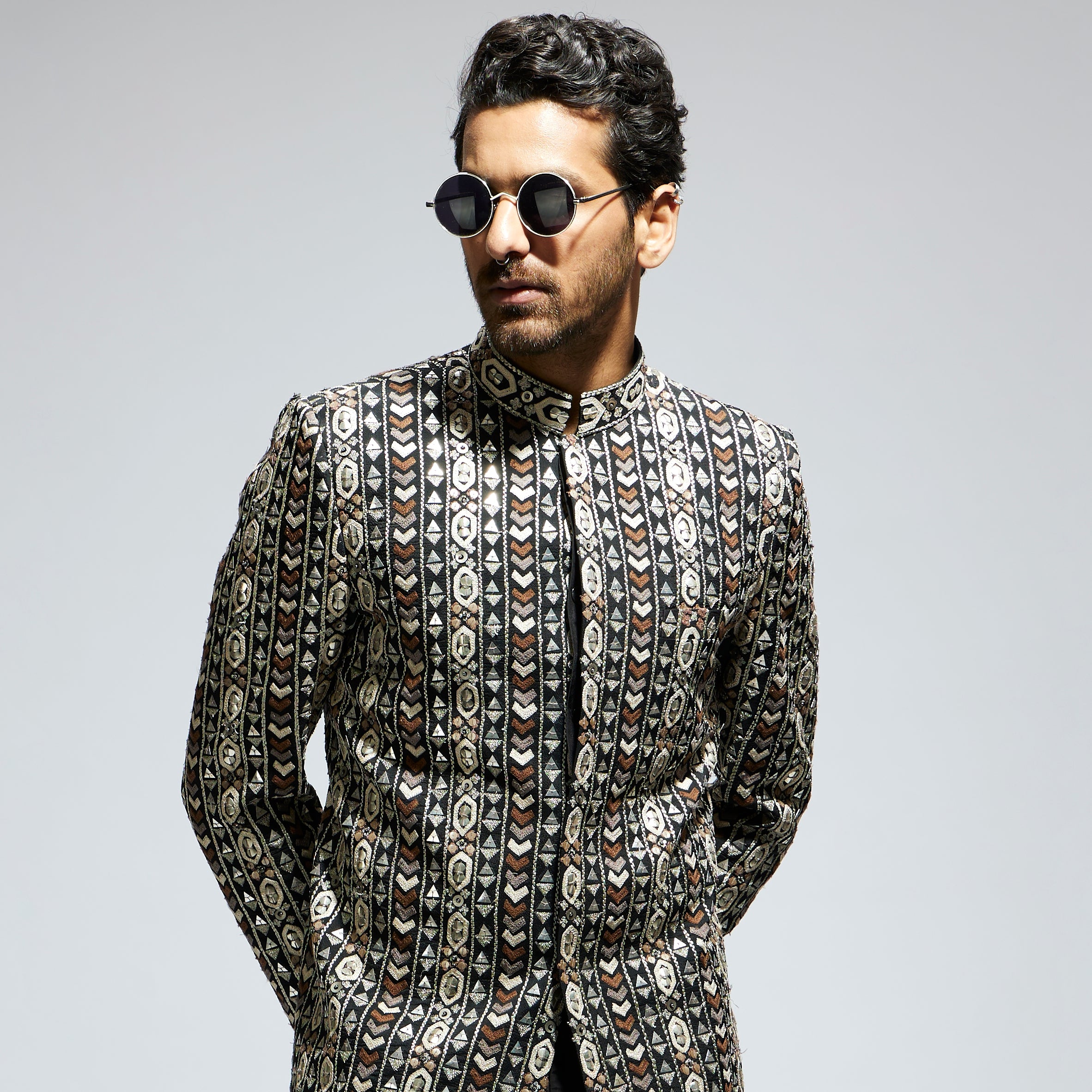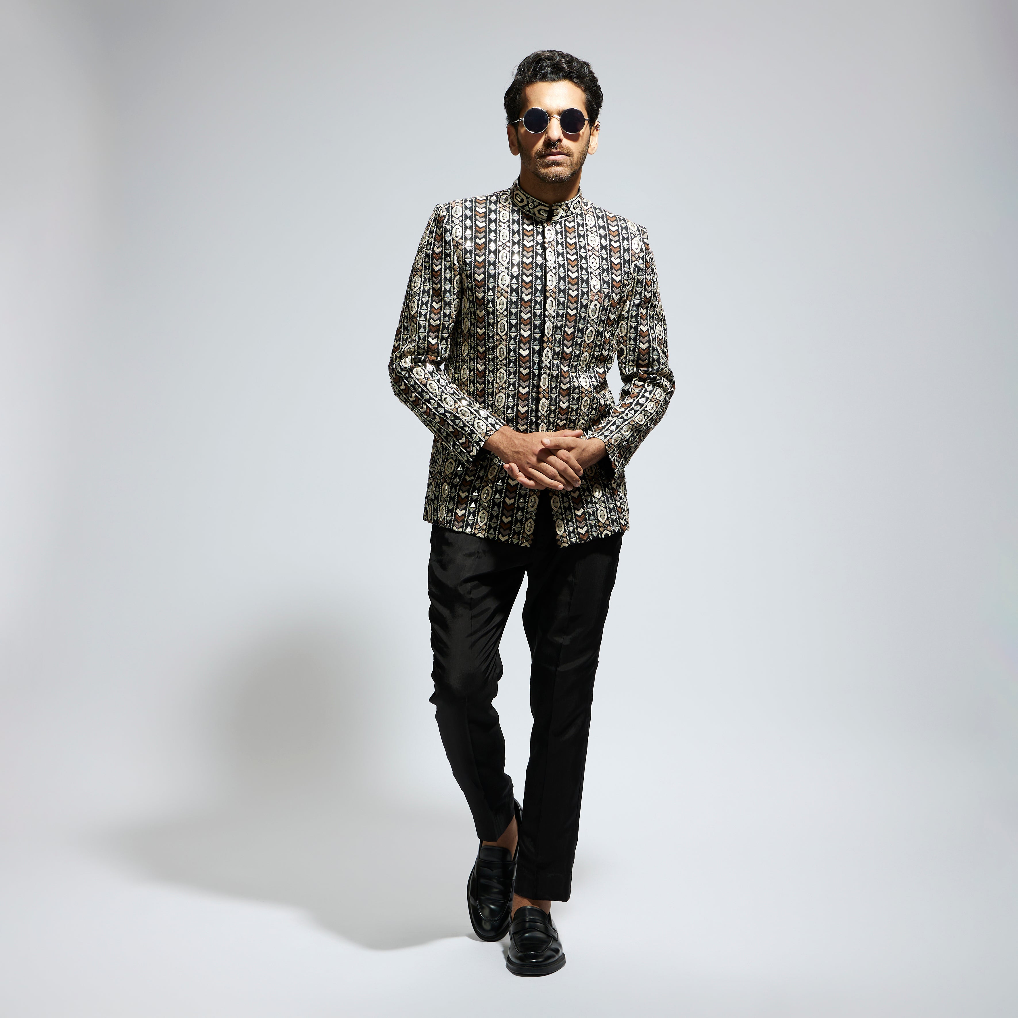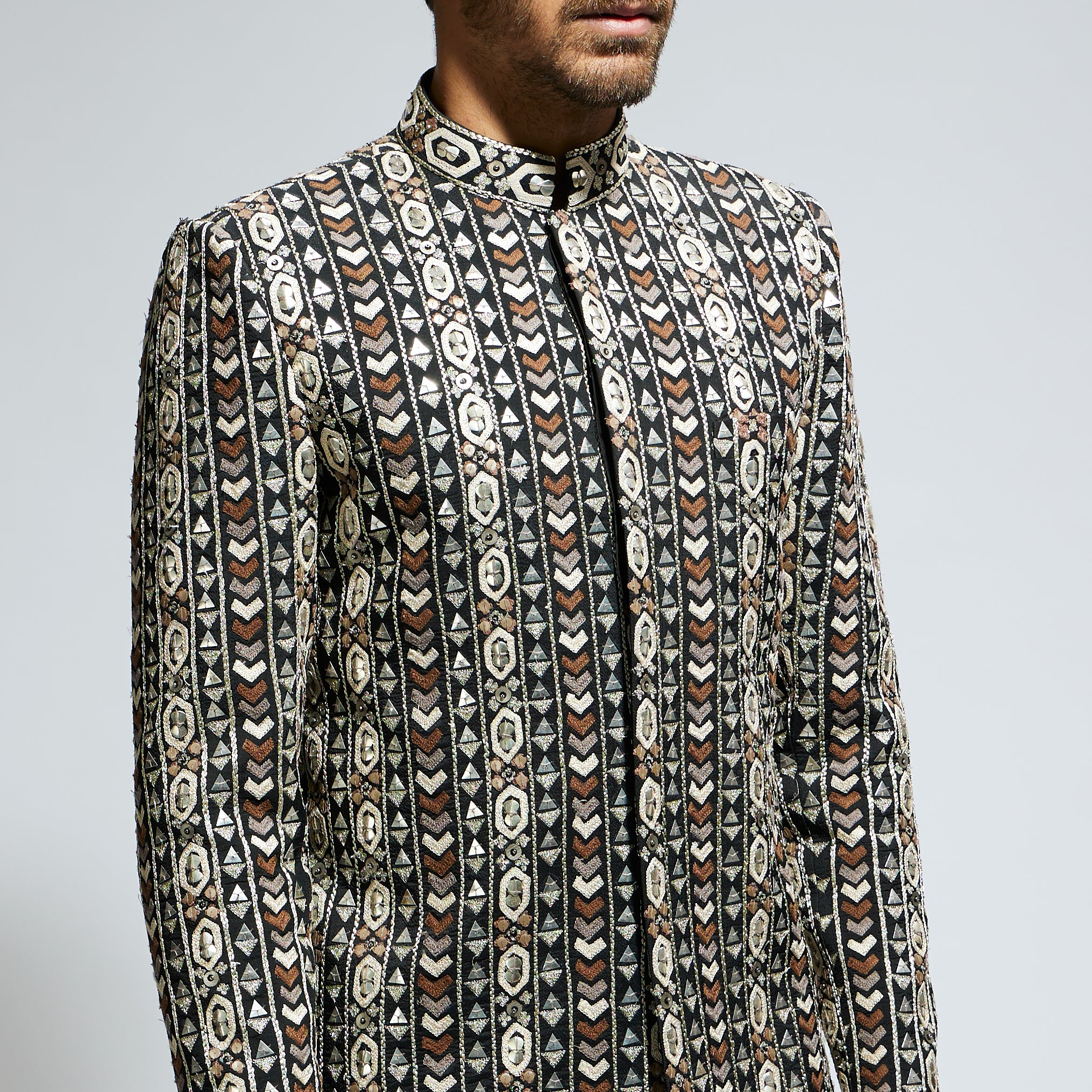 Featuring a black geo embroidered bandhgala, fabric habutai, and Component 1.