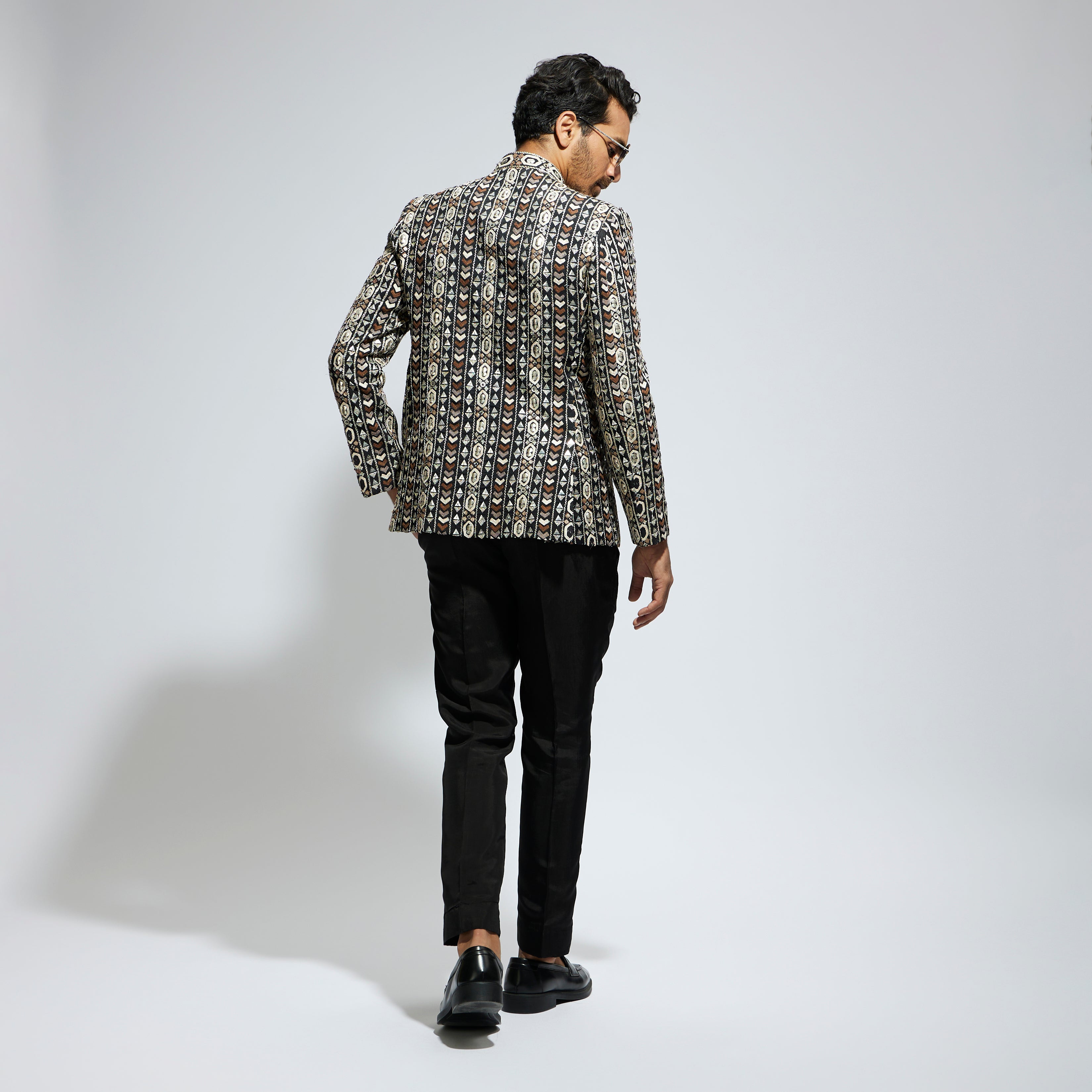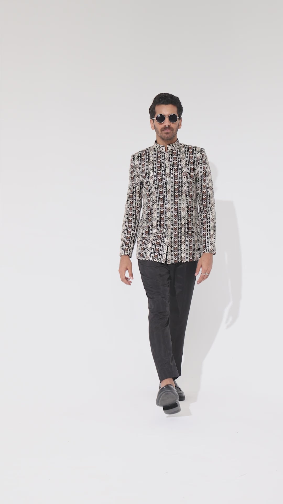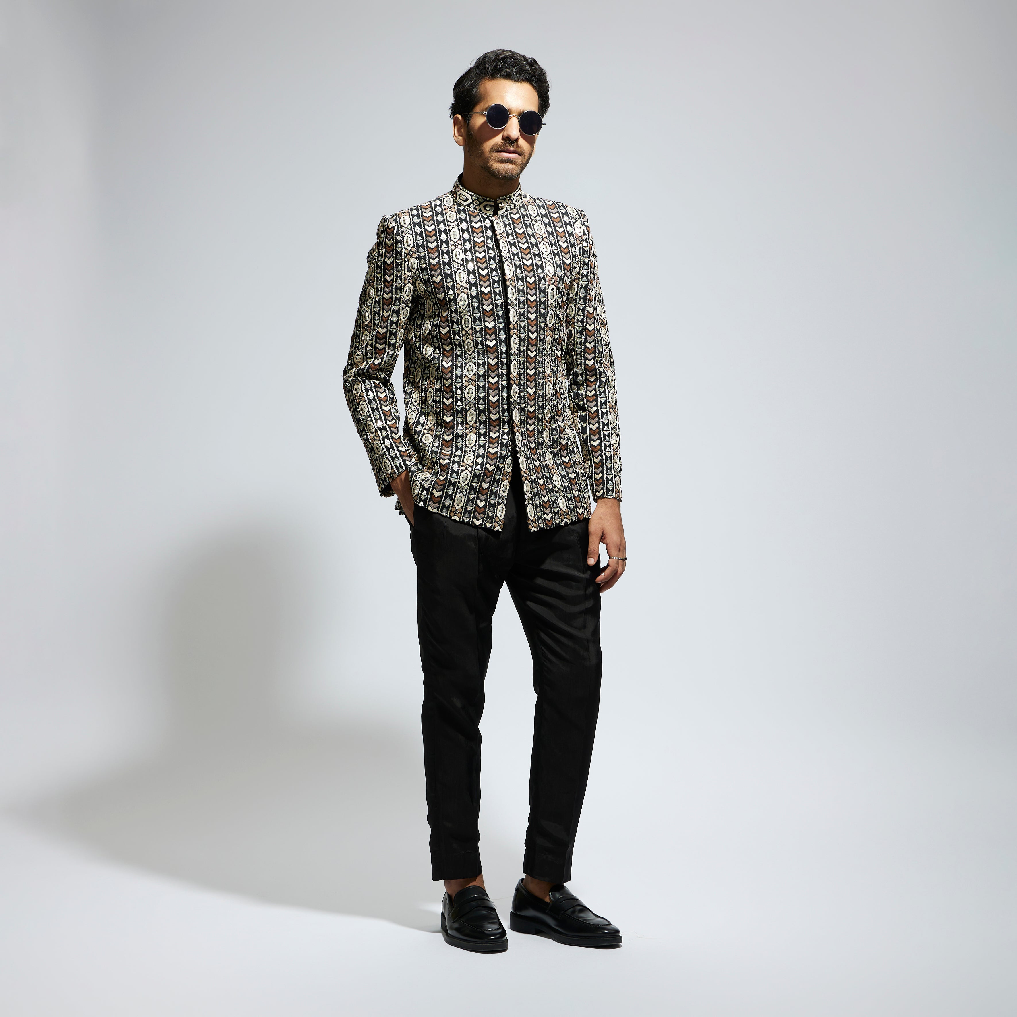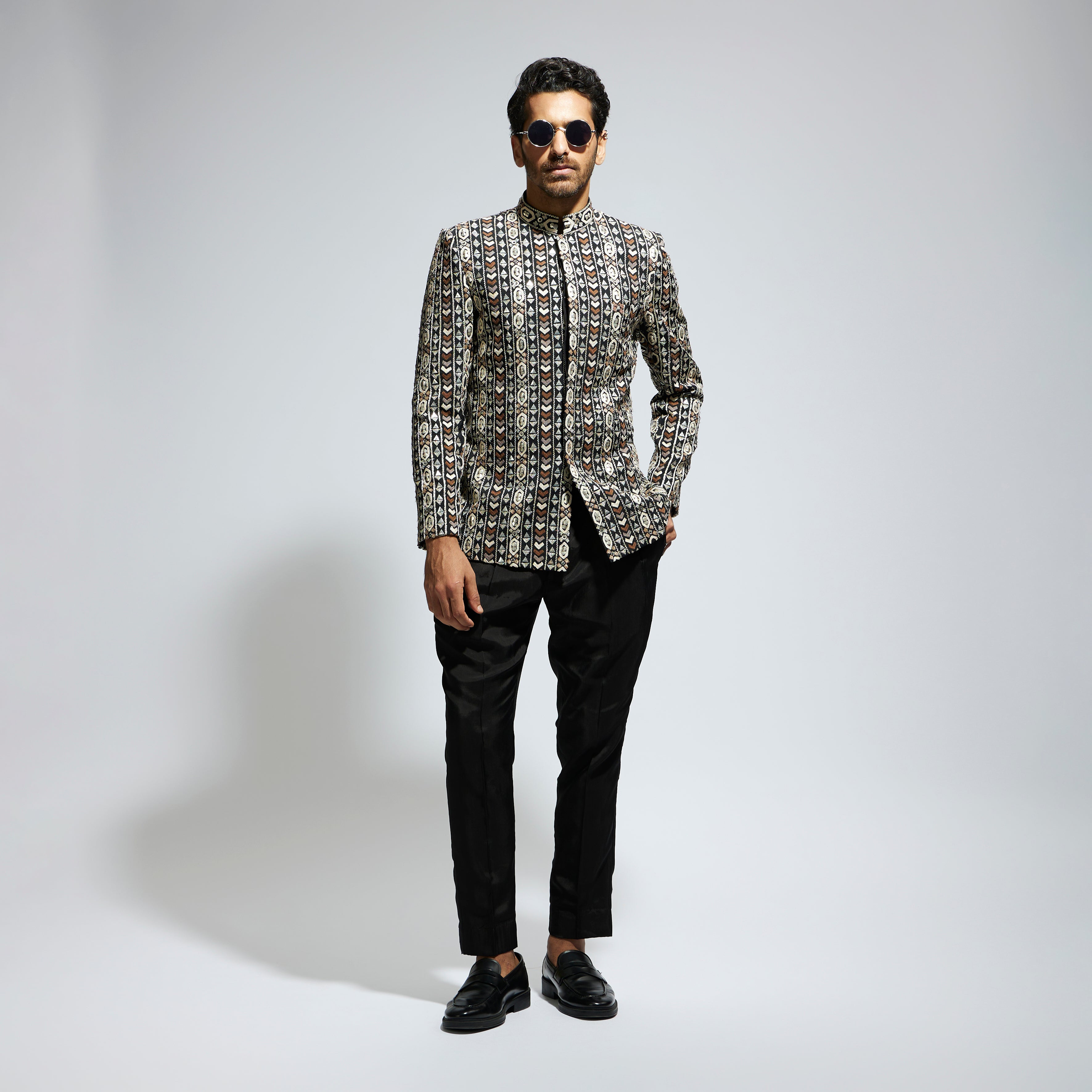 Featuring a black geo embroidered bandhgala, fabric habutai, and Component 1.