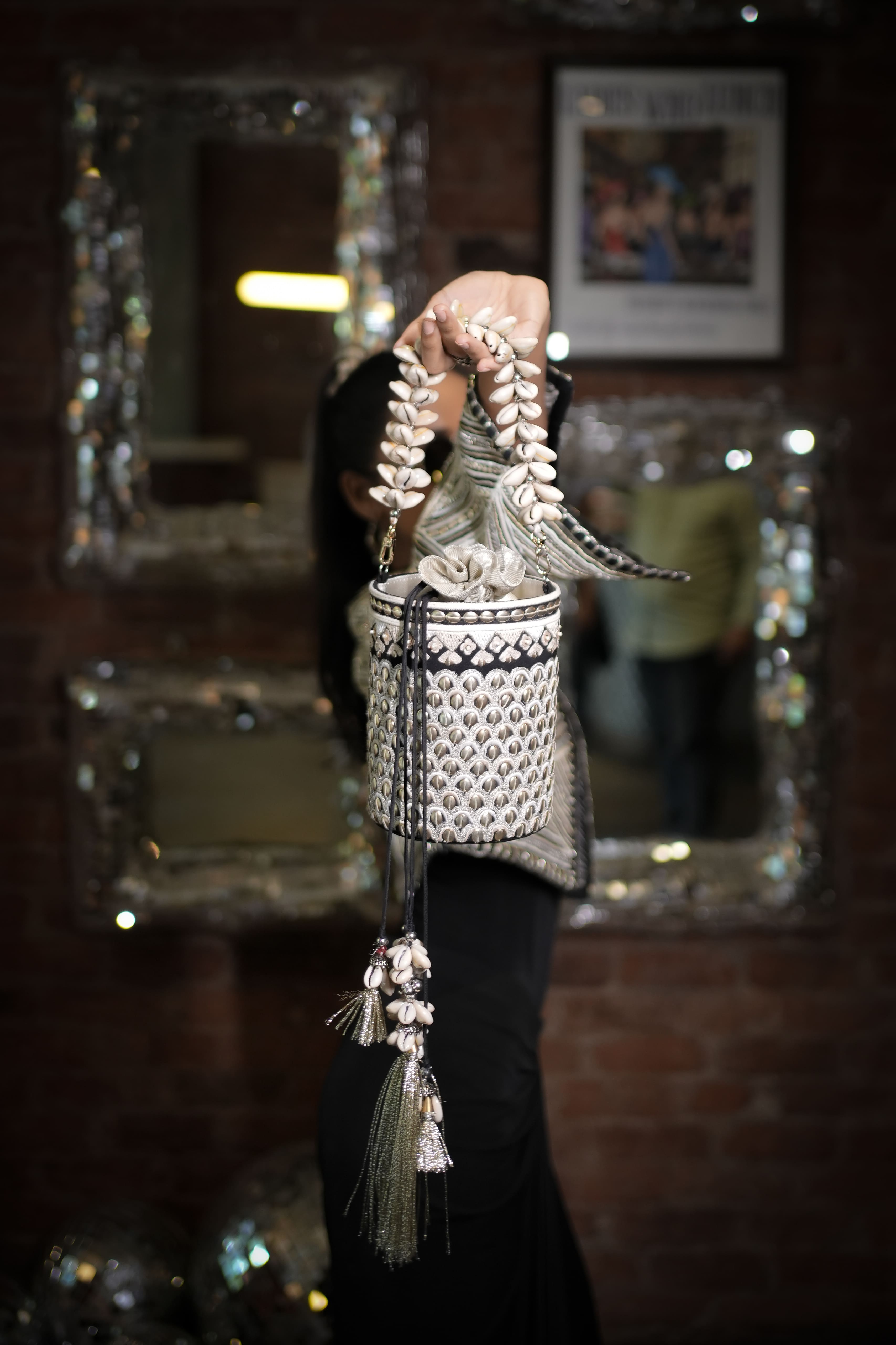 This striking, handcrafted bucket bag is a beautiful fusion of natural elements and artisanal design. The cylindrical body of the bag is heavily adorned with cowrie shells, giving it a rich, textured, and distinctly bohemian/ethnic appeal.