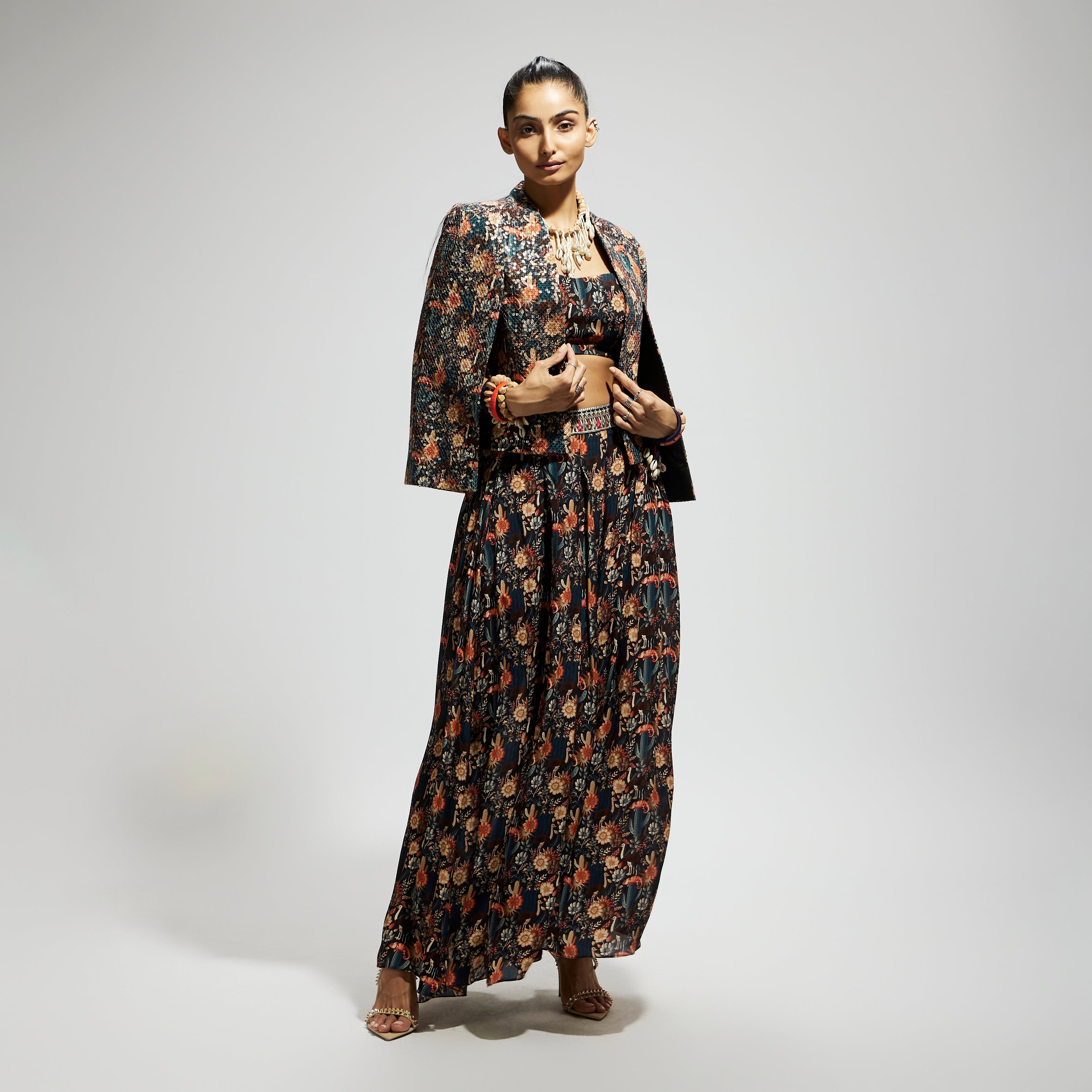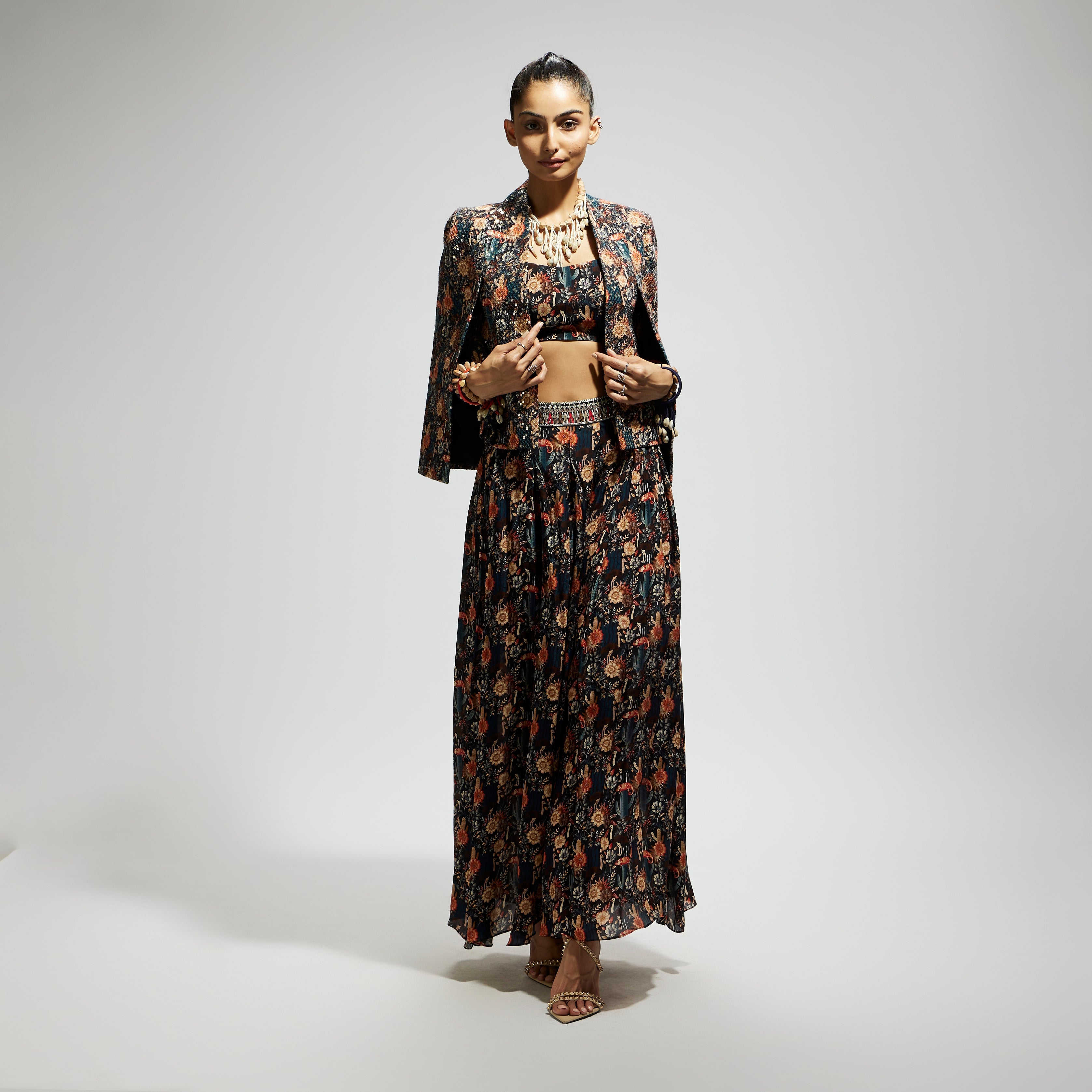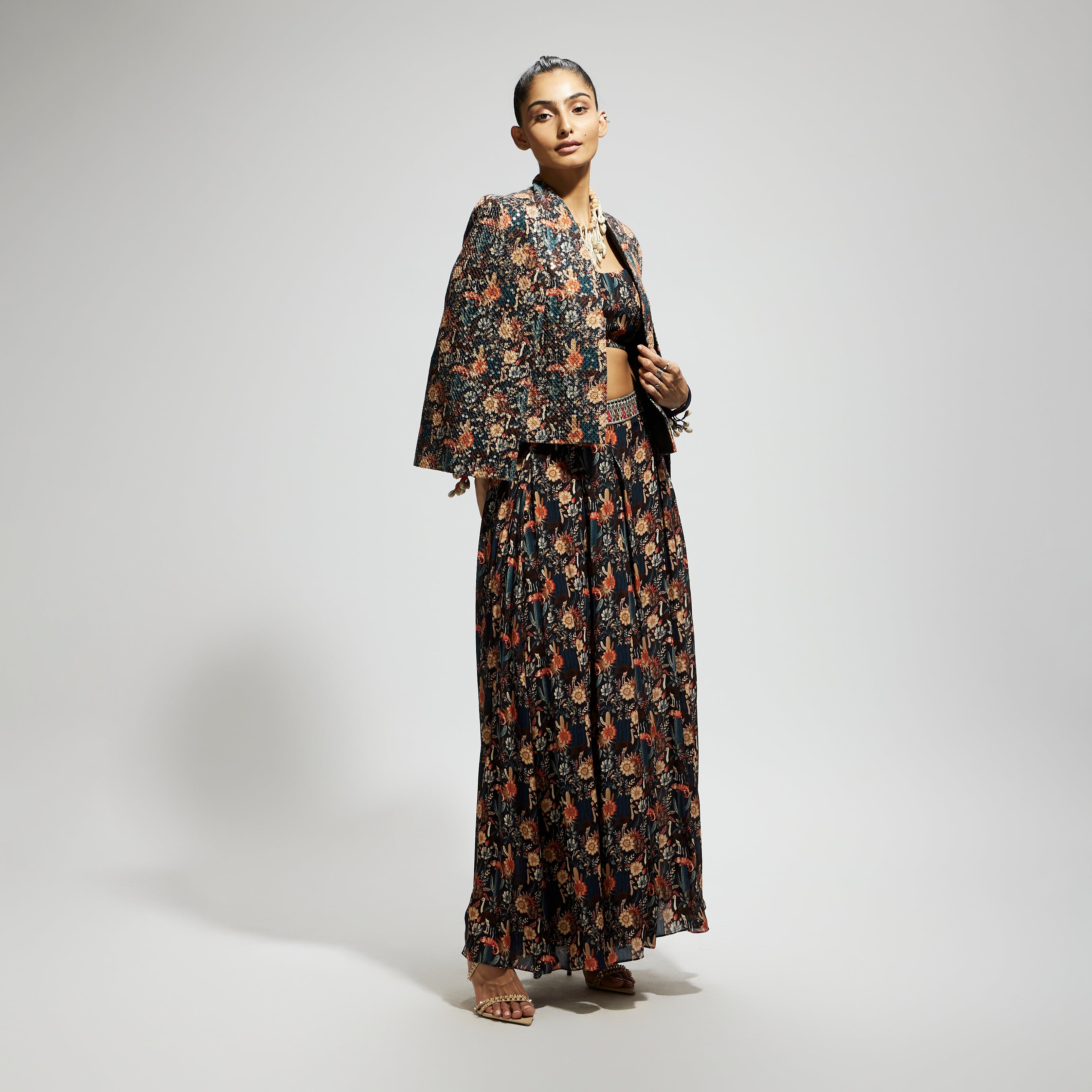 Featuring a black jaal cape with sequin jacket set, crepe fabric, and component 2.
