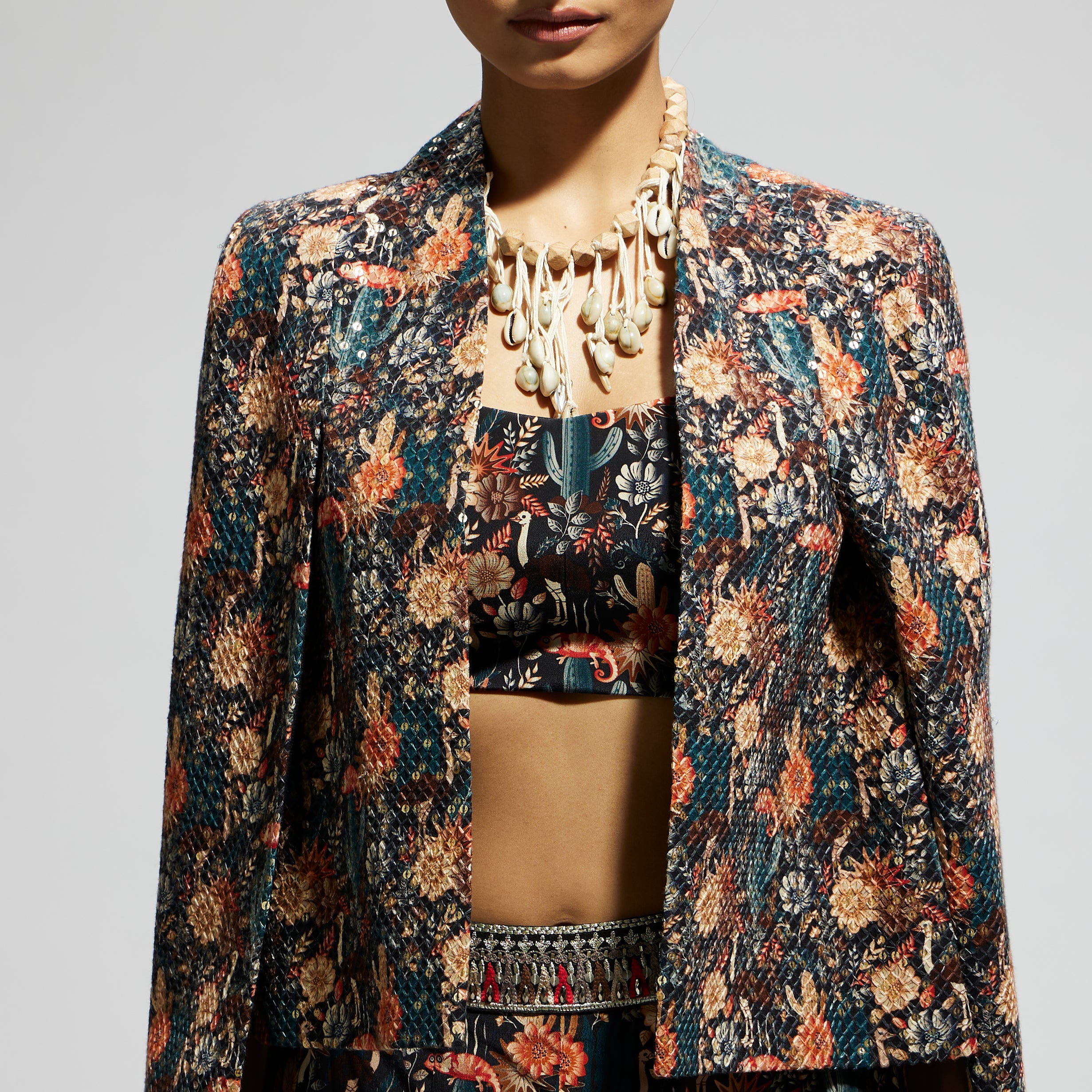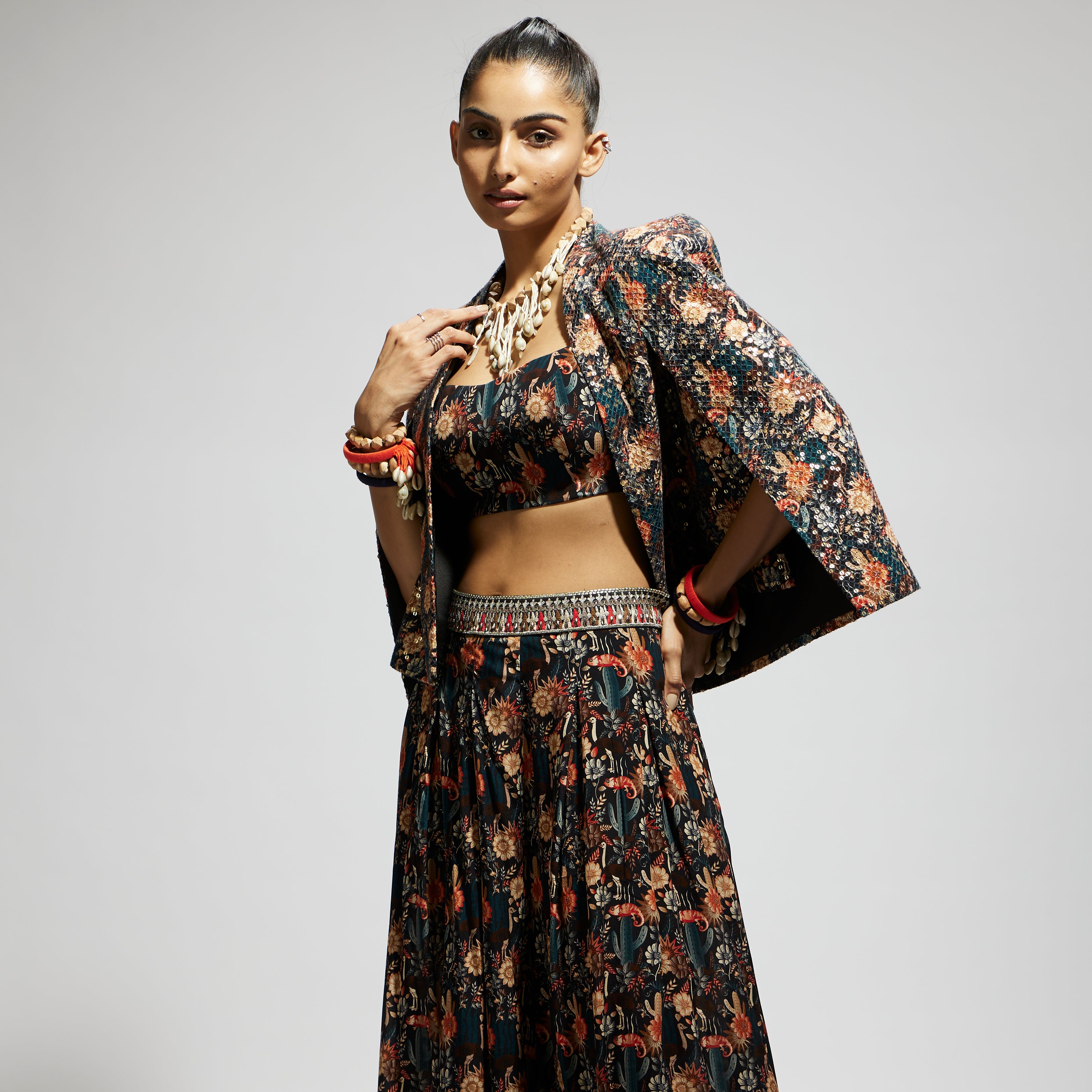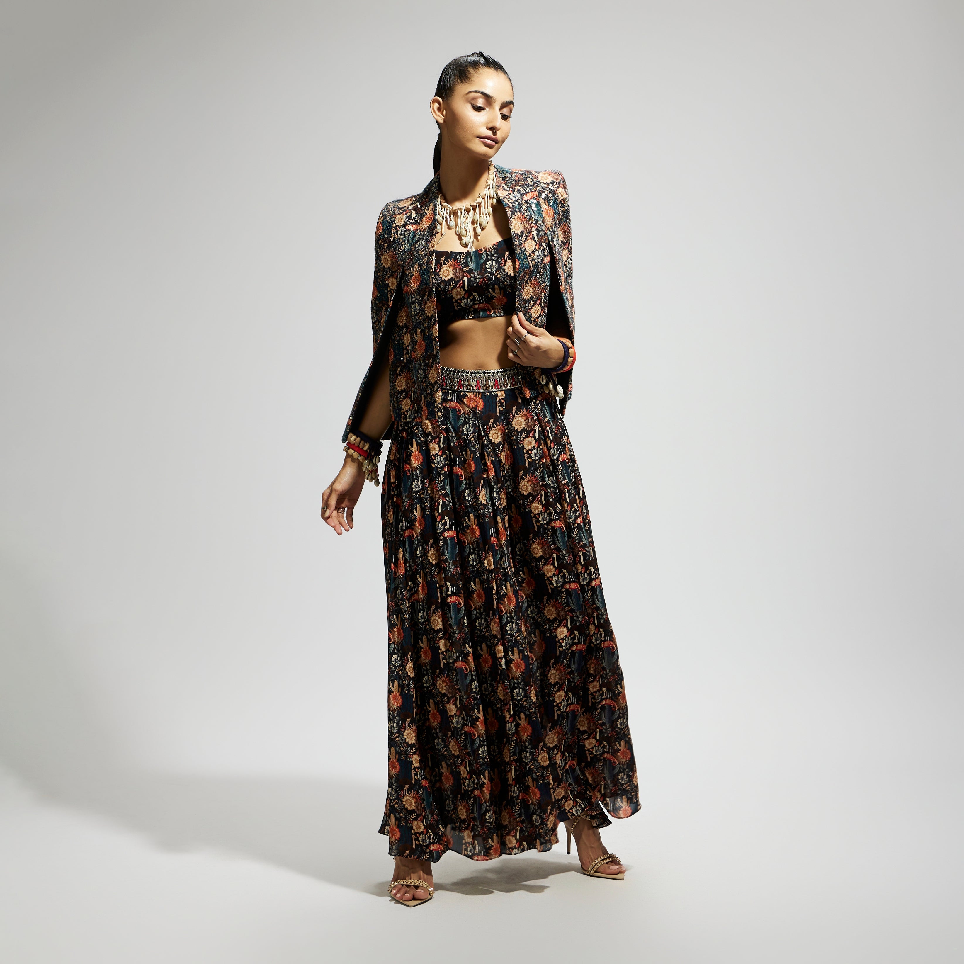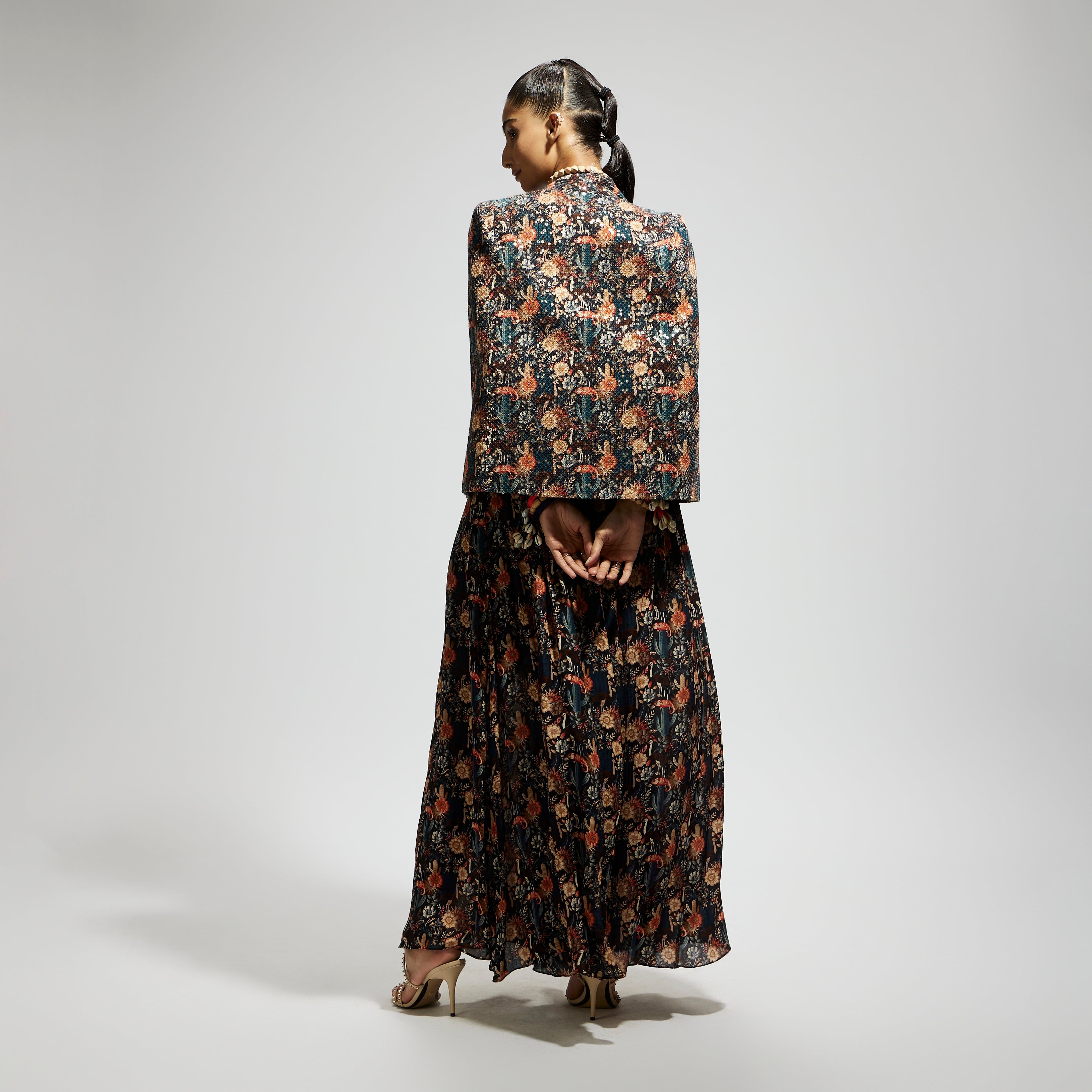 Featuring a black jaal cape with sequin jacket set, crepe fabric, and component 2.