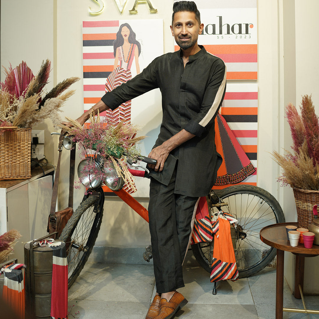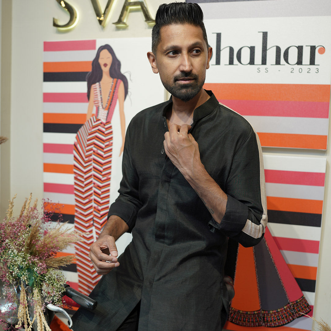 Featuring a black linen kurta with grey stripes on the shoulder teamed with pants