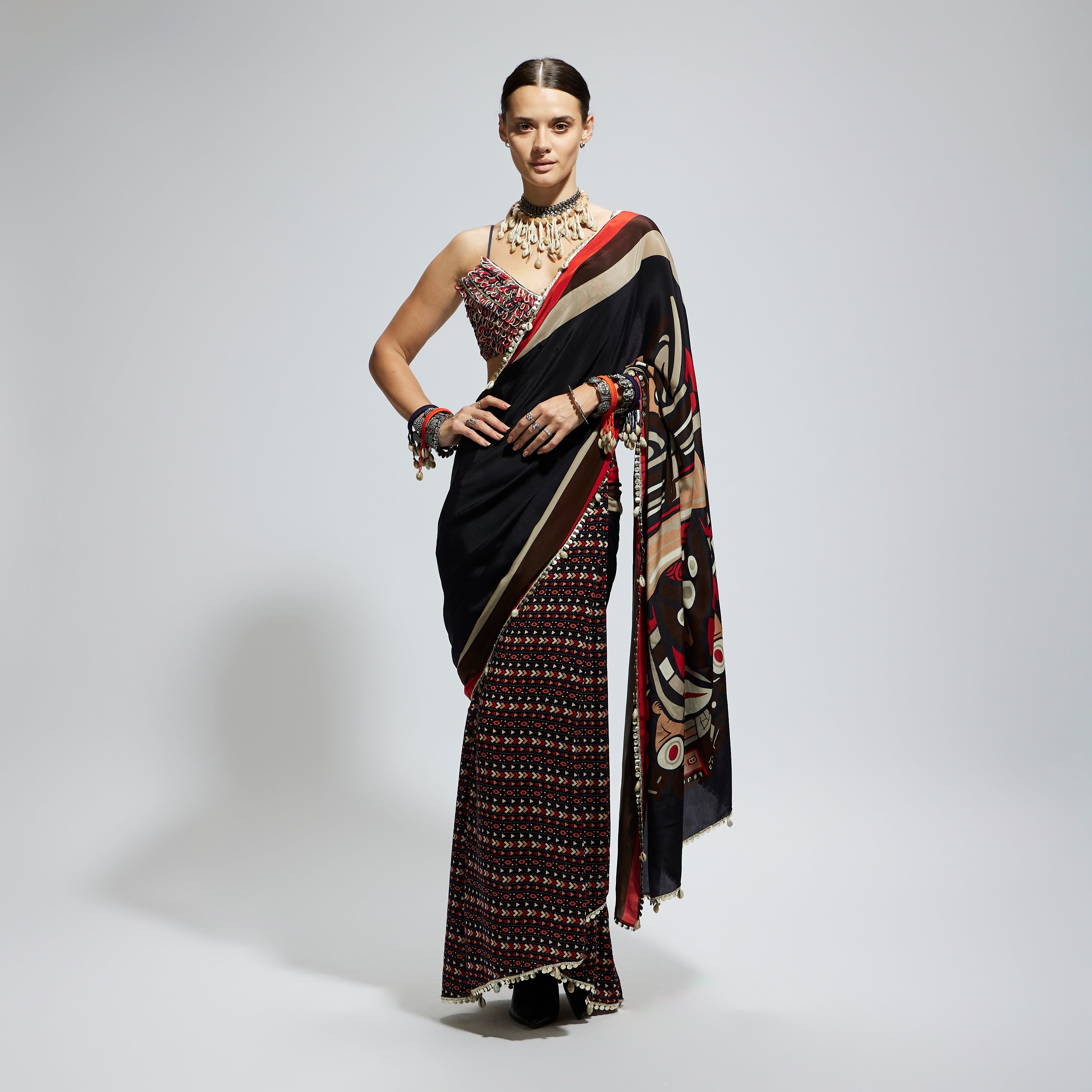 SAMSARA BLACK MASK PRINT CASCADE SAREE WITH TEXTURED BUSTIER