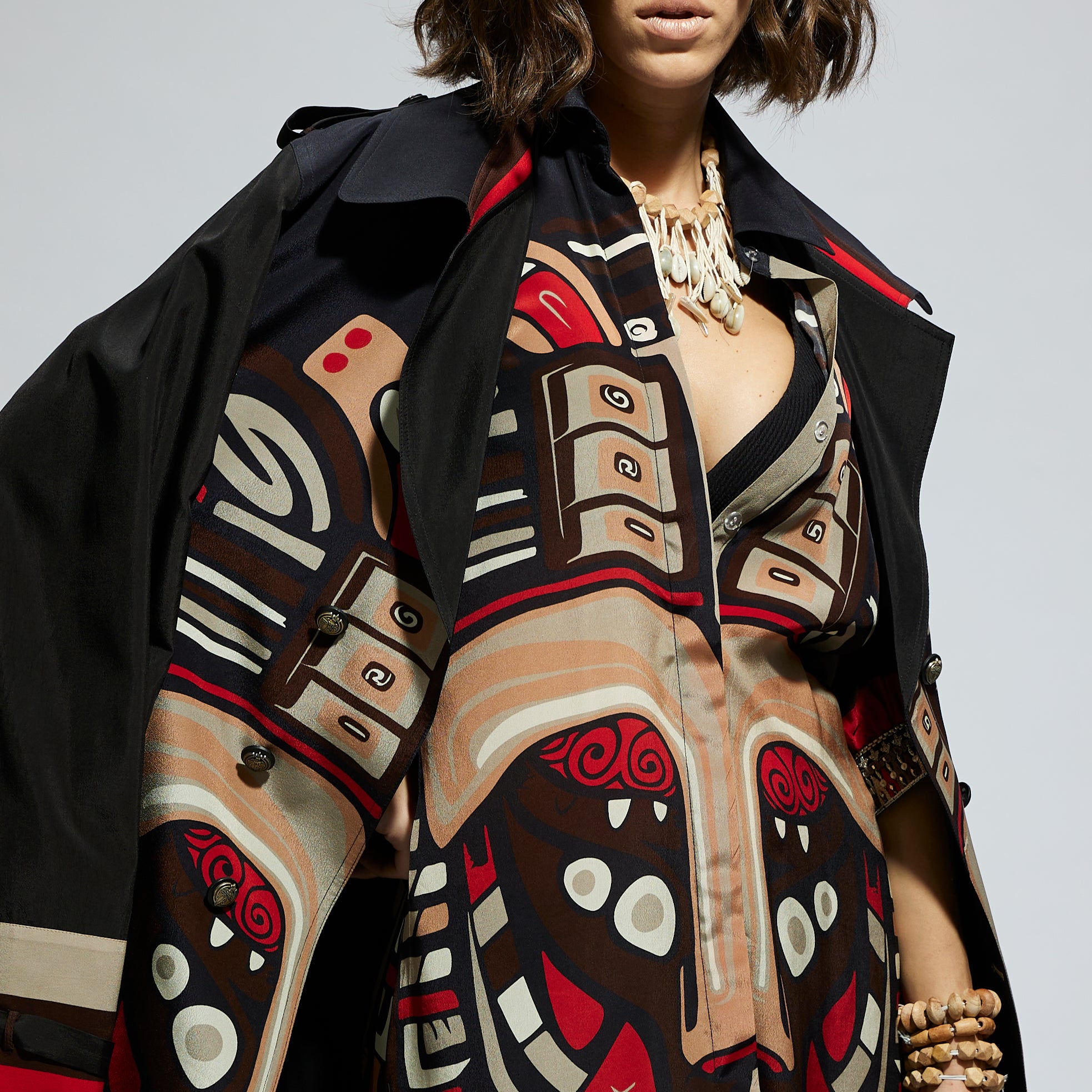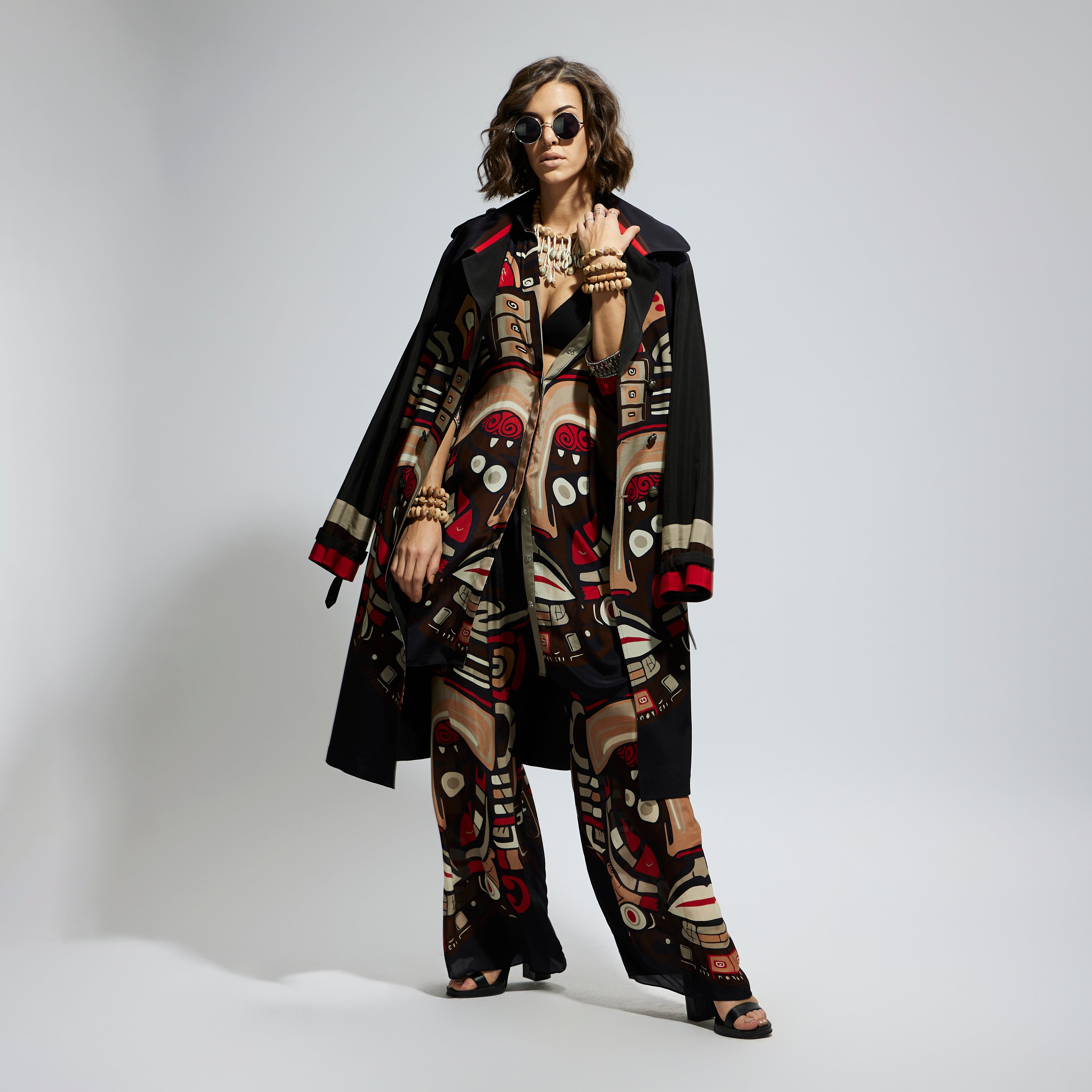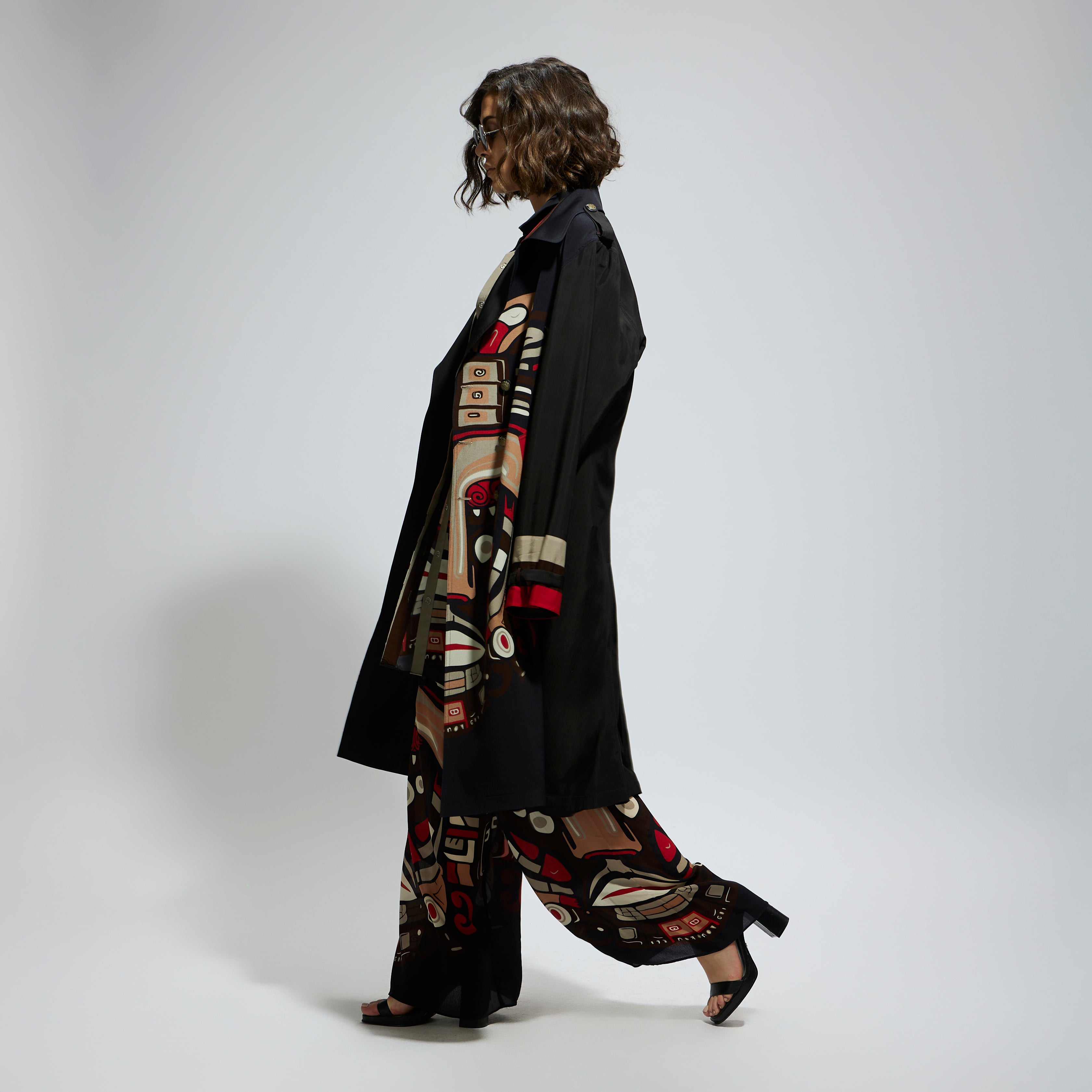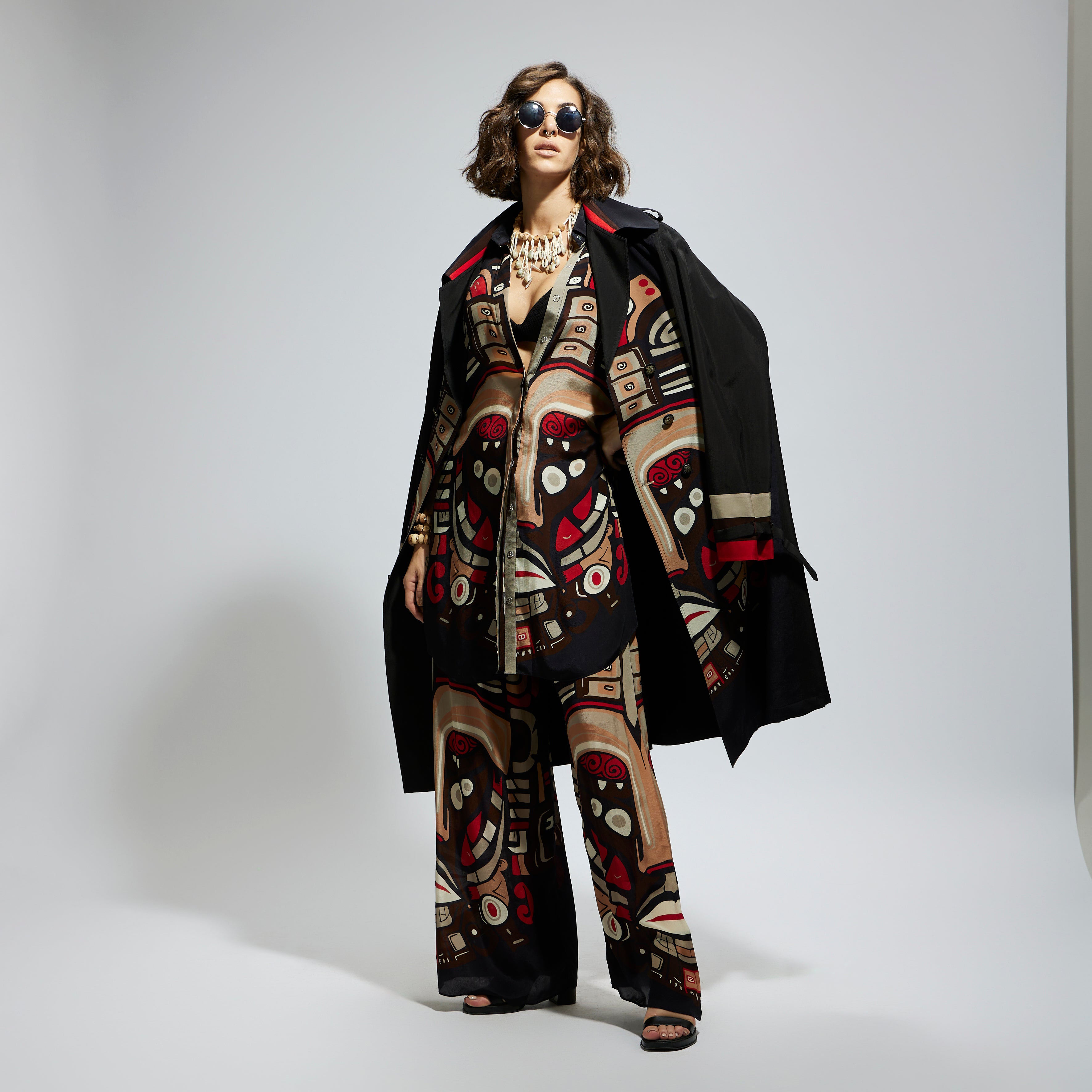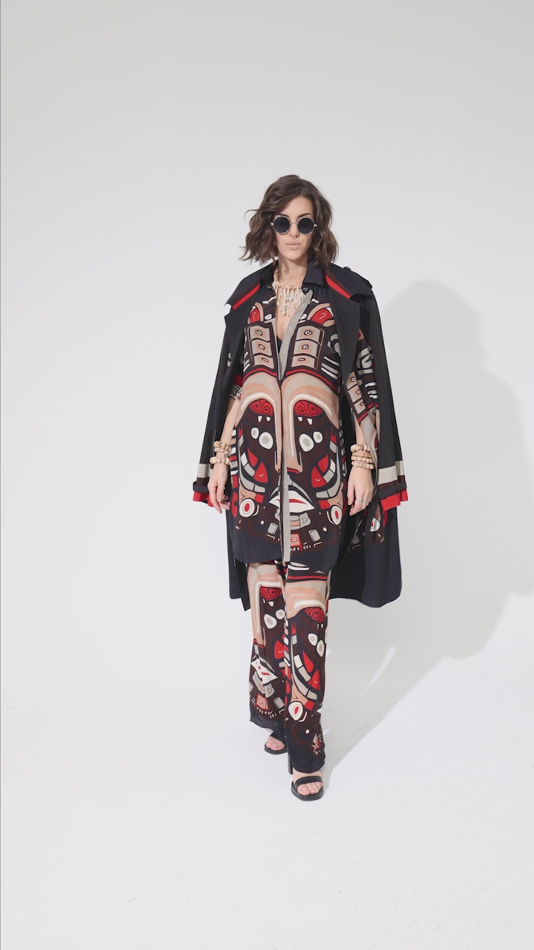 Featuring a black mask print trench coat, fabric Crepe, and Component 1.