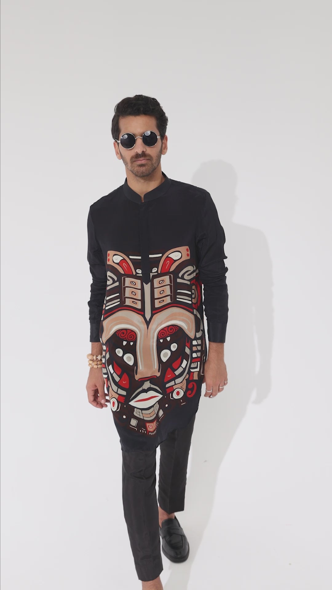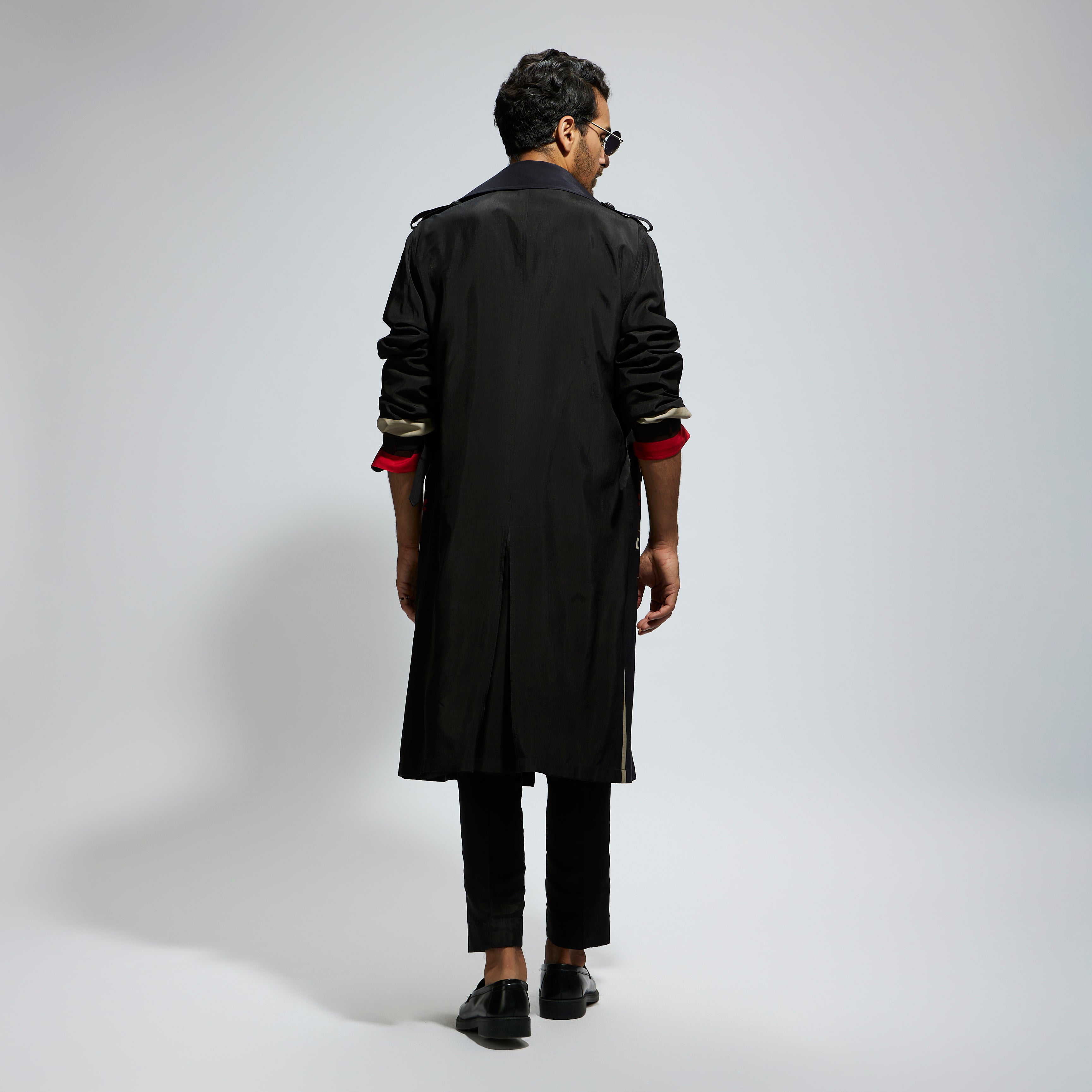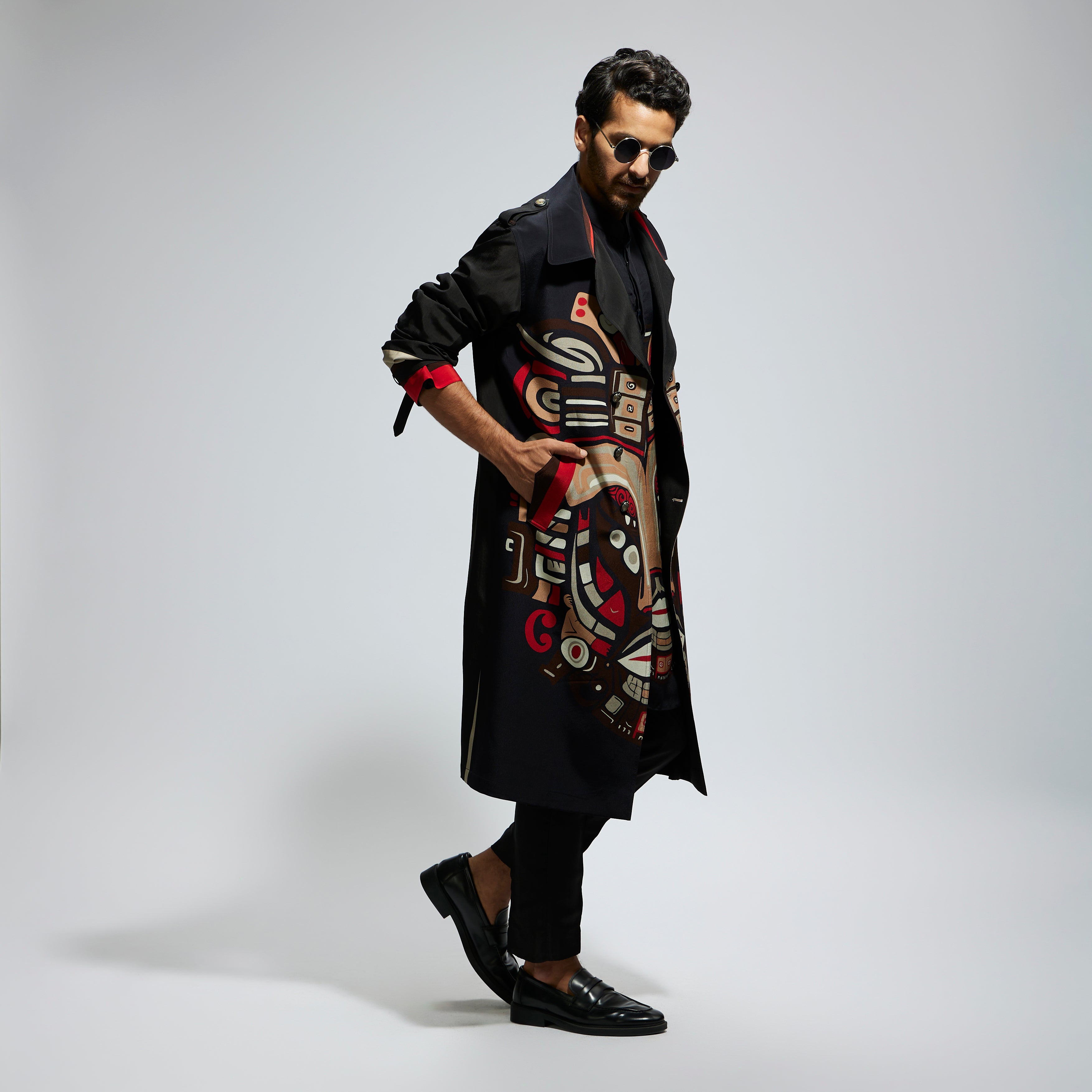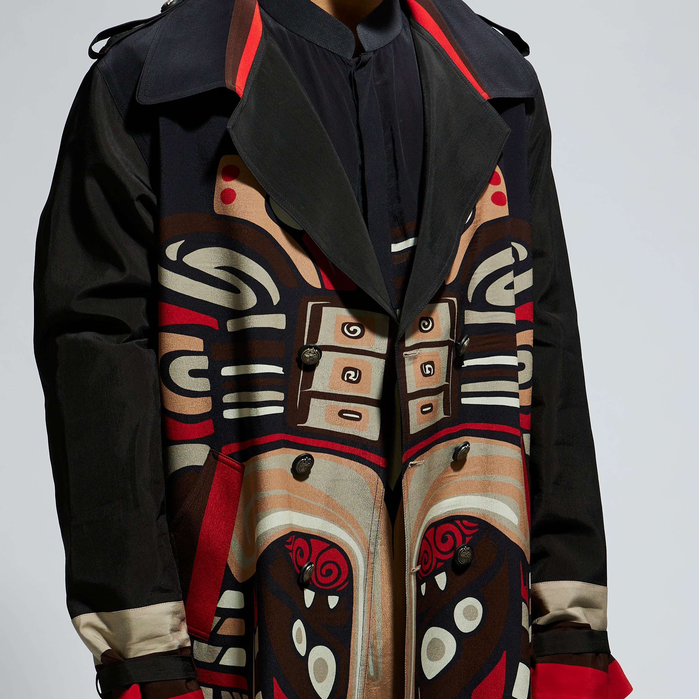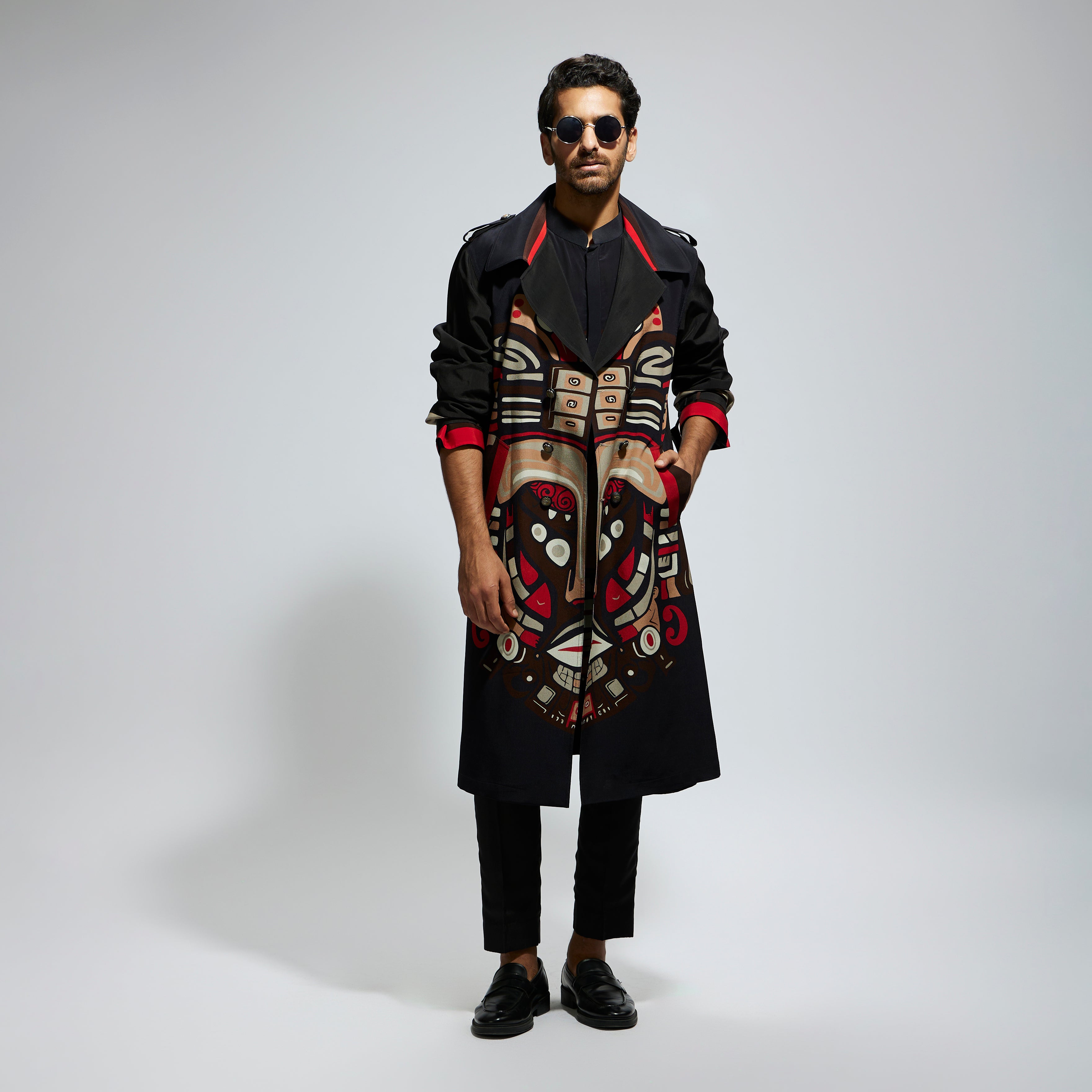 Featuring an black mask print trenchcoat, fabric crepe, component 1.