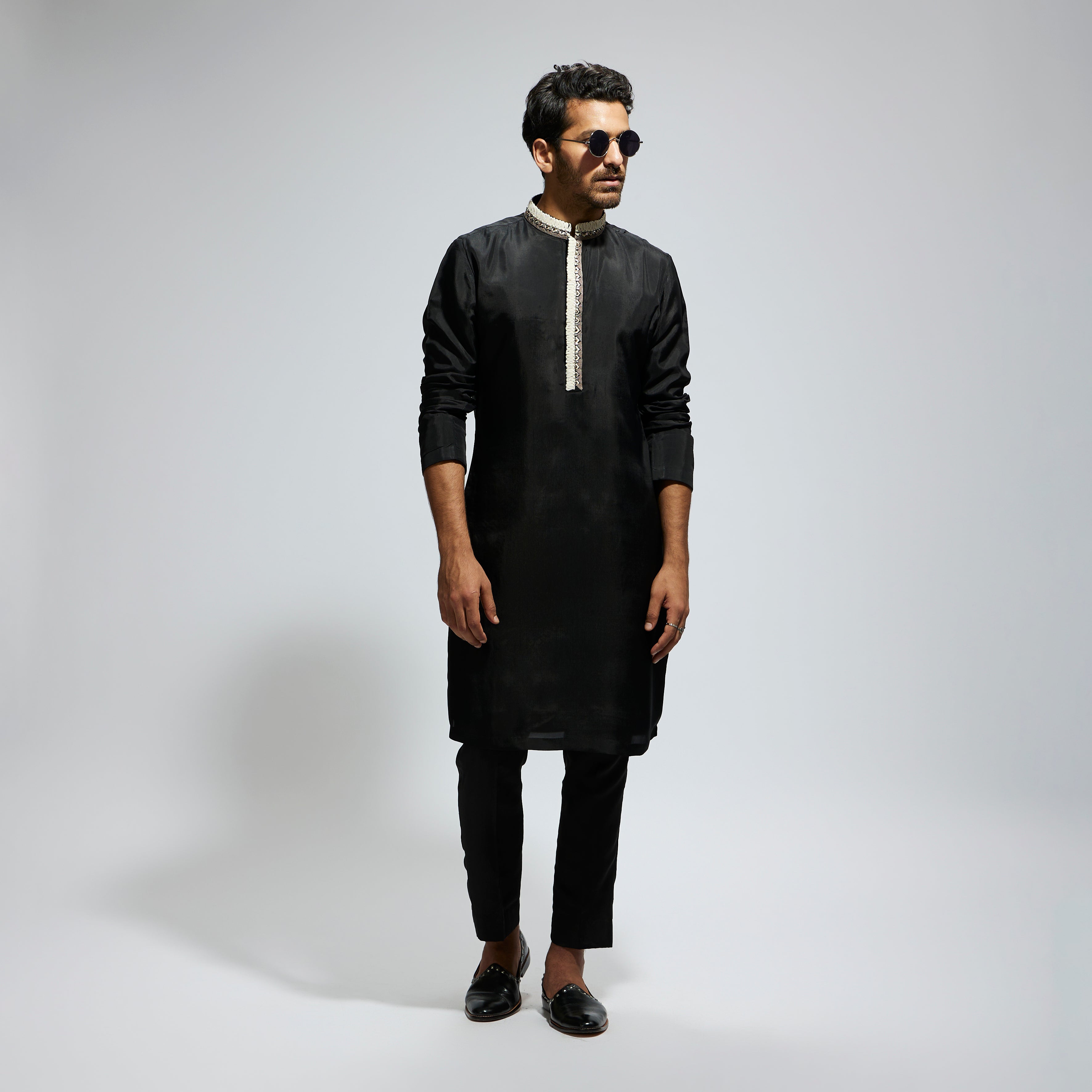 BLACK SOLID KURTA WITH EMB COLLAR AND KURTA WITH PANTS