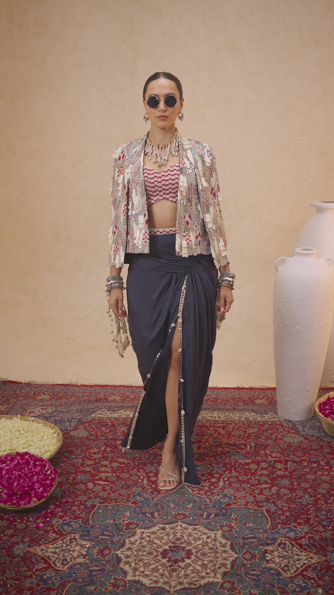 BLUE ABSTRACT EMBELLISHED FRINGE JACKET