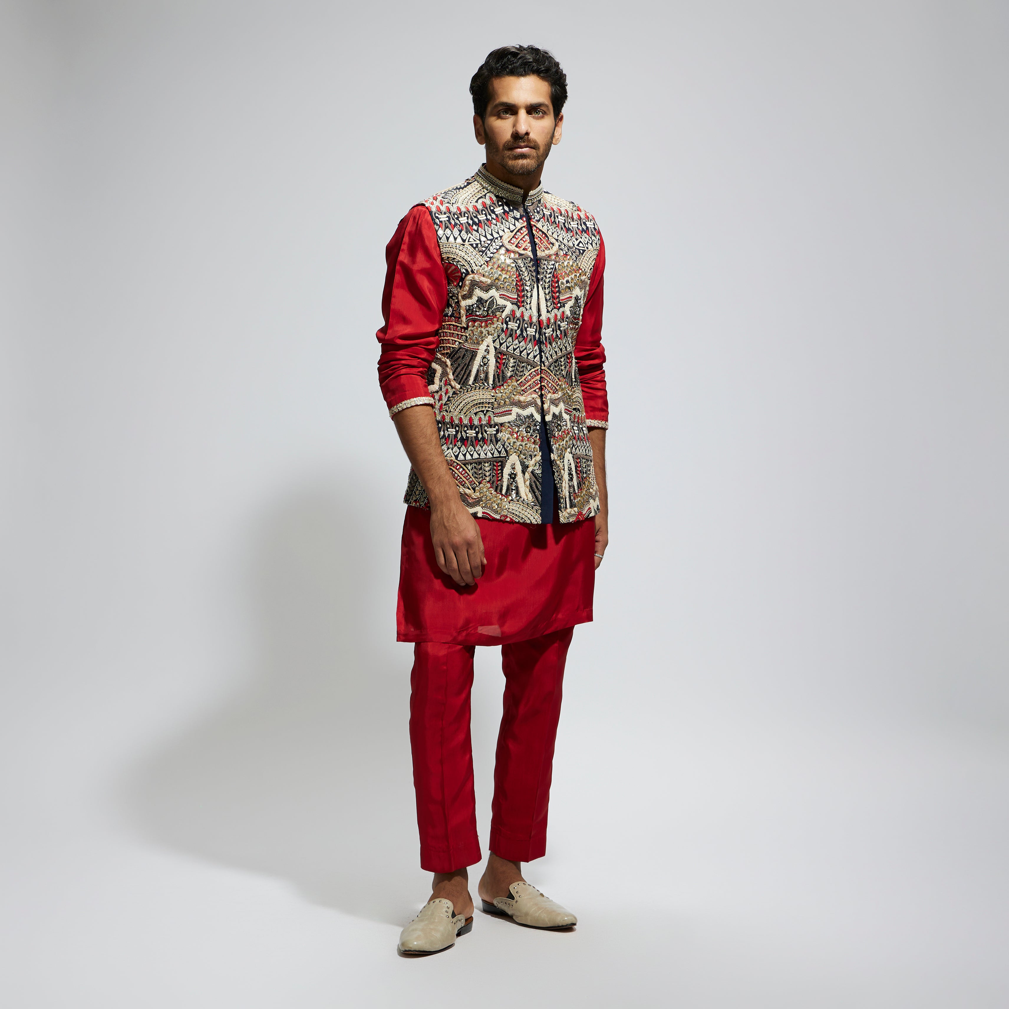 Featuring a blue abstract embroidered bundi, fabric Habutai, and Component 1.