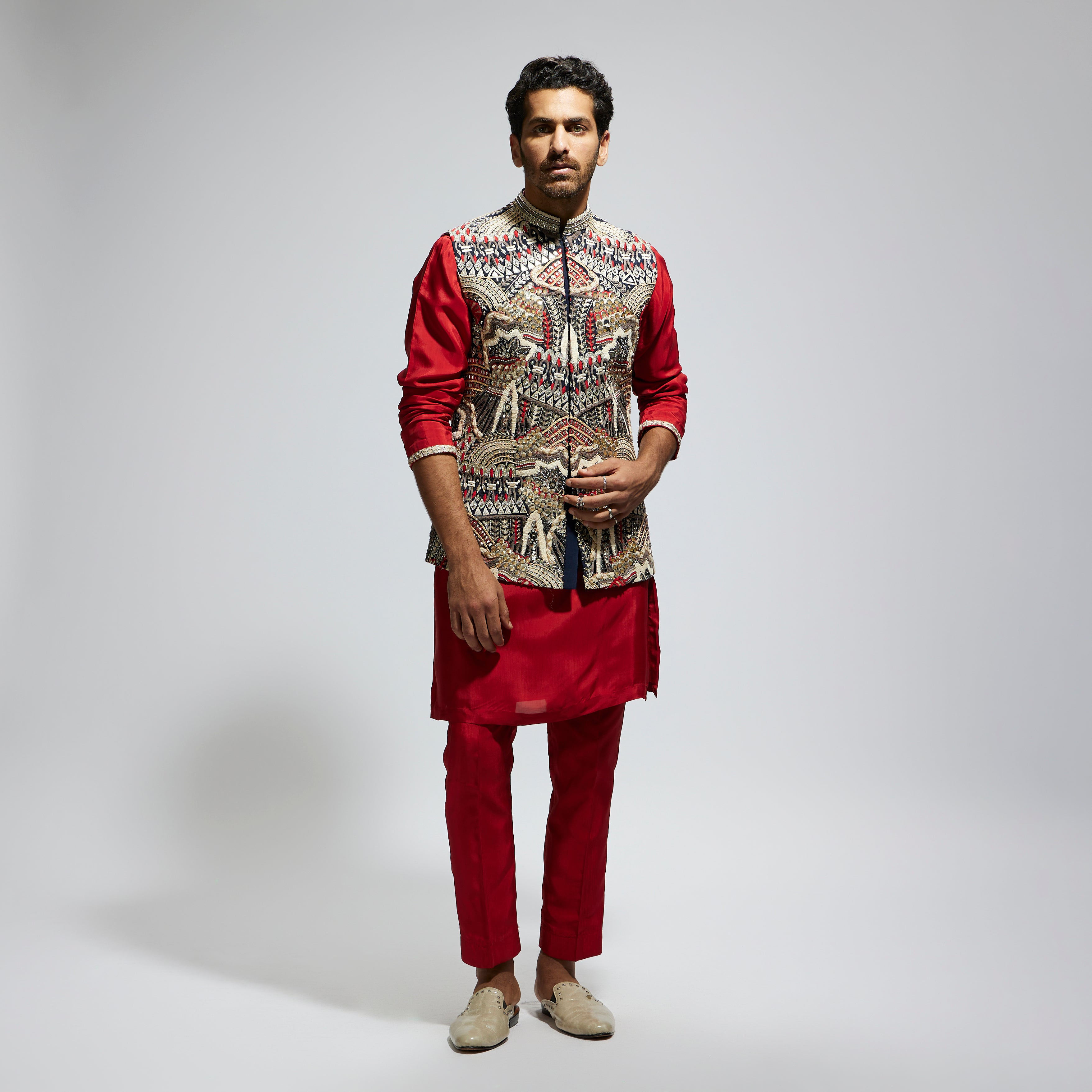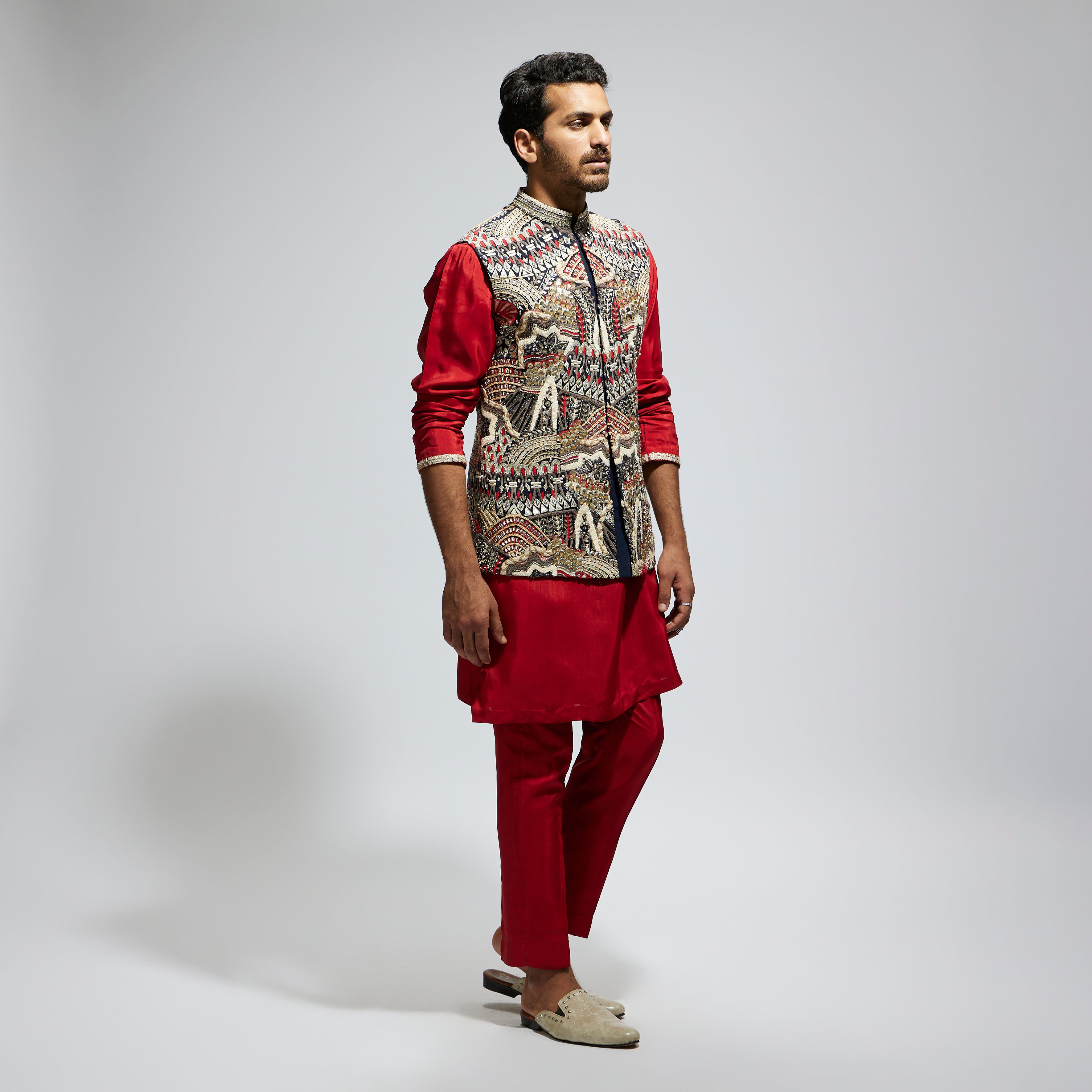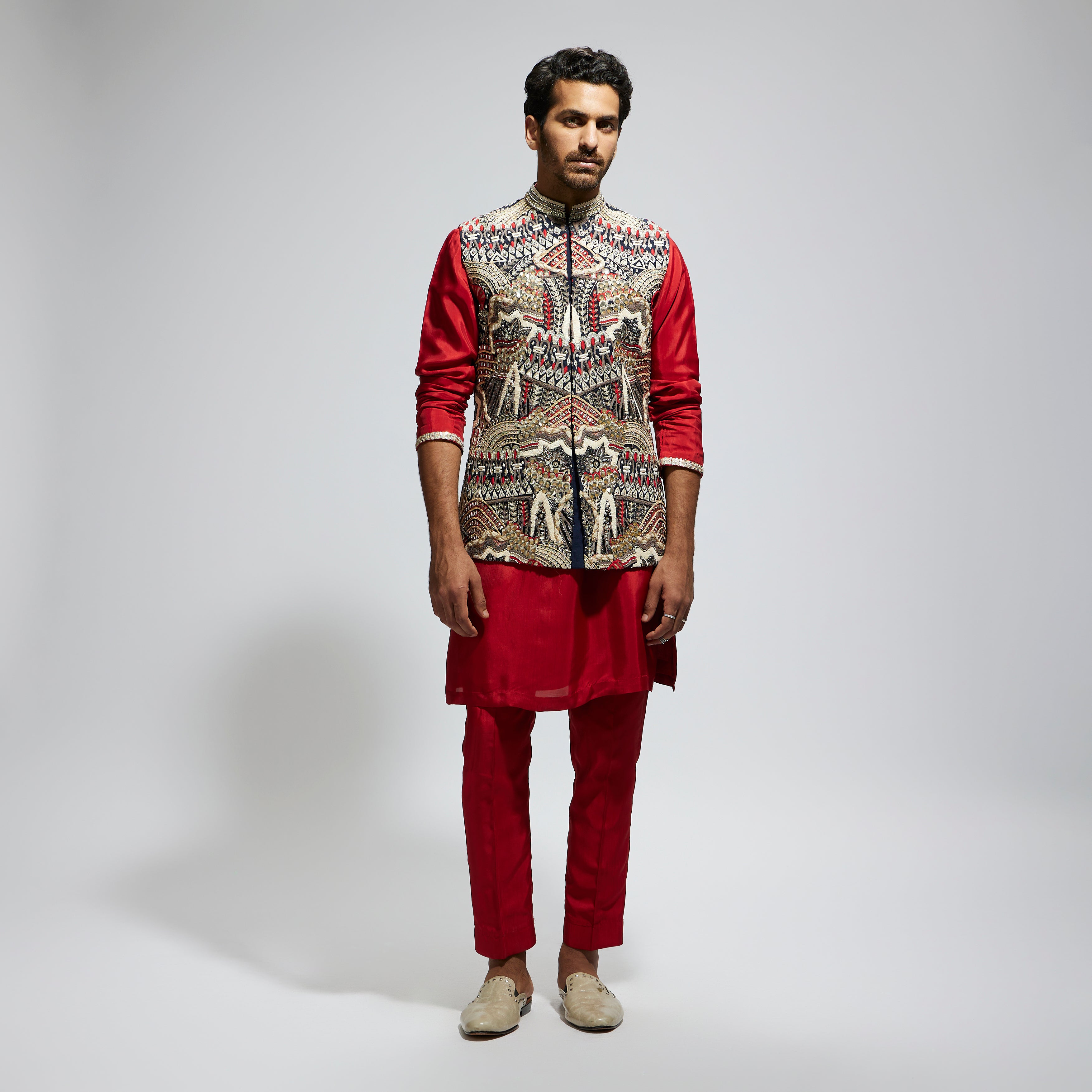 Featuring a blue abstract embroidered bundi with a orange solid kurta and pant, fabric habutai, and Component 2.