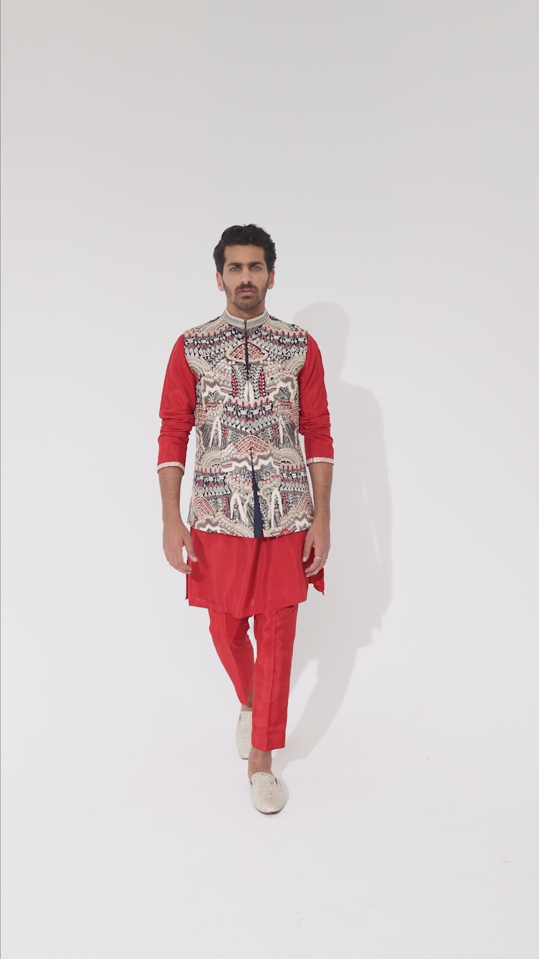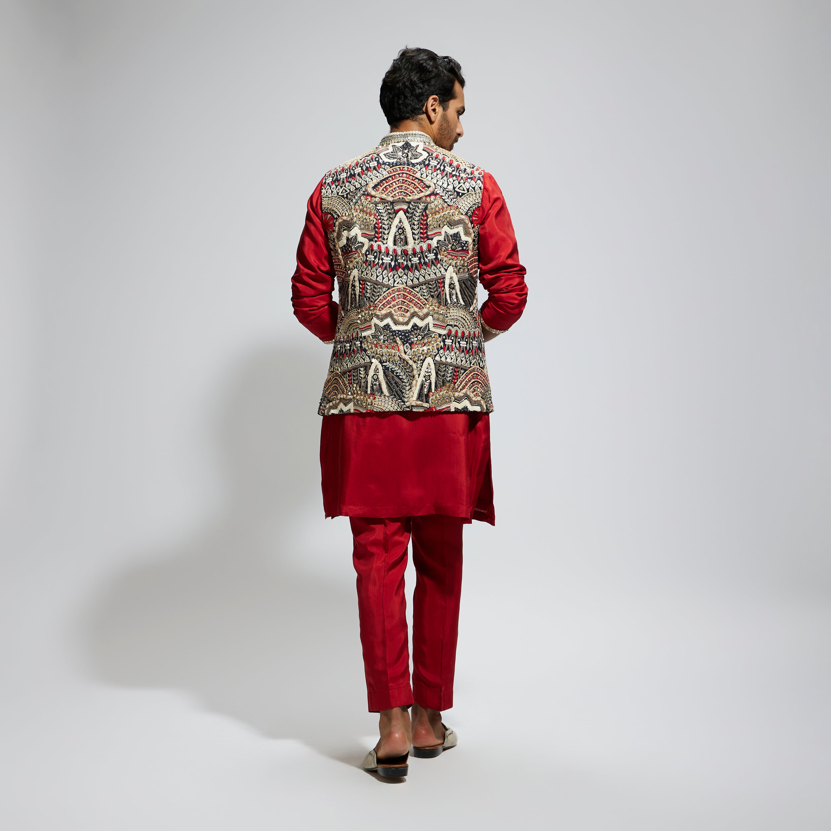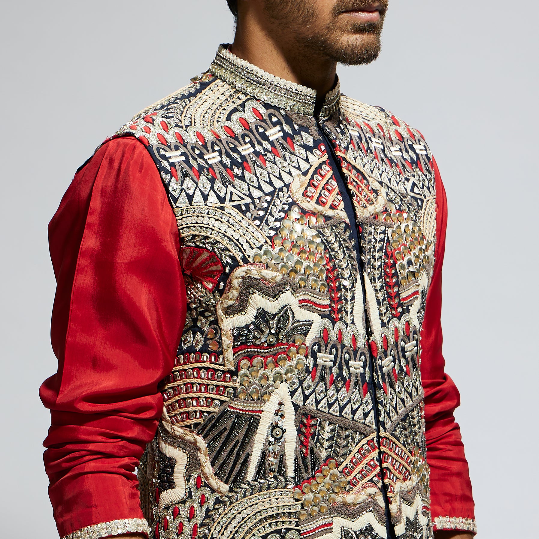 BLUE ABSTRACT EMBROIDERED BUNDI WITH ORANGE SOLID KURTA AND PANTS