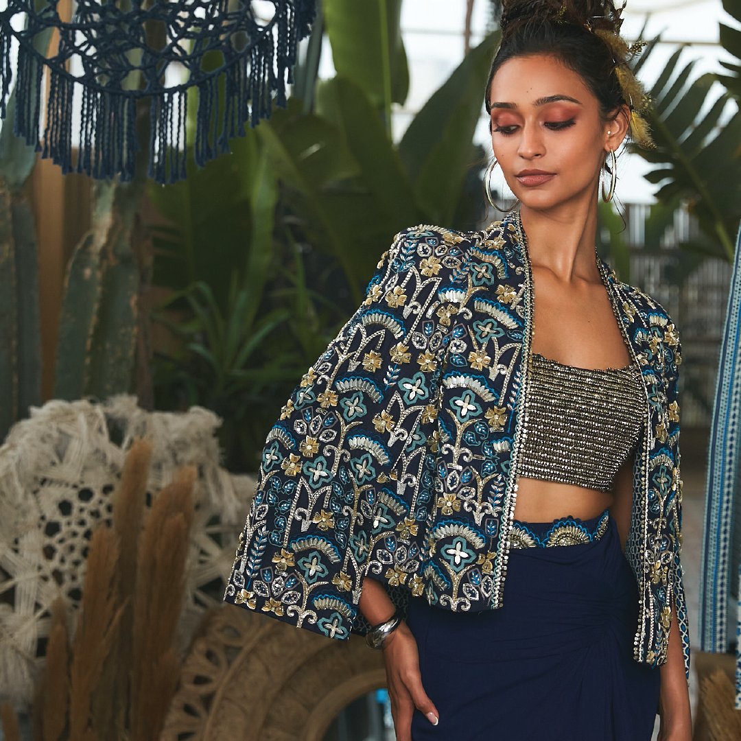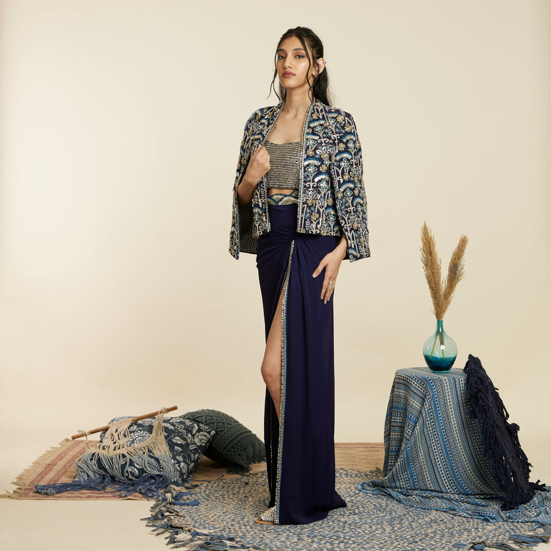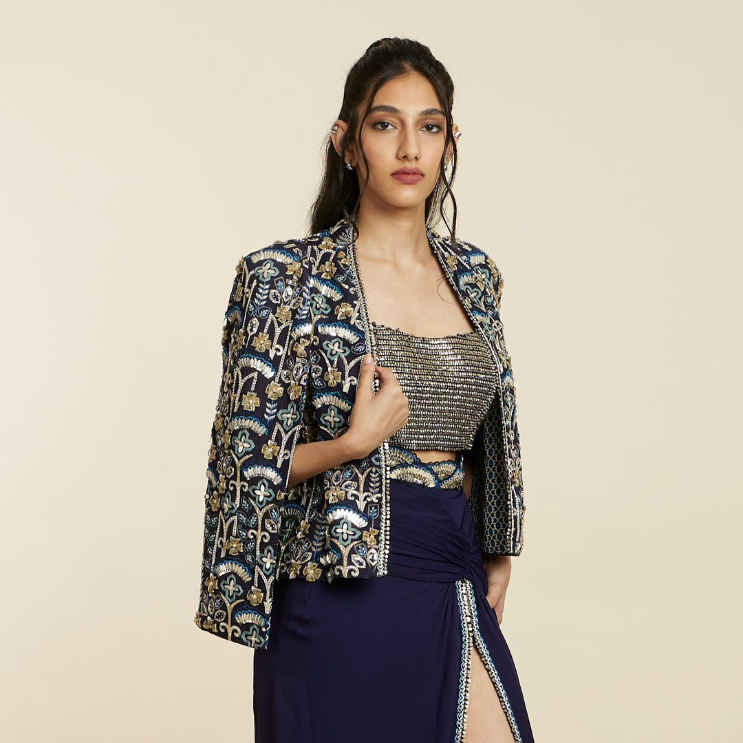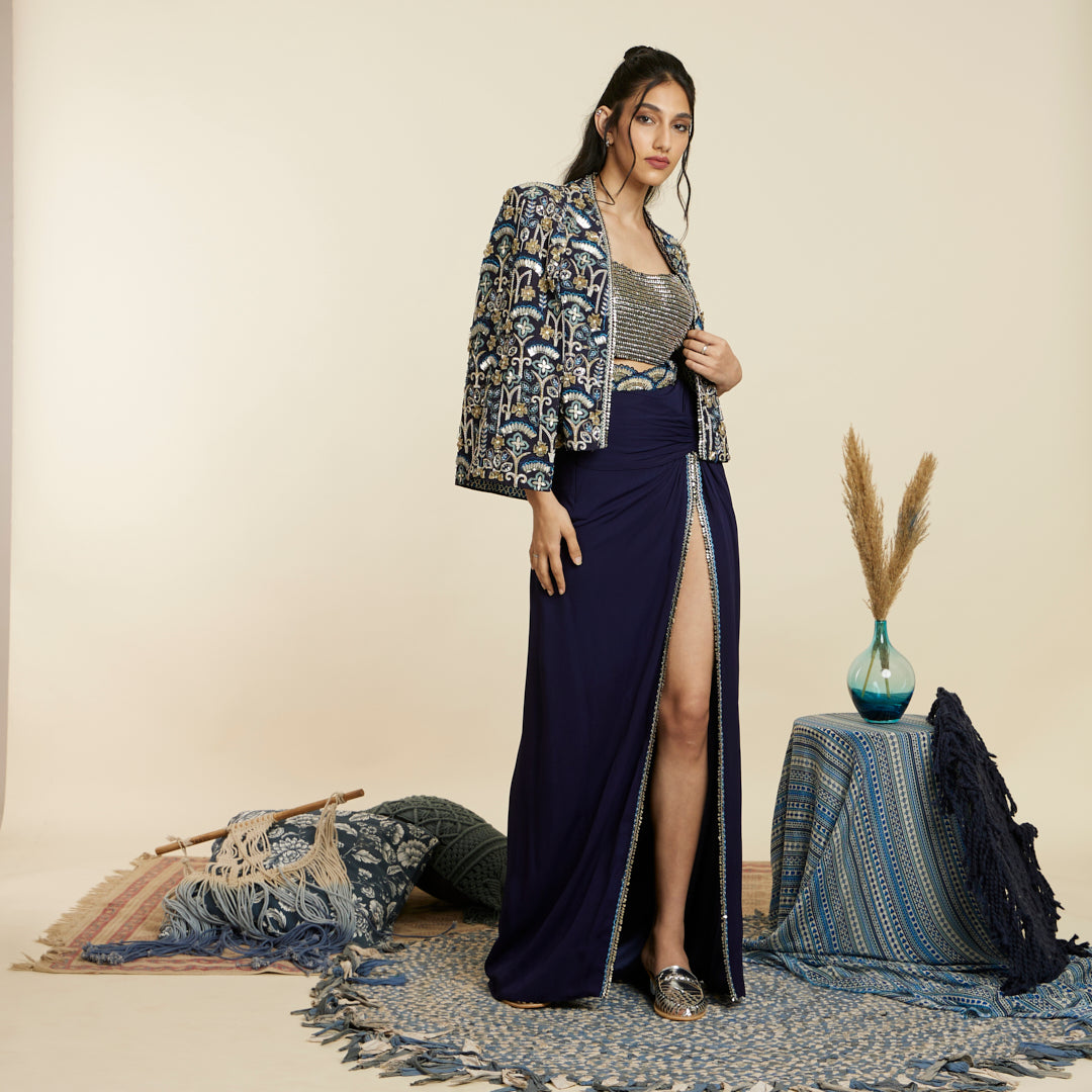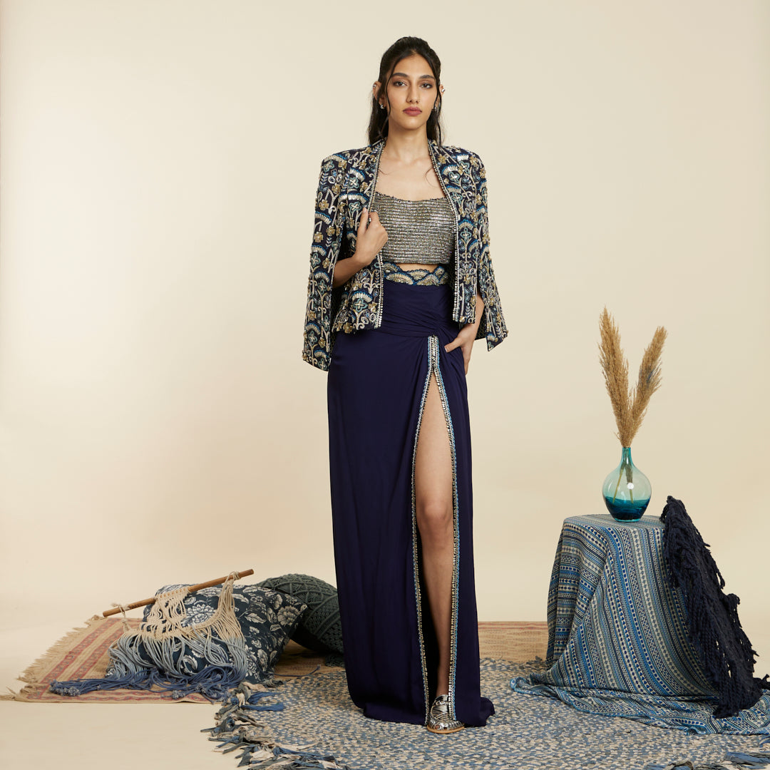 Featuring a blue art deco embellished noor jacket teamed with metallic bustier and high slit skirt