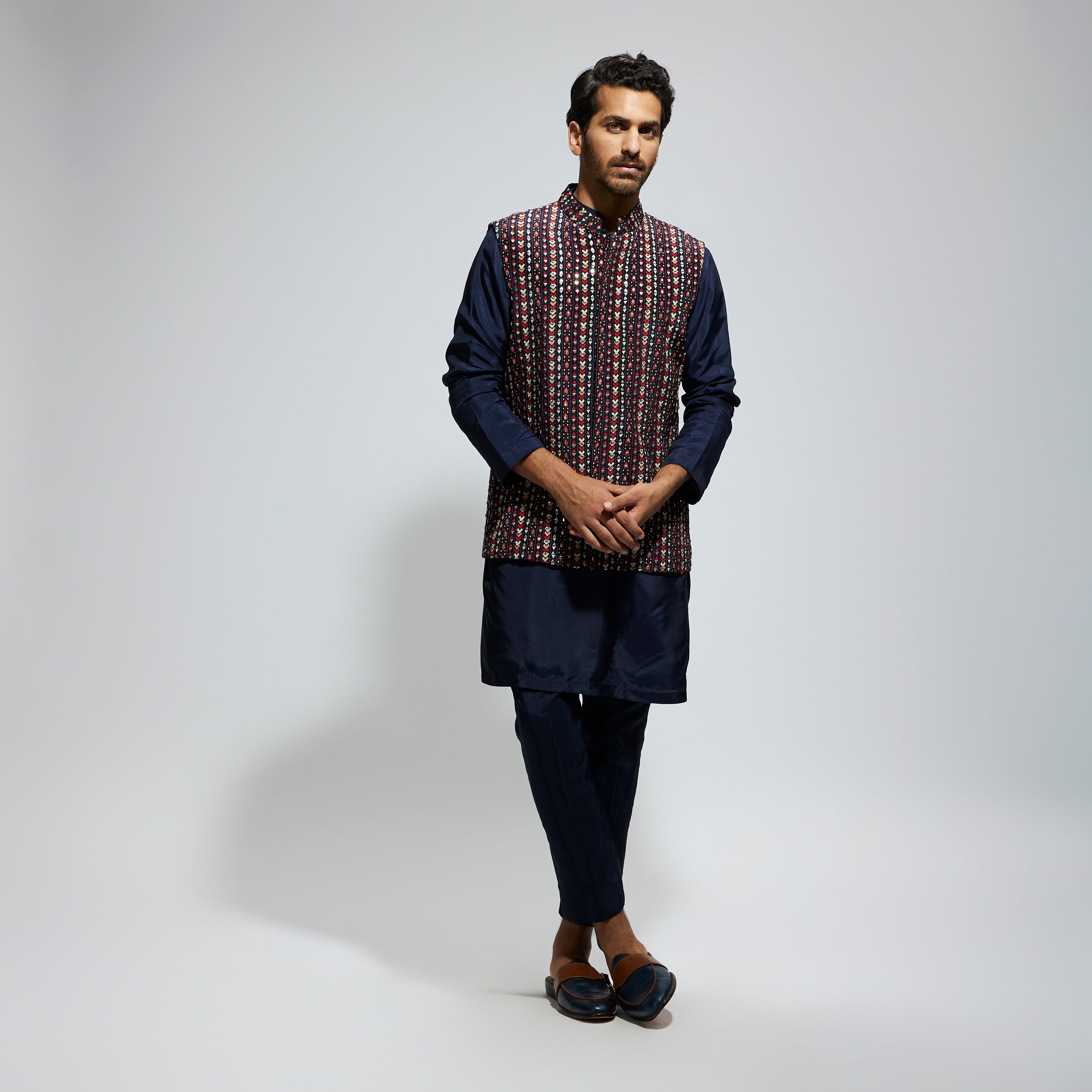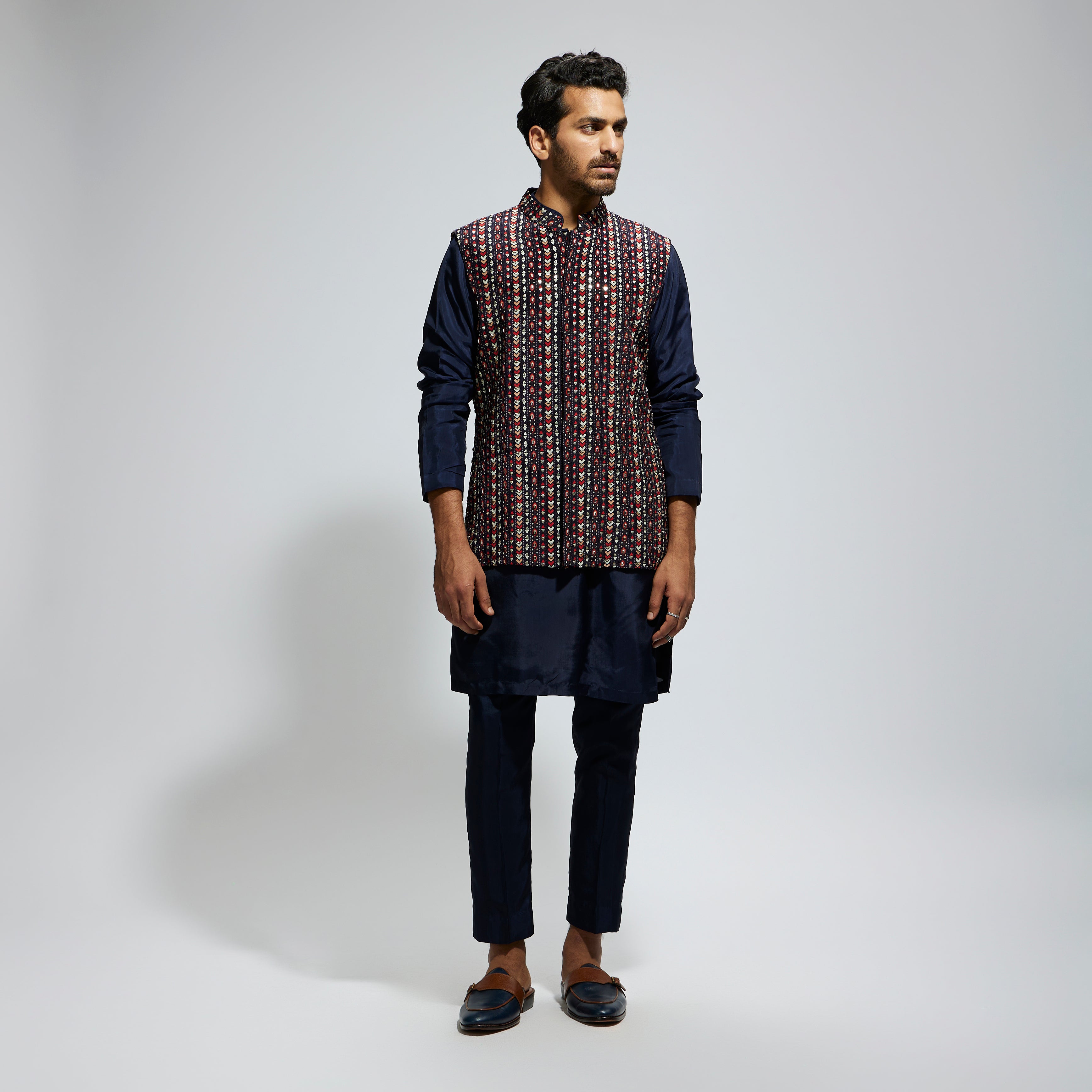 BLUE BOHO GEO EMBELLISHED BUNDI PAIRED WITH SOLID BLUE KURTA AND PANTS