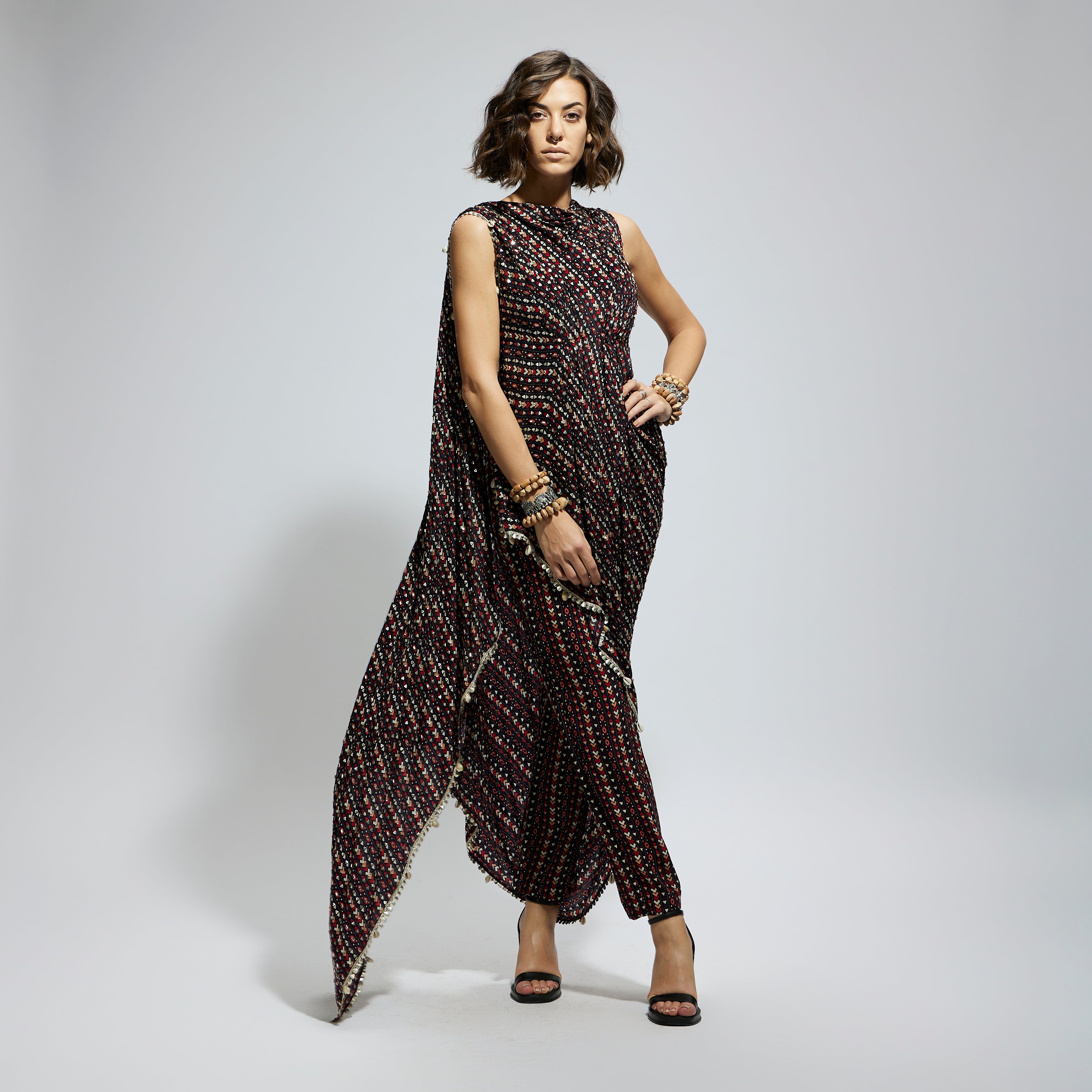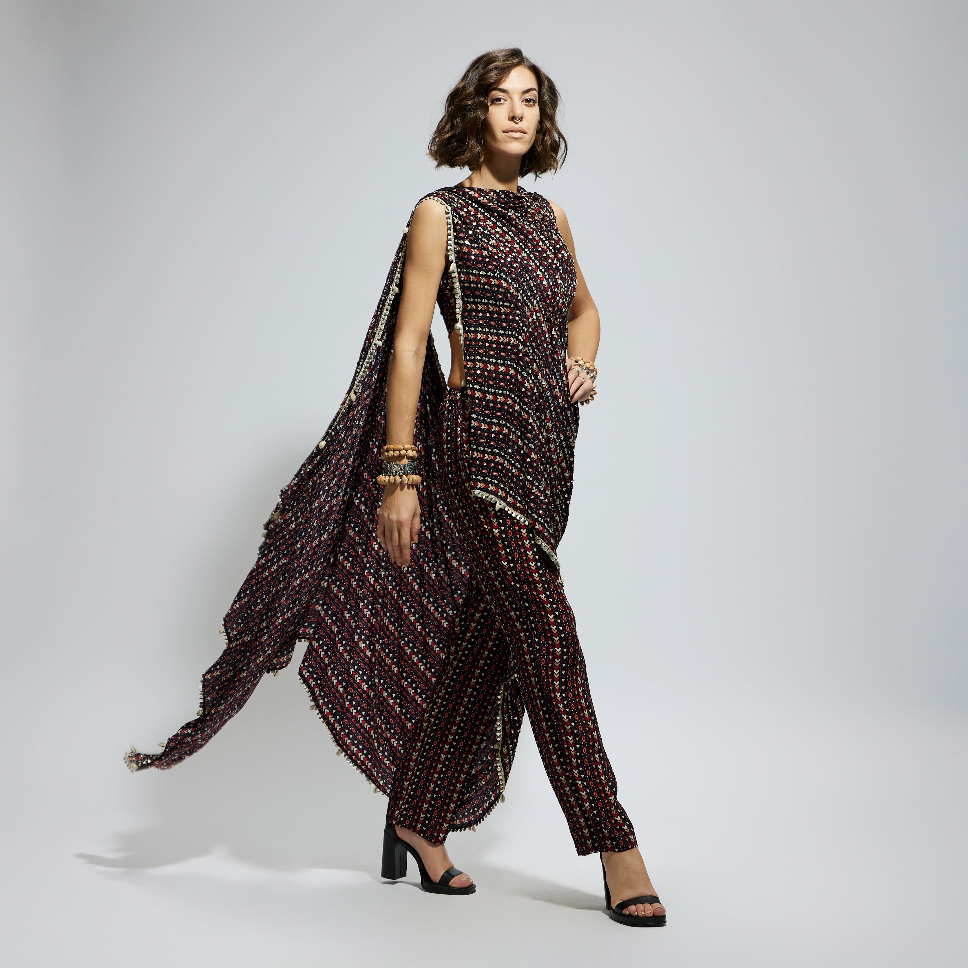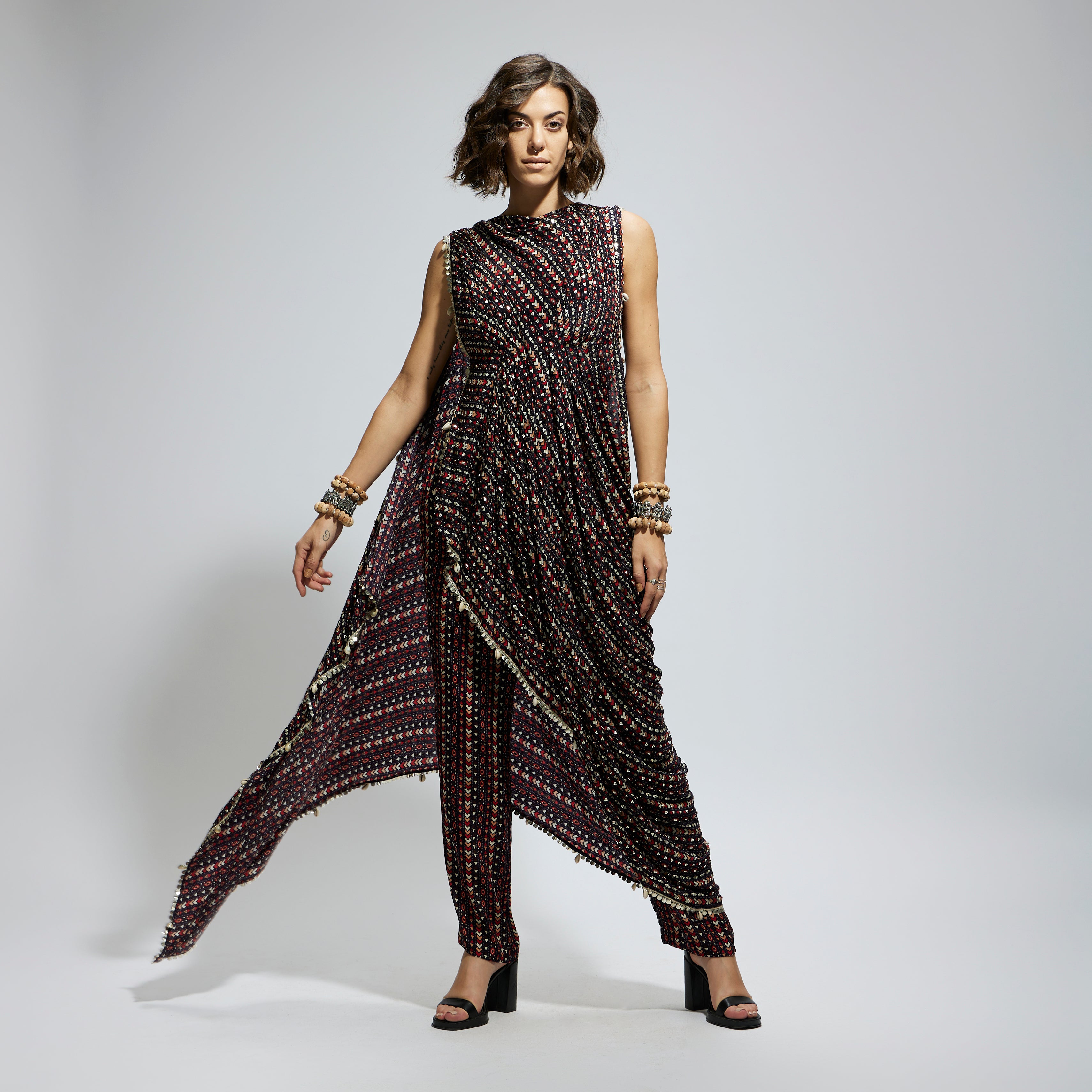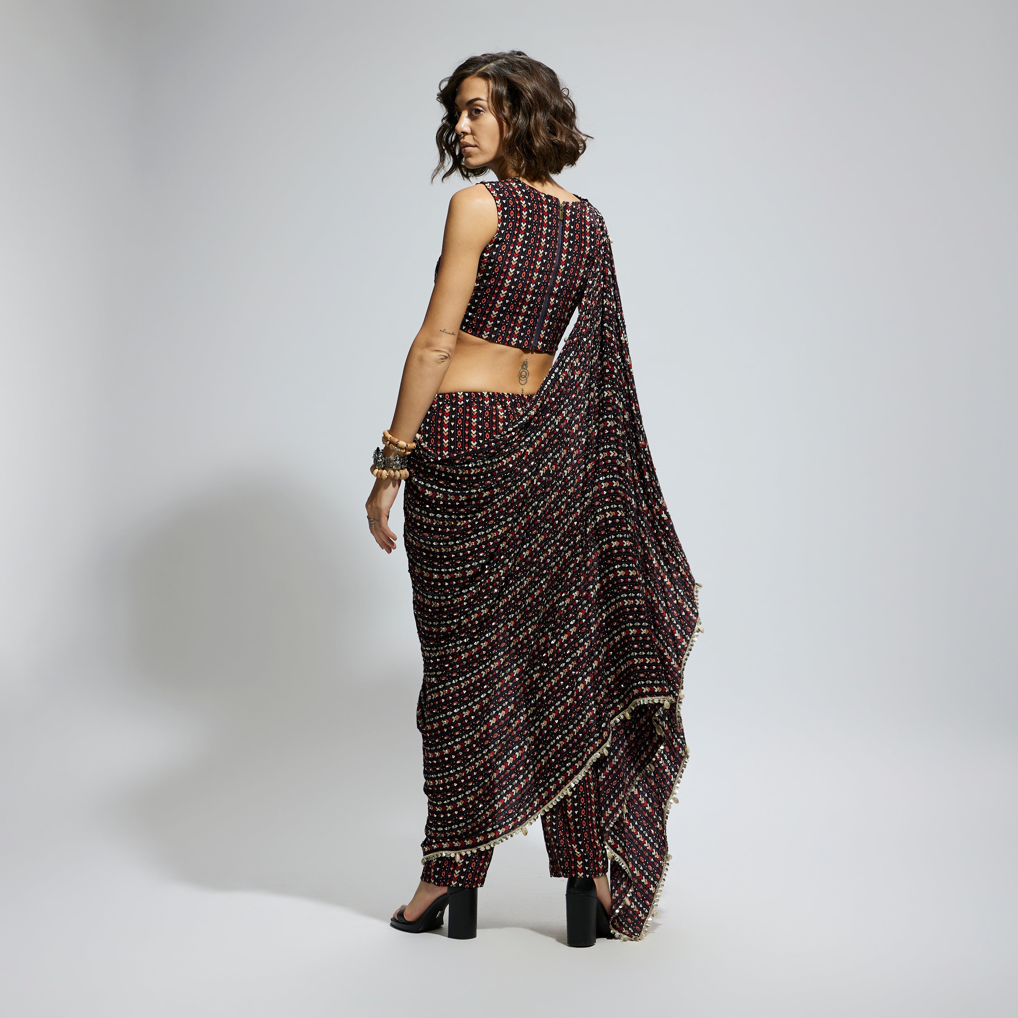 BLUE BOHO PRINT EMBELLISHED CROPTOP ATTACHED DRAPE WITH PANTS