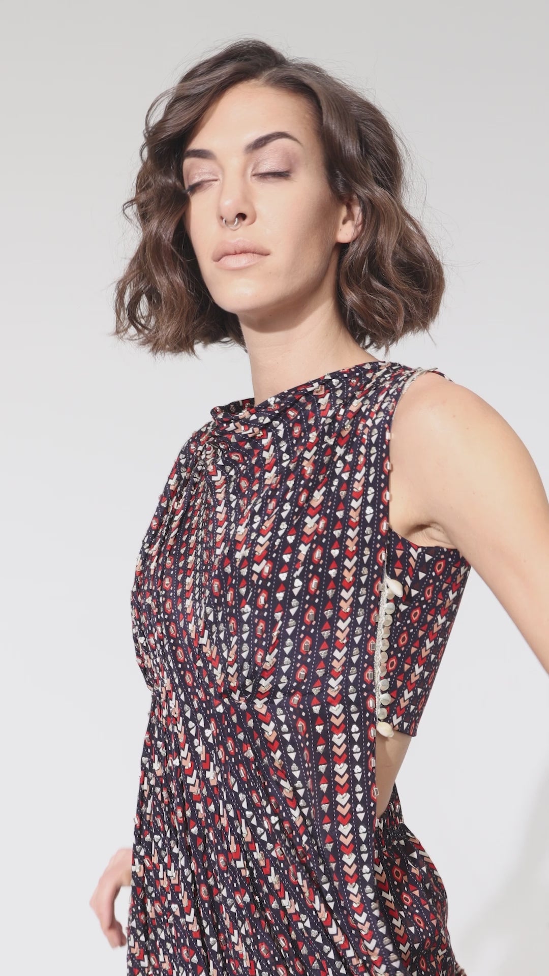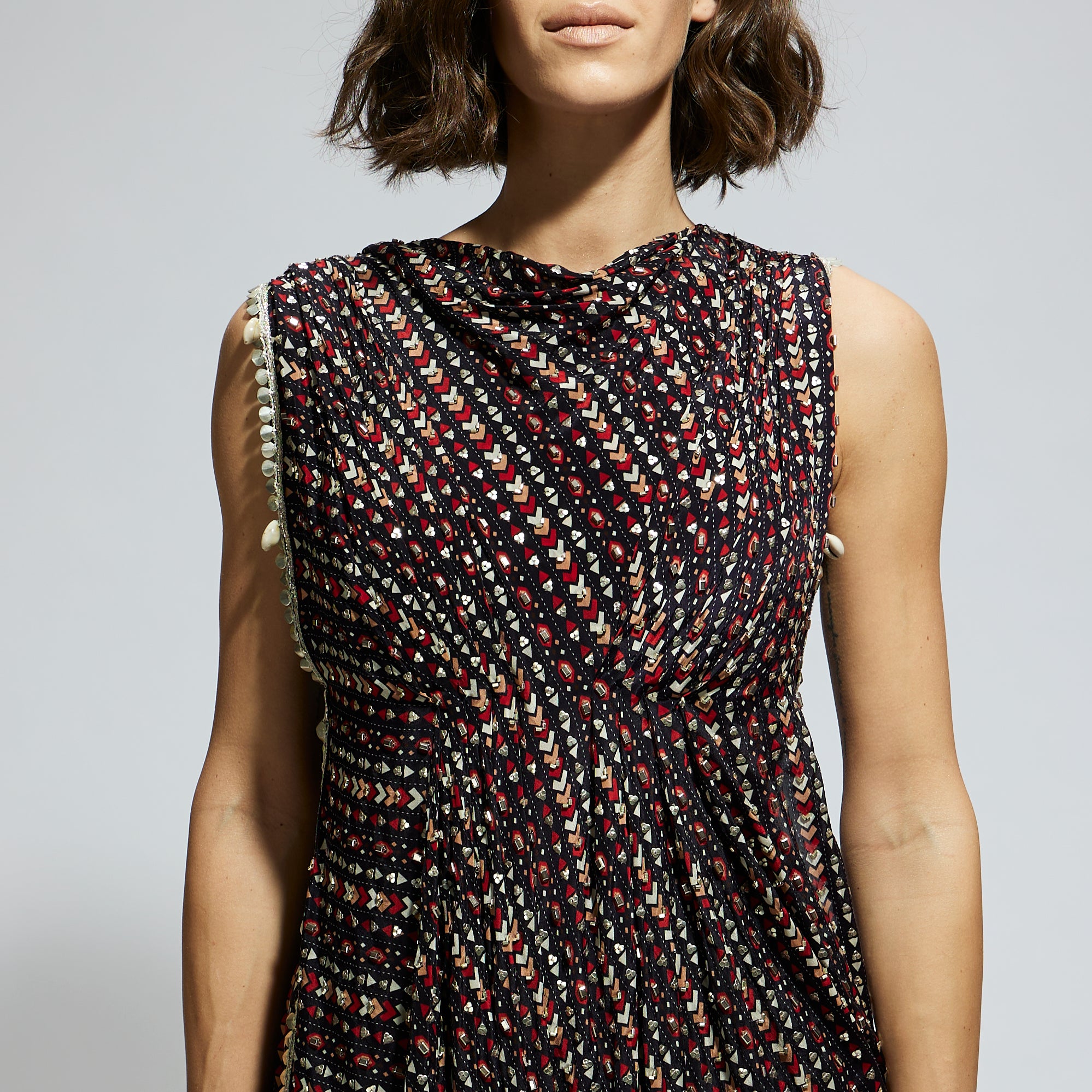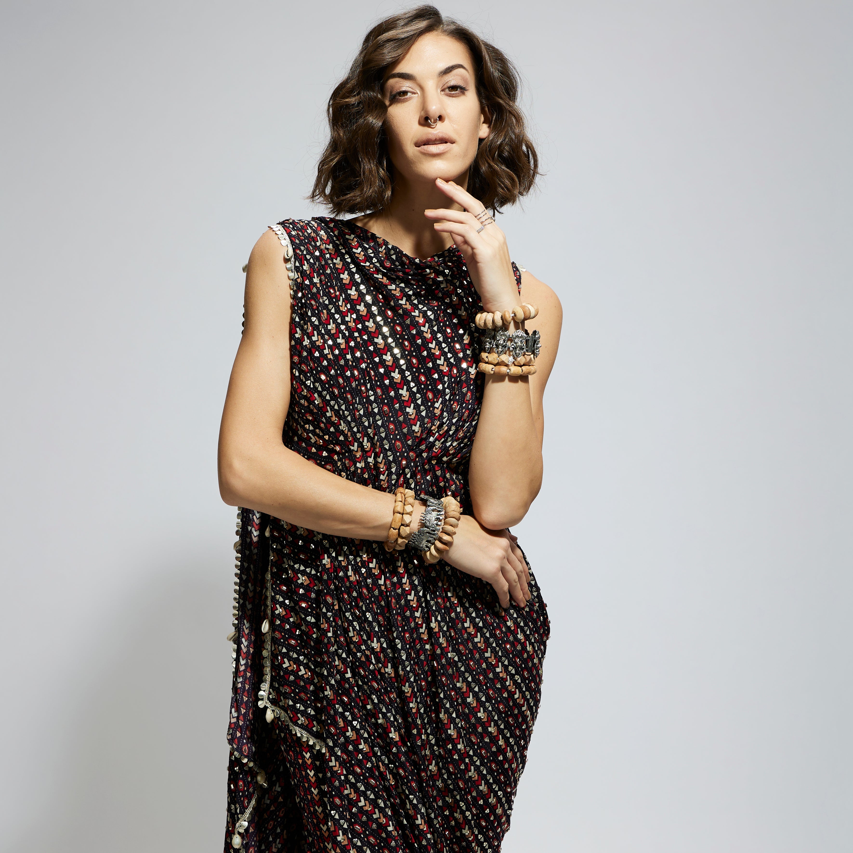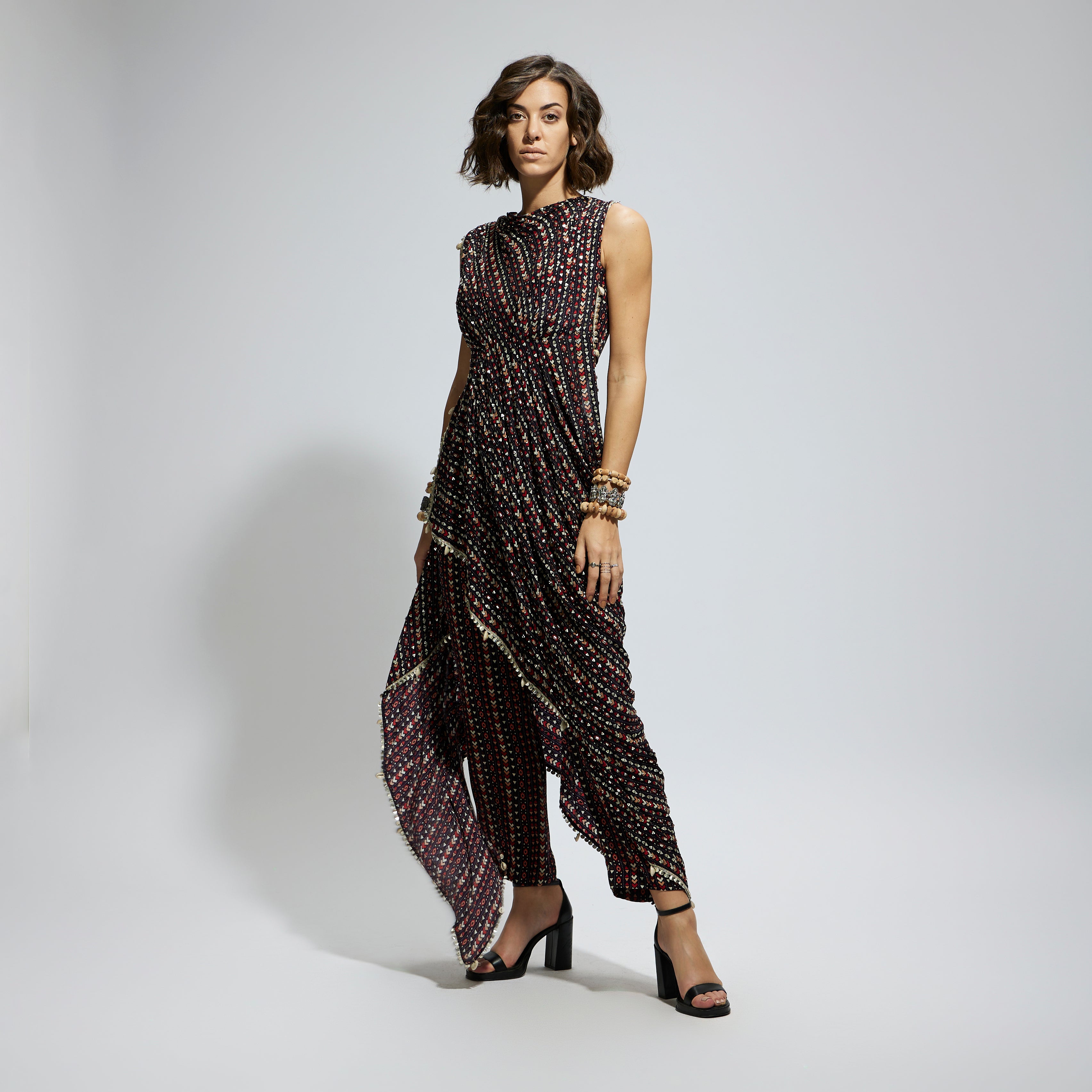 The blue boho geo print is embellished with an attached drape and a Kodi tassel border with a pant, Fabric Crepe, Component 2.