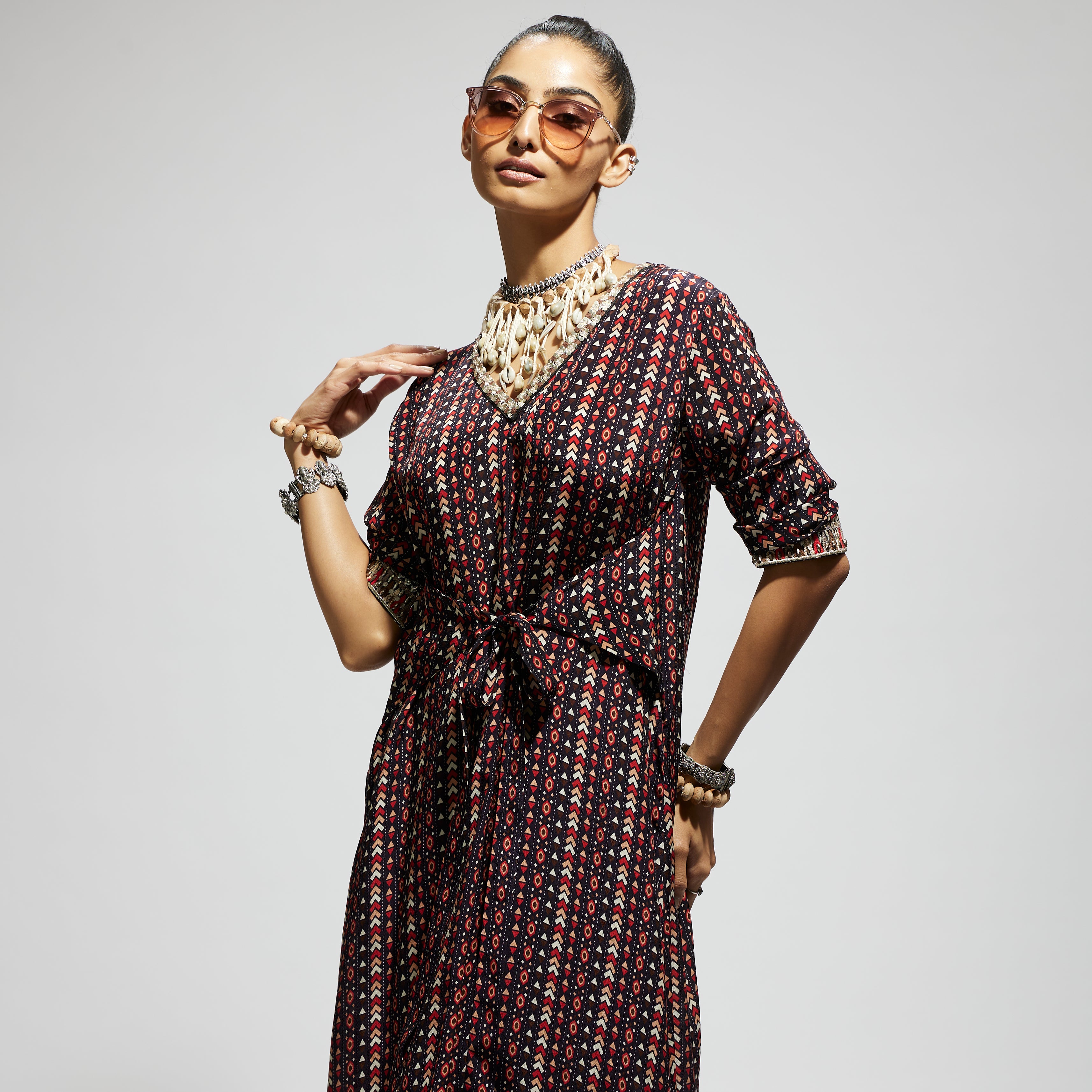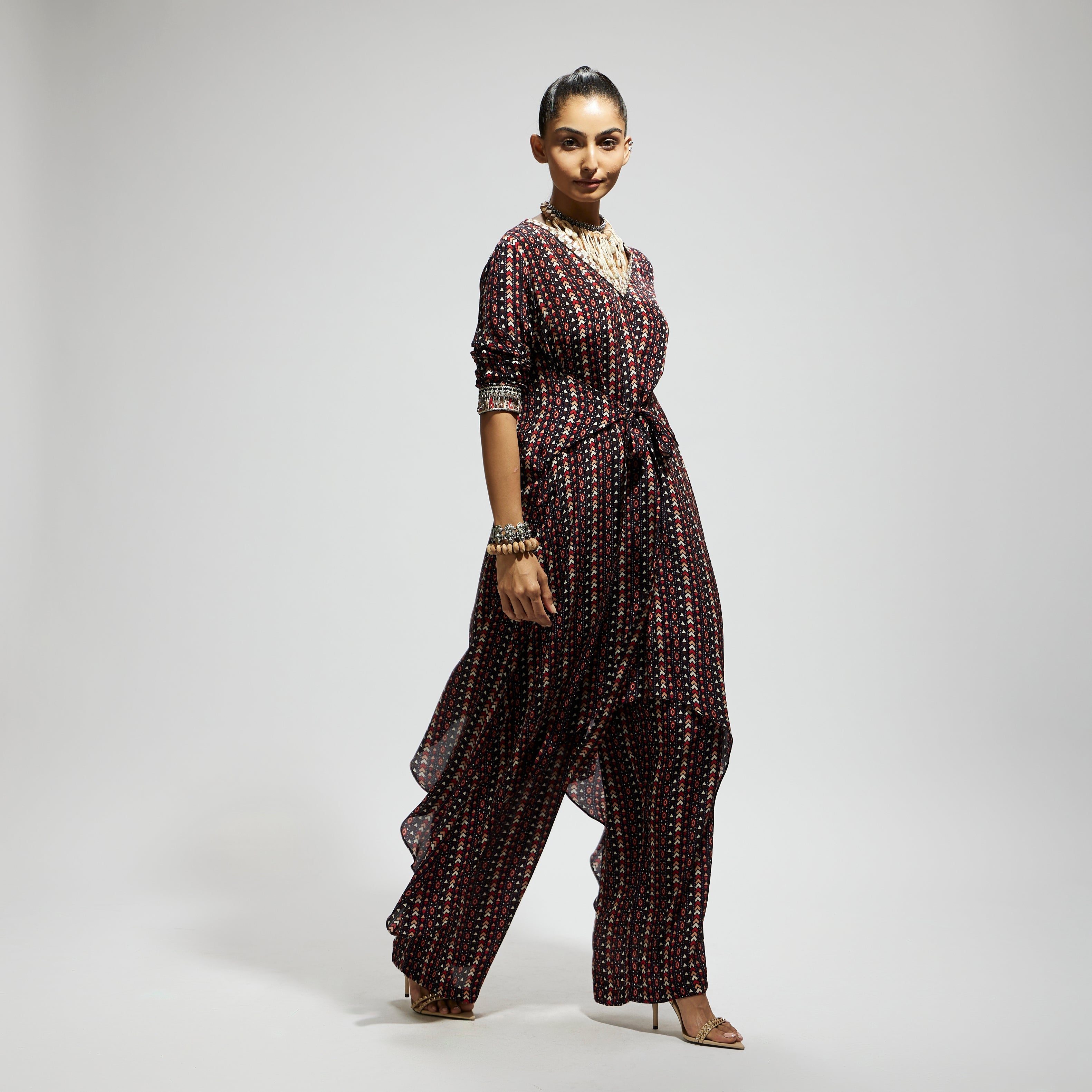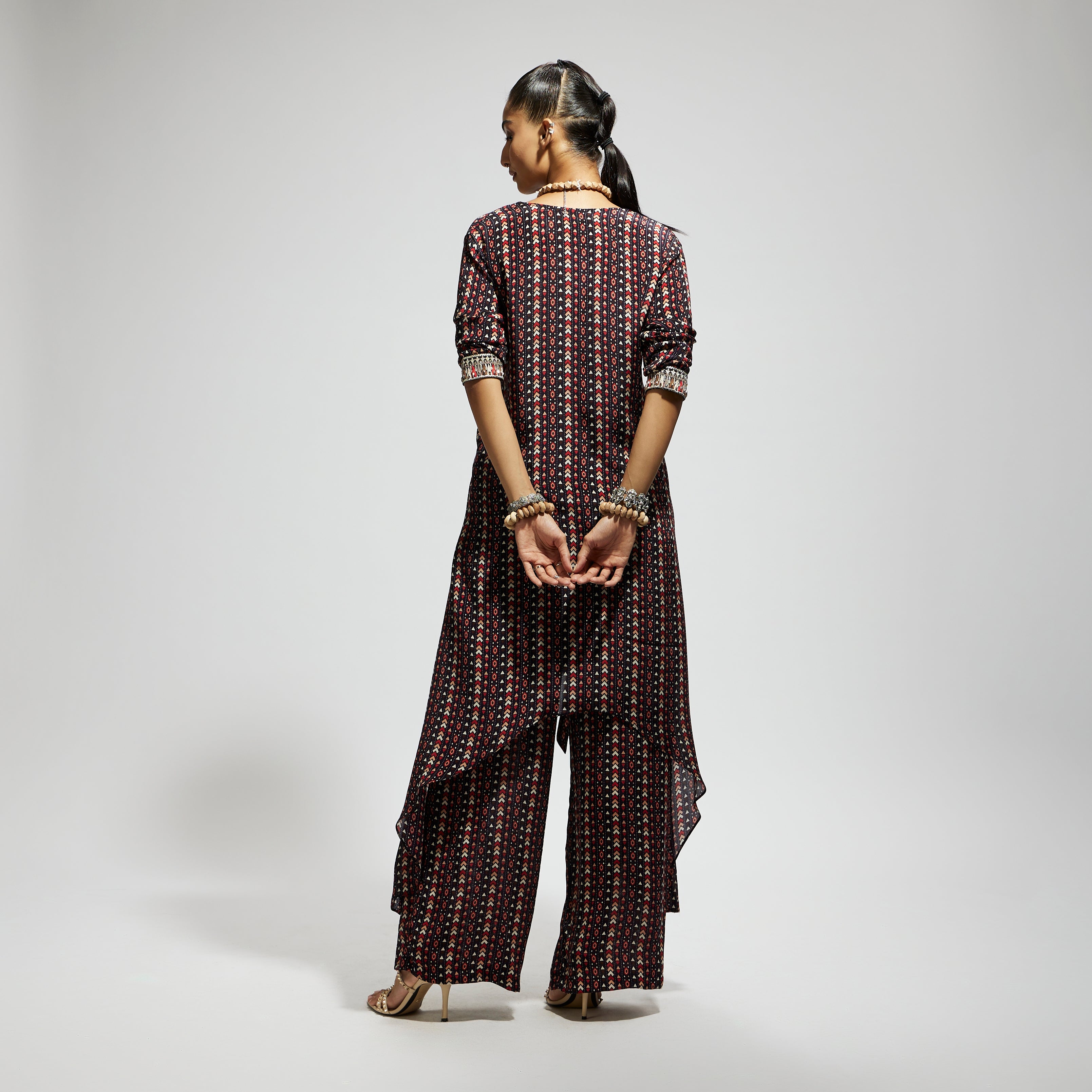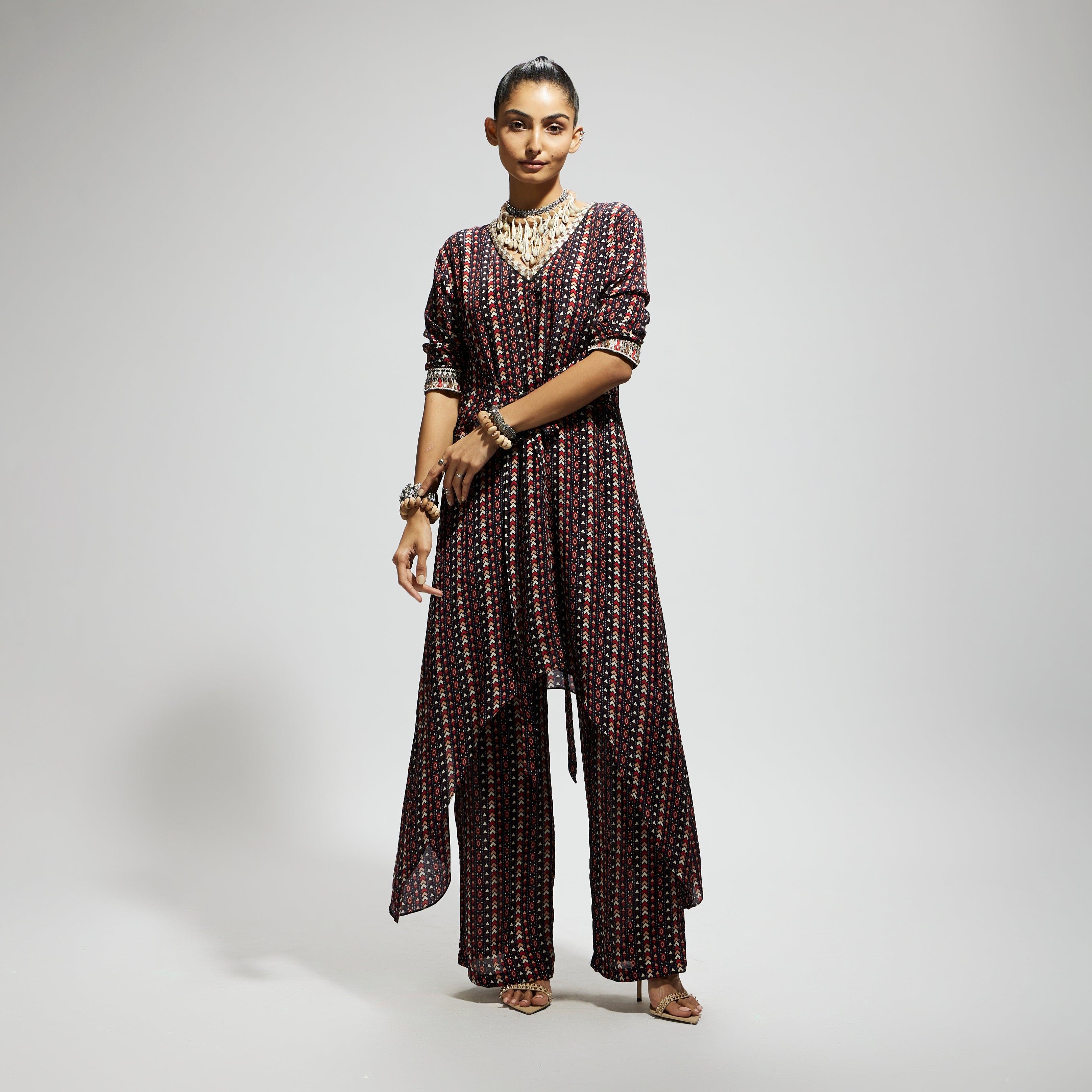 The blue boho print front tie-up tunic is paired with pant made of fabric airjet crepe component 2.