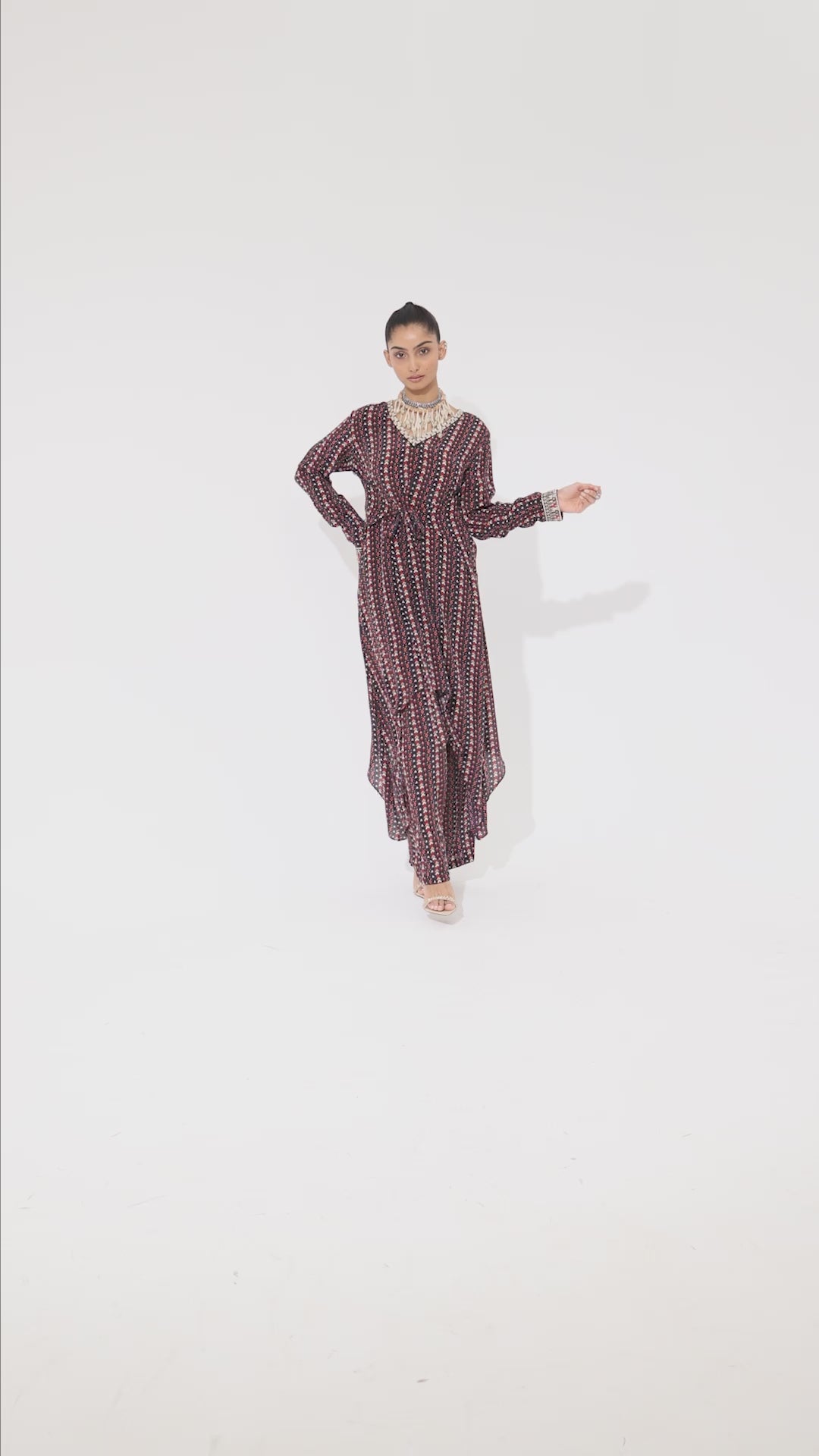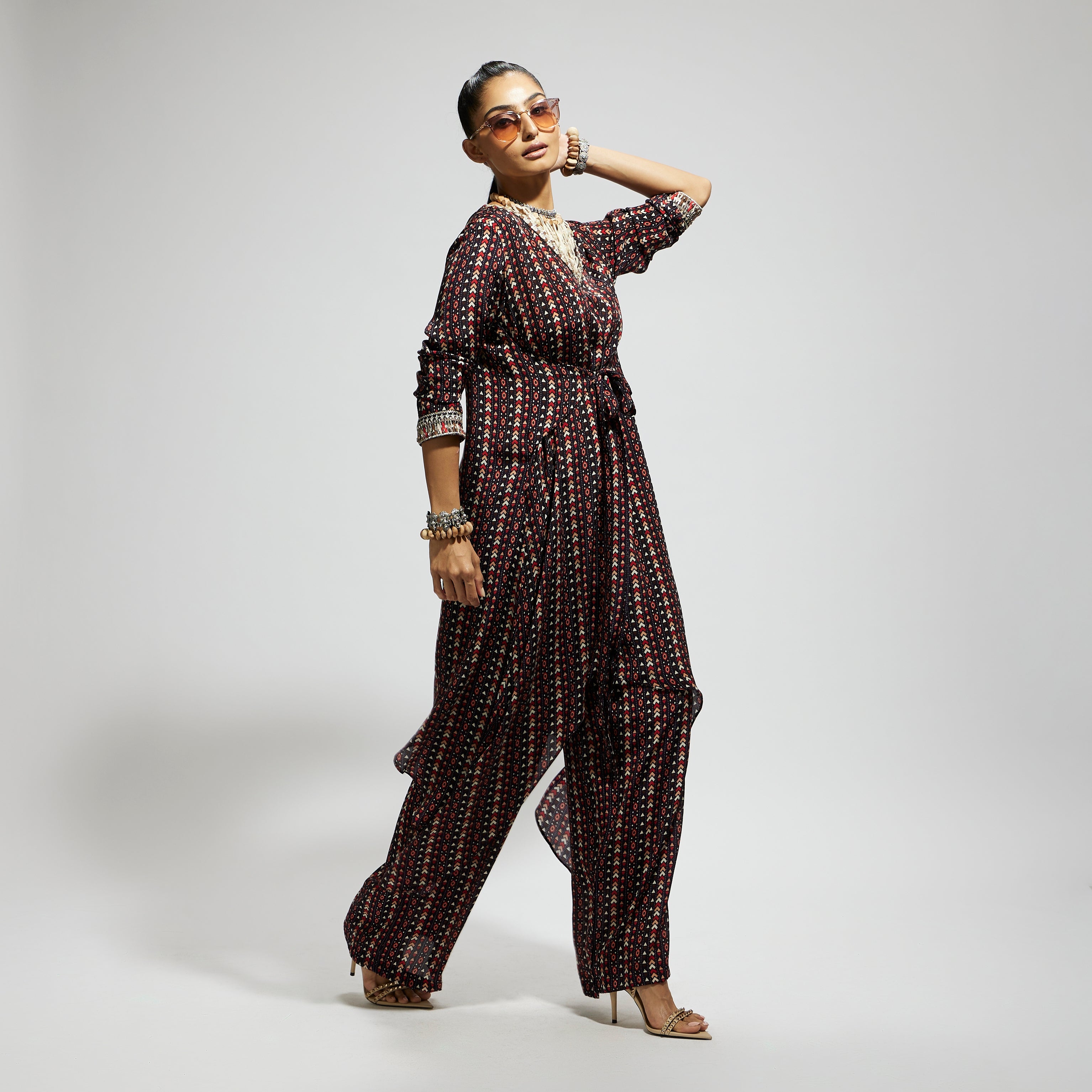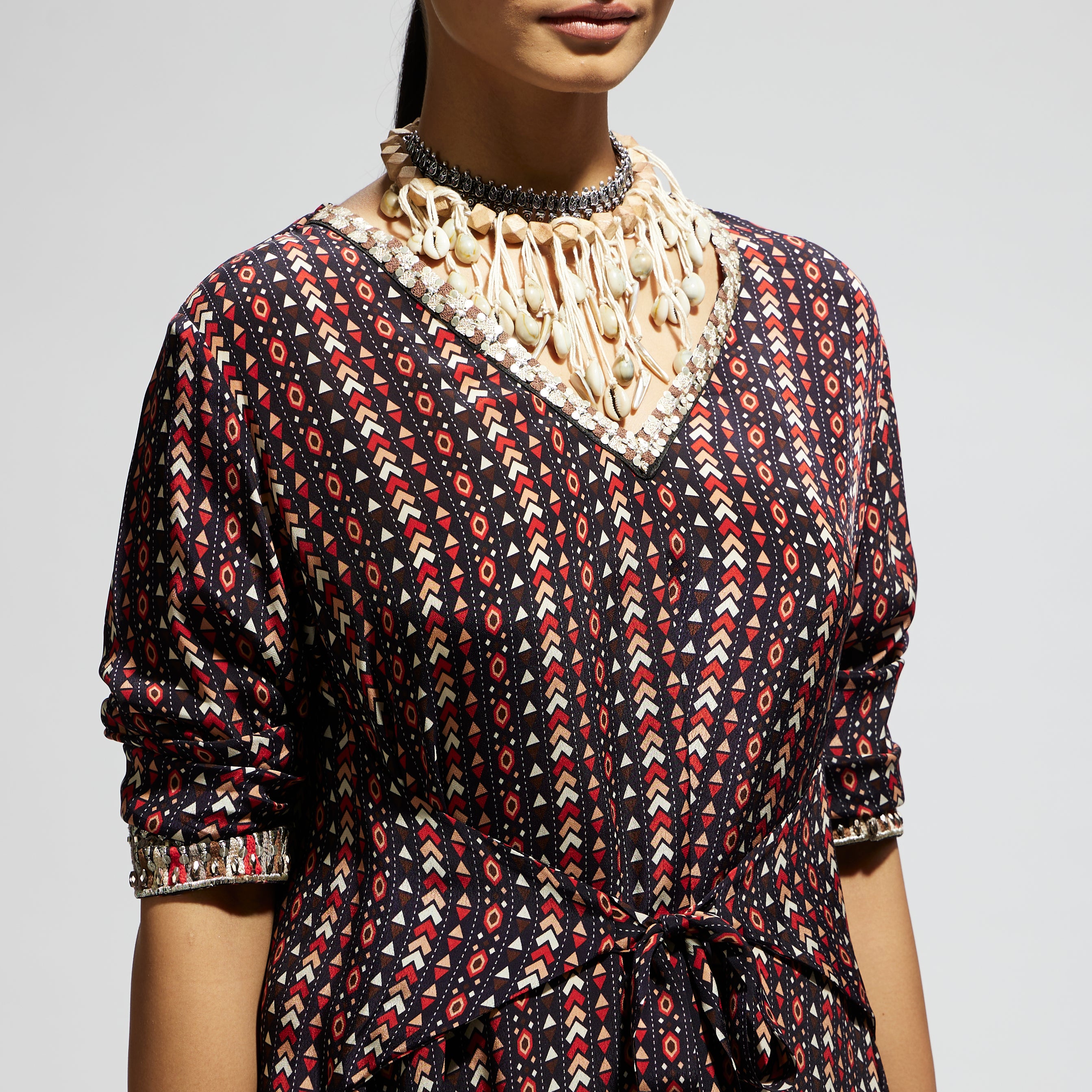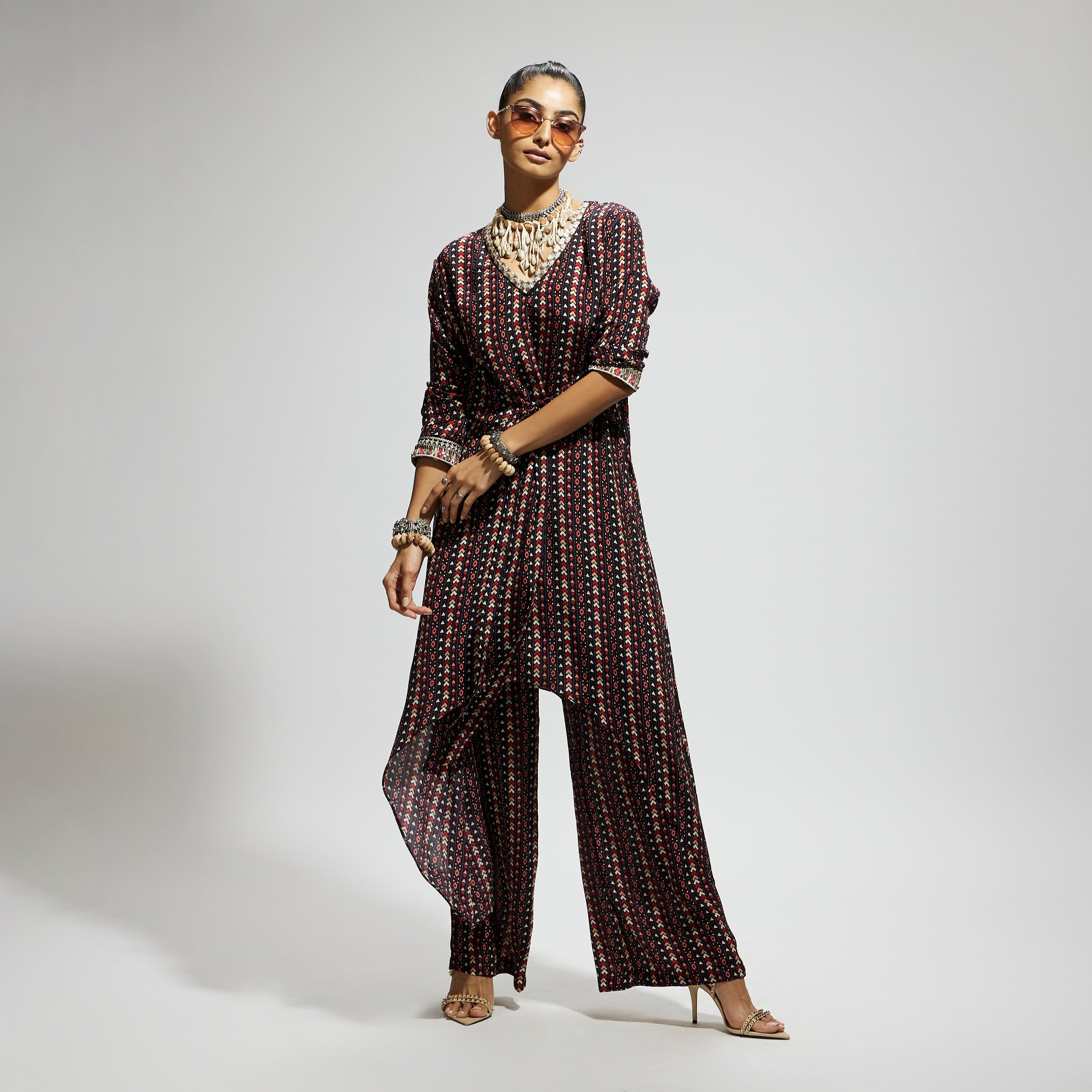 The blue boho print front tie-up tunic is paired with pant made of fabric airjet crepe component 2.
