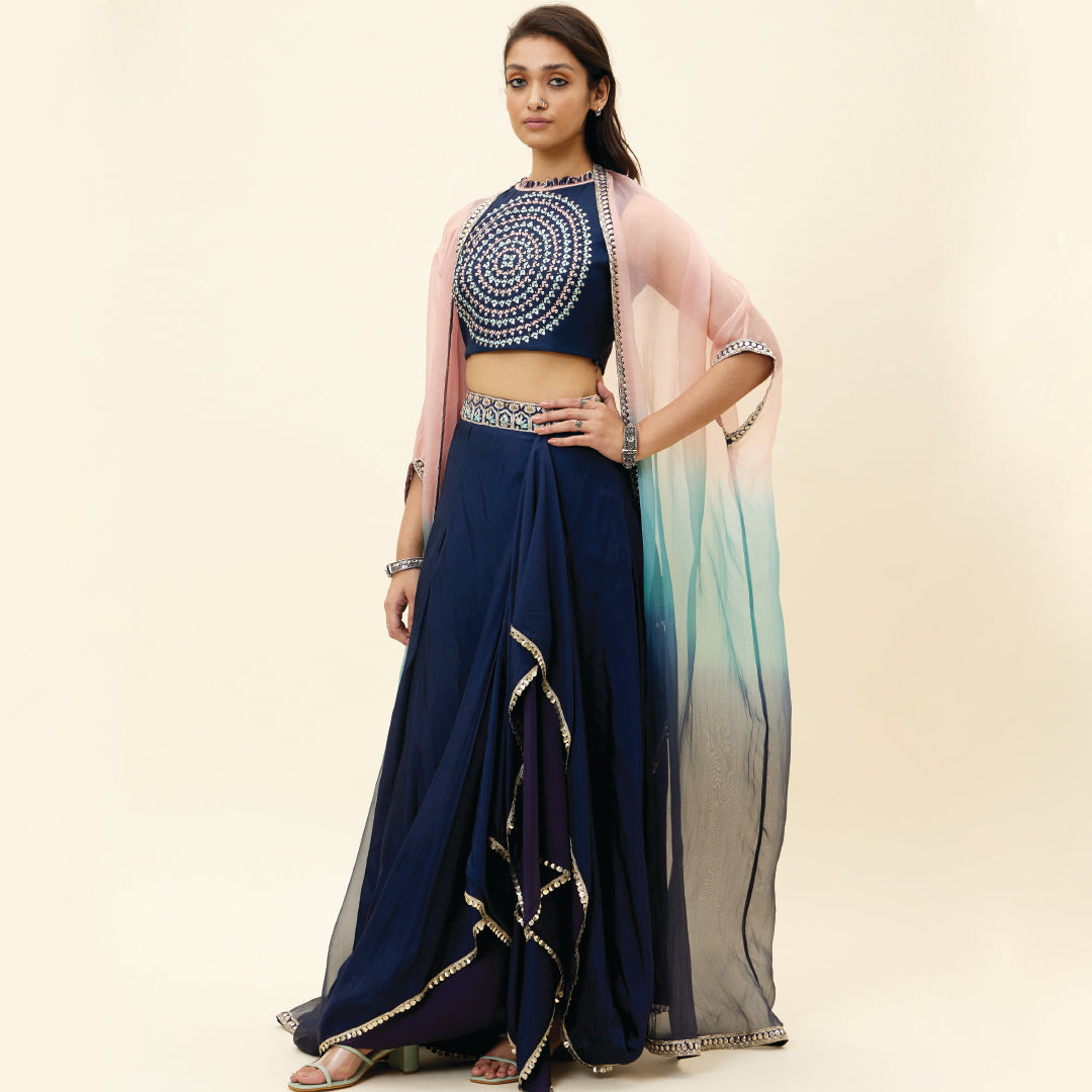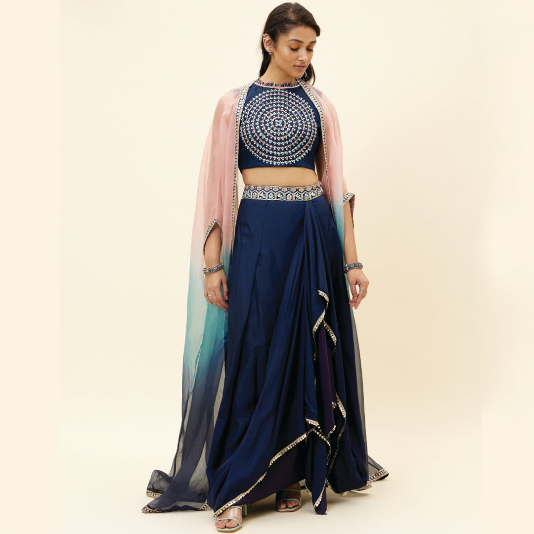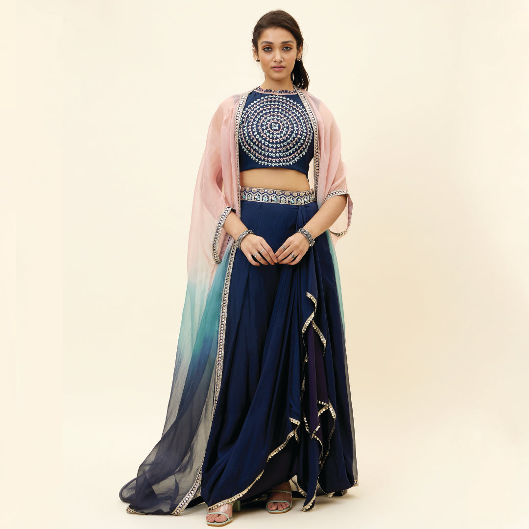 BLUE BUTTA EMB CROP TOP TEAMED WITH A DRAPE SKIRT AND EMBELLISHED ORGANZA OVERLAY