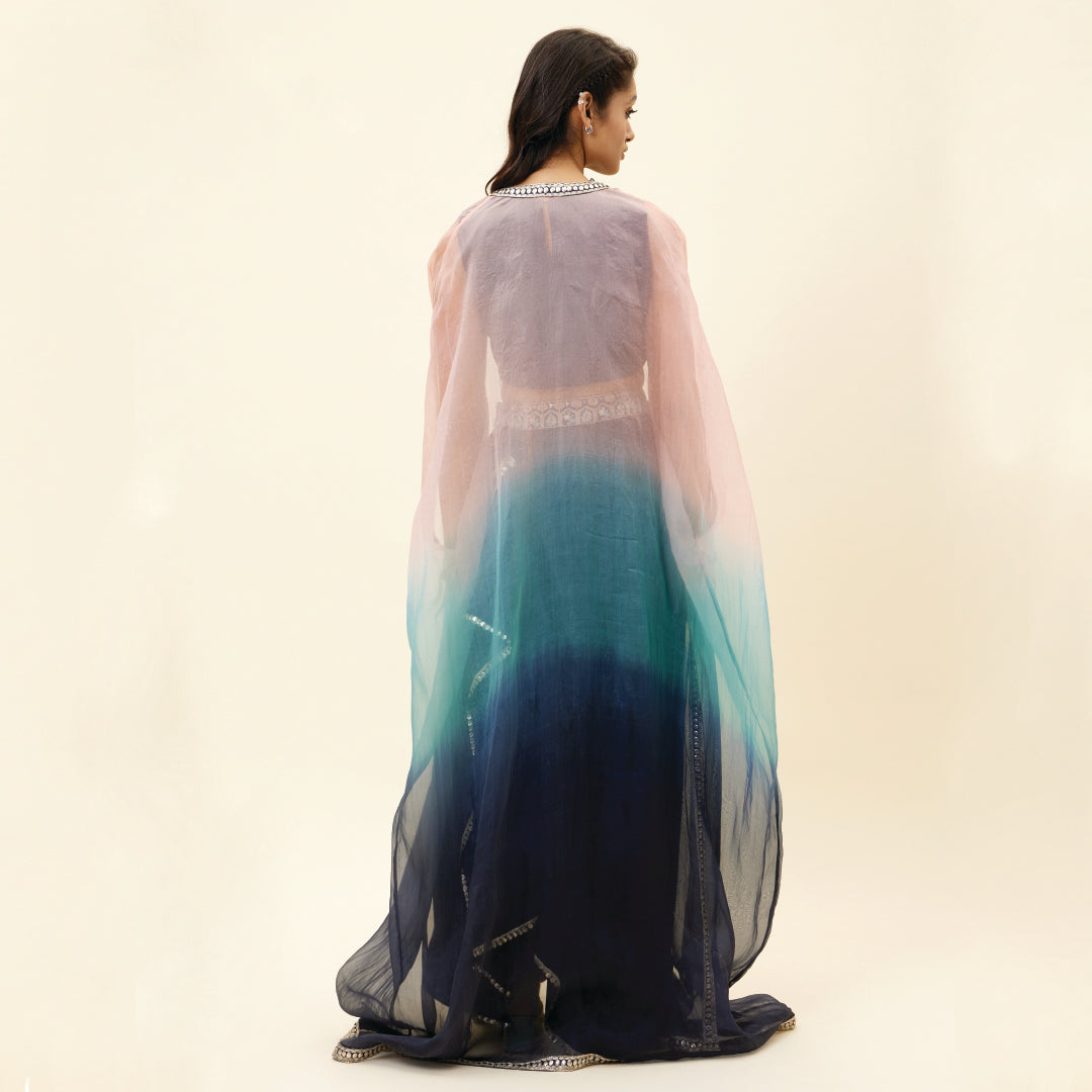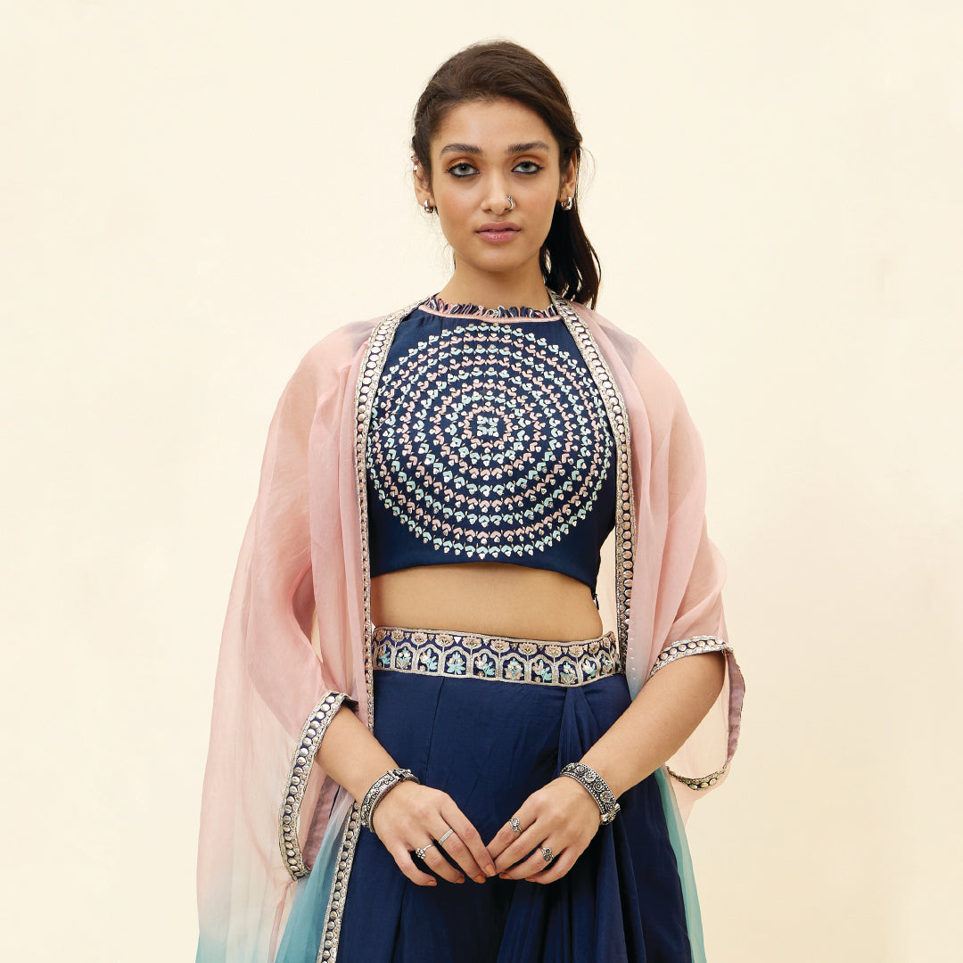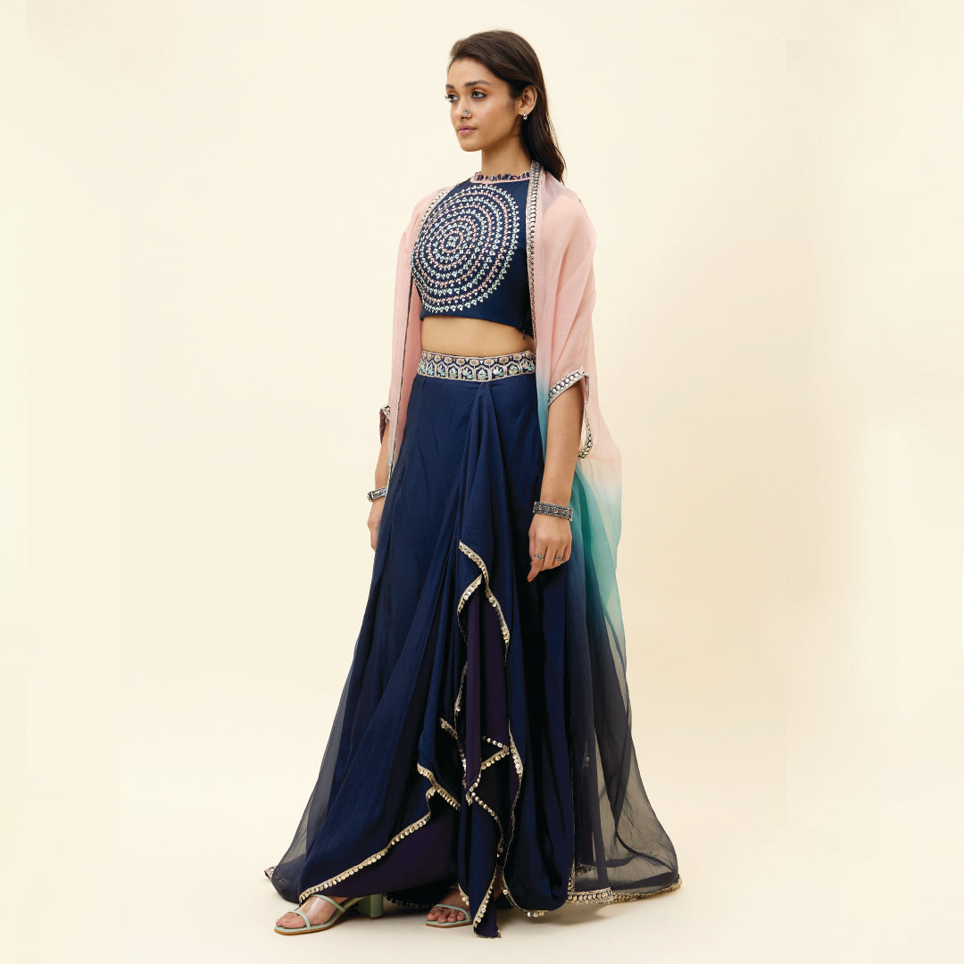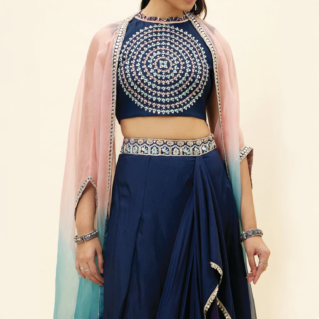 BLUE BUTTA EMB CROP TOP TEAMED WITH A DRAPE SKIRT AND EMBELLISHED ORGANZA OVERLAY