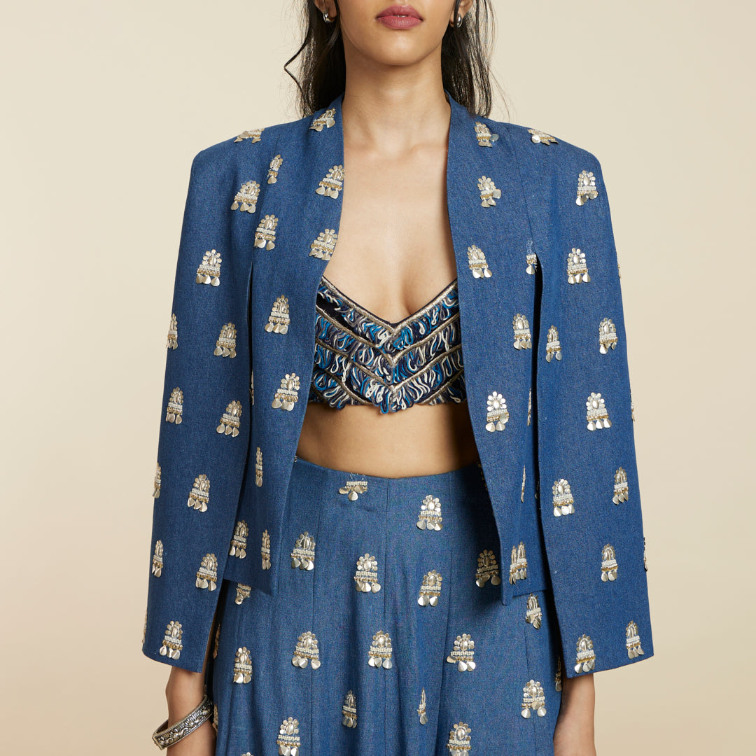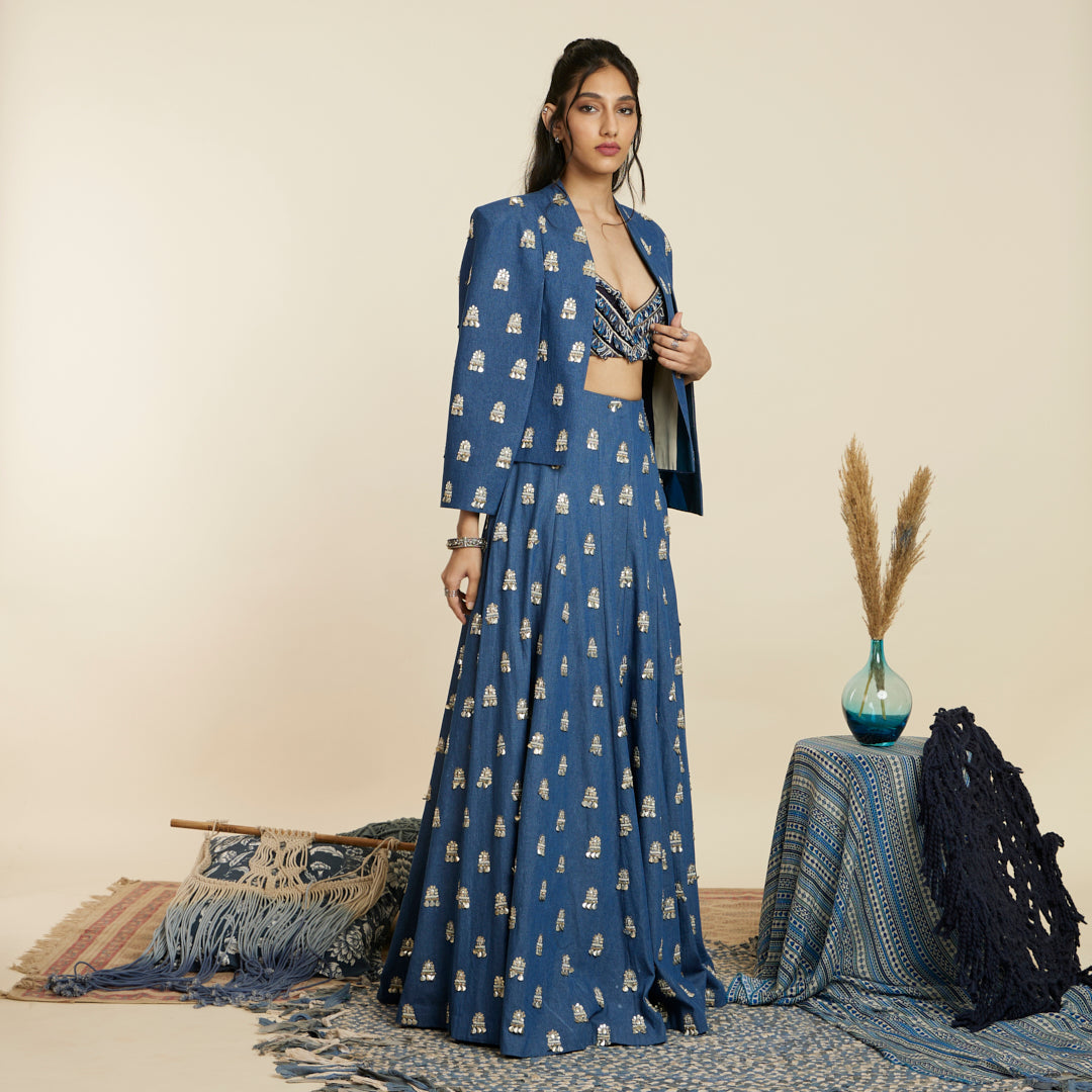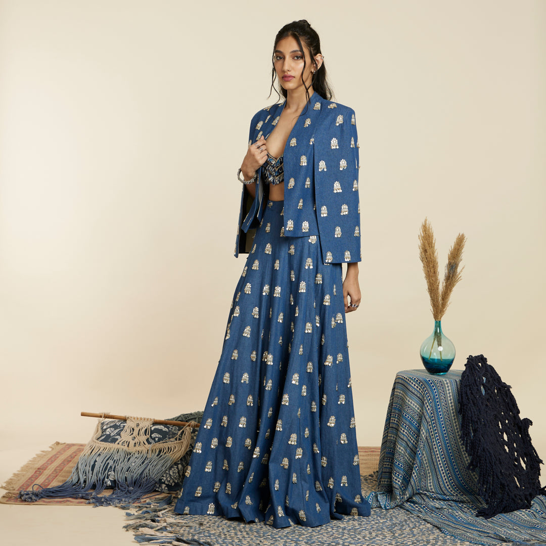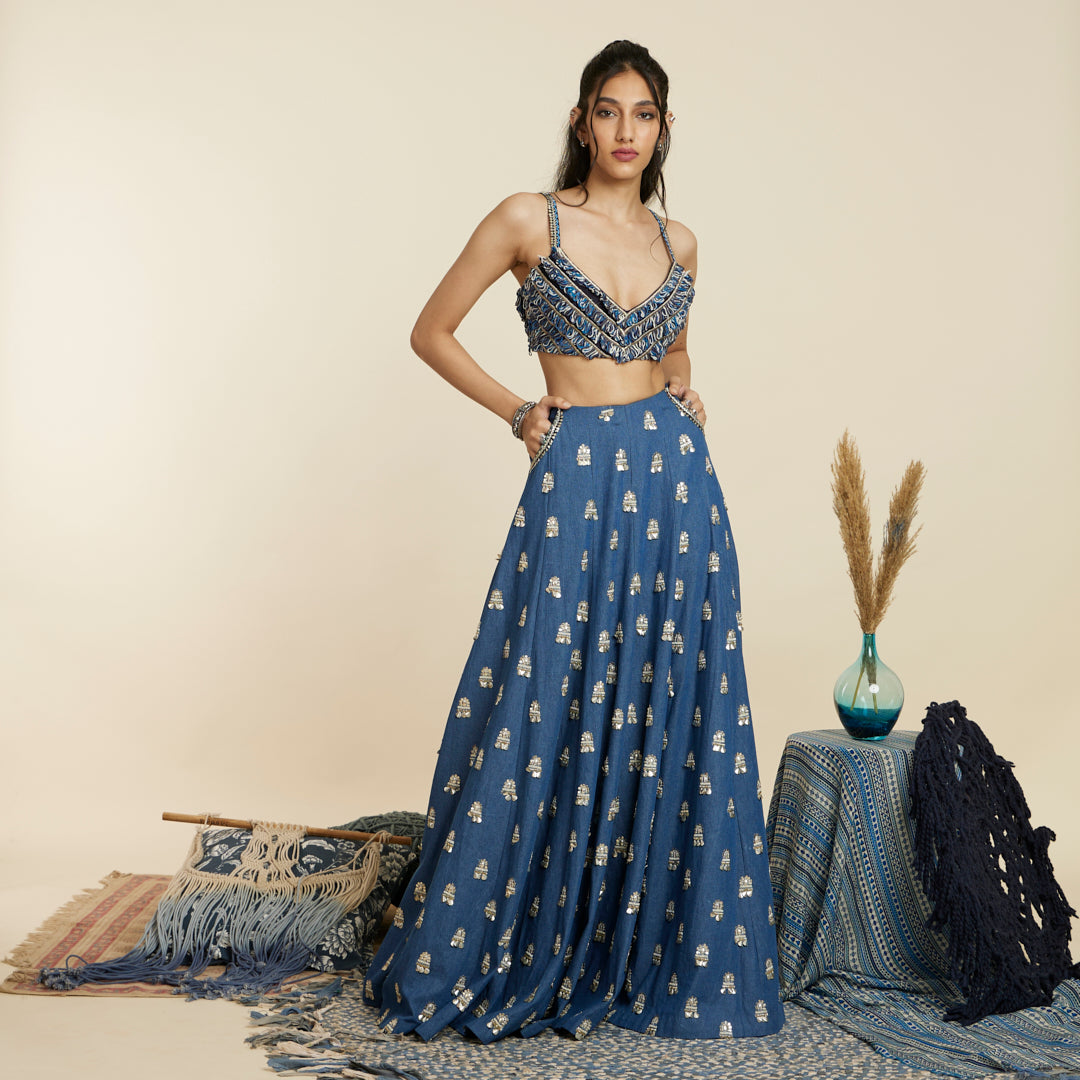 BLUE EMBELLISHED DENIM LEHENGA SET