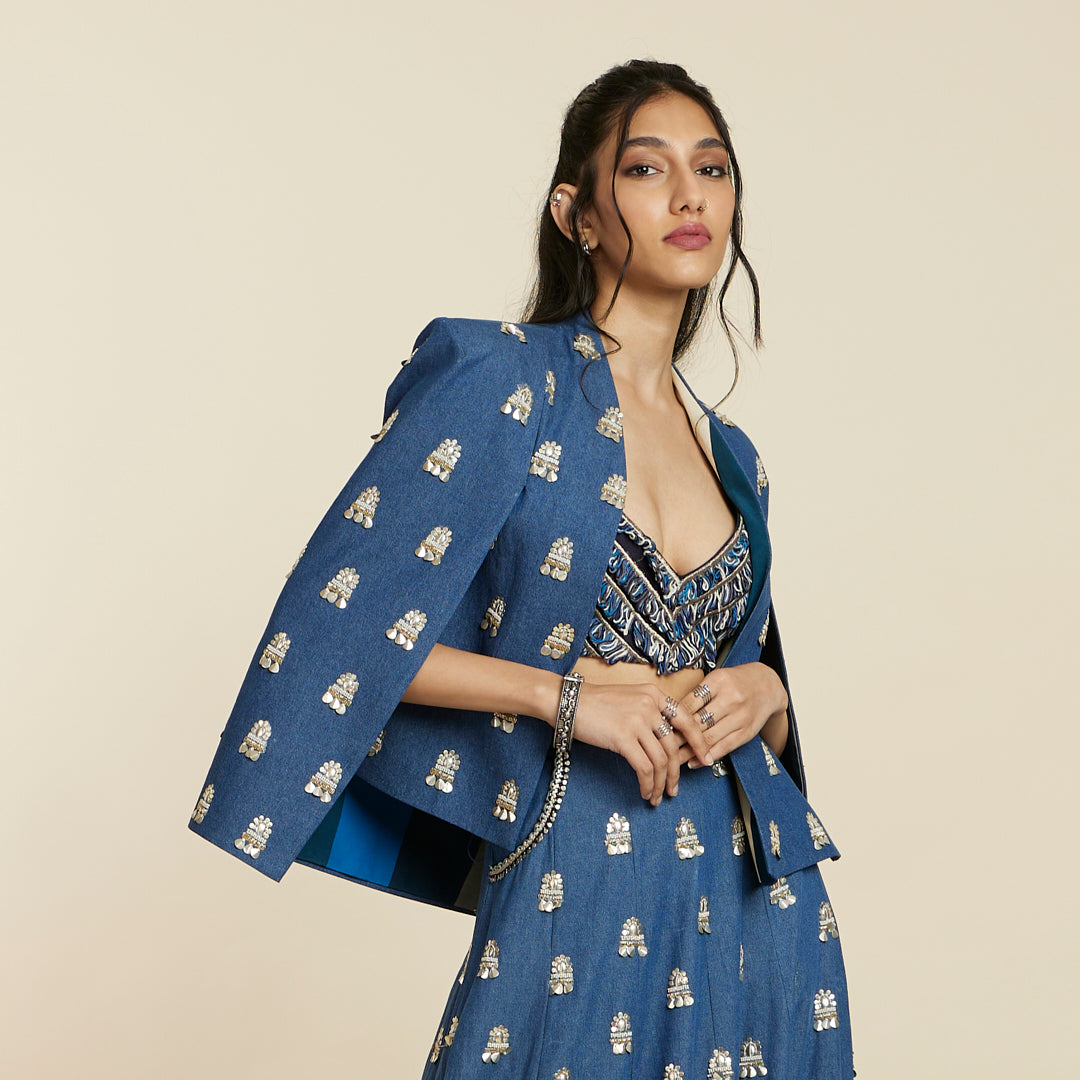 Featuring a blue embellished denim lehenga teamed textured bustier and highlighted noor jacket