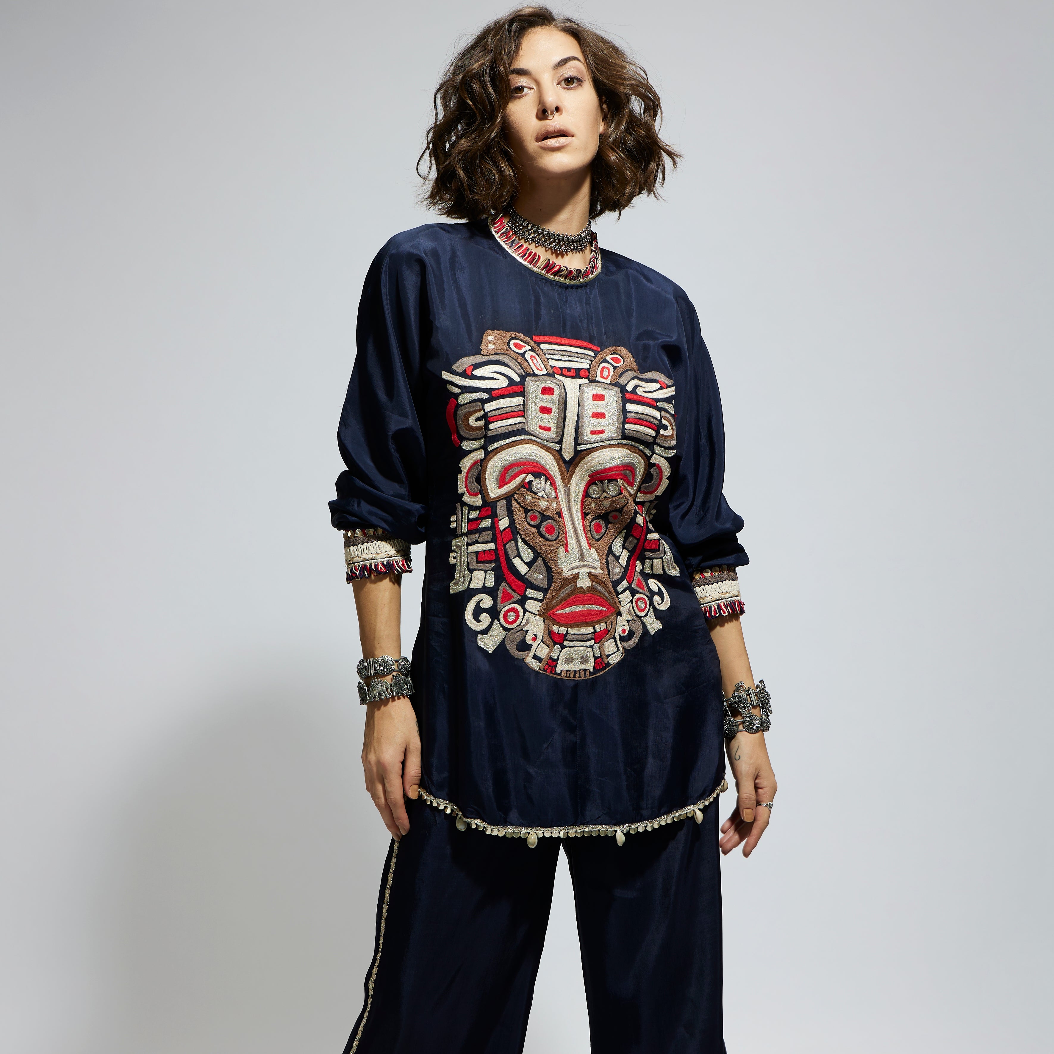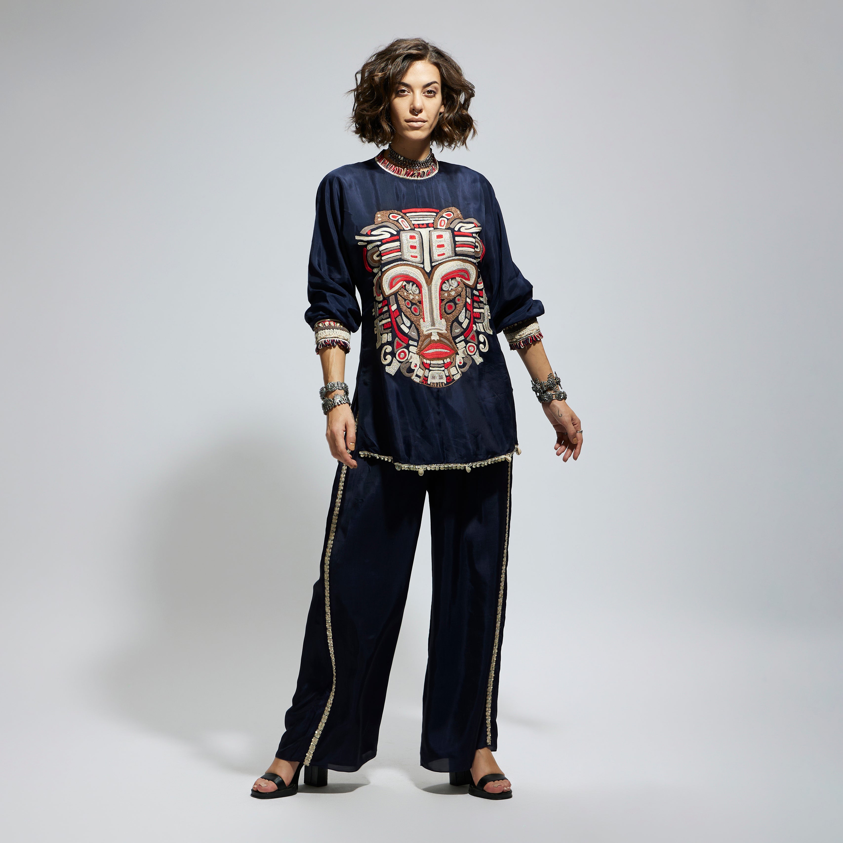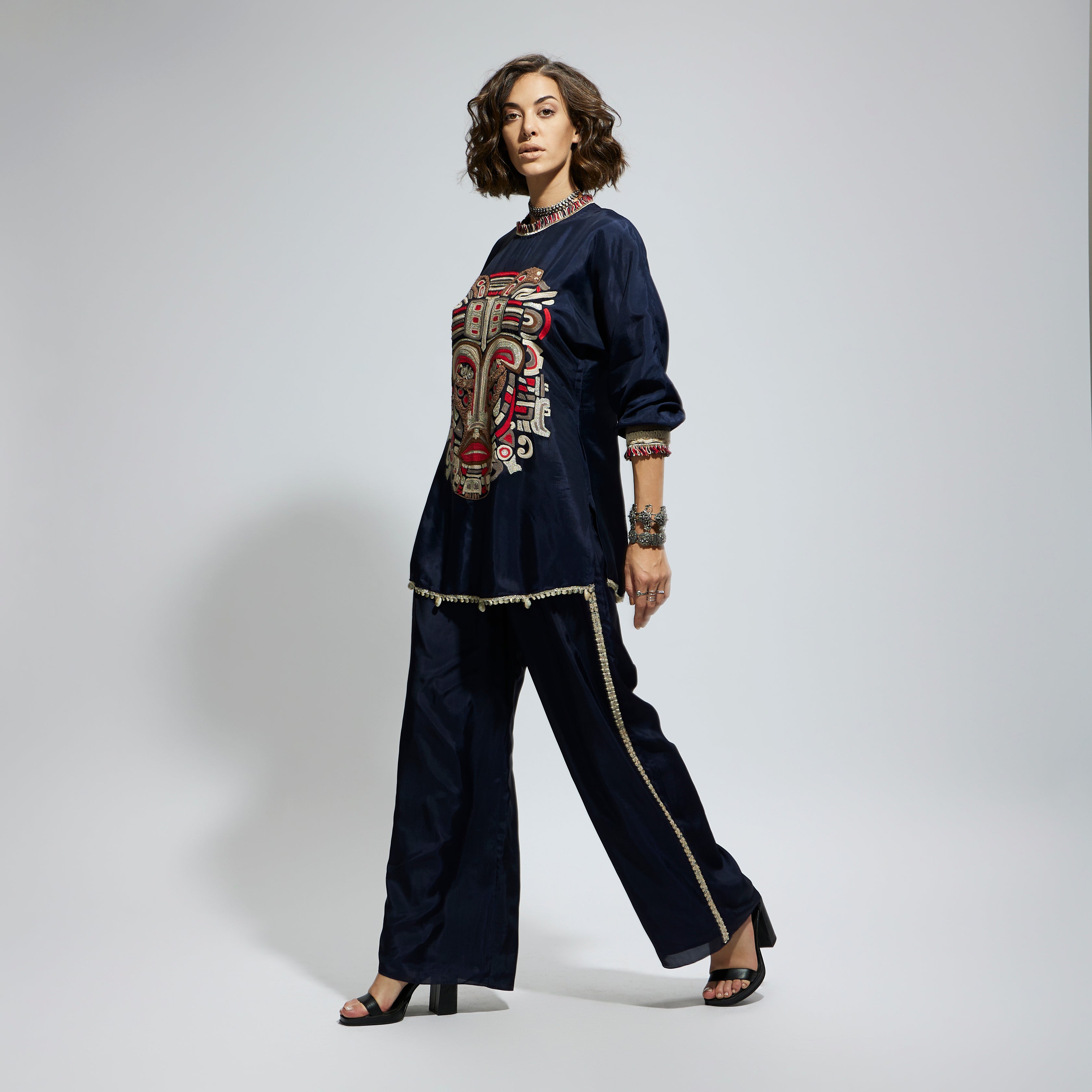 Featuring a blue embellished mask threadwork tunic set, fabric crepe, and component 2.