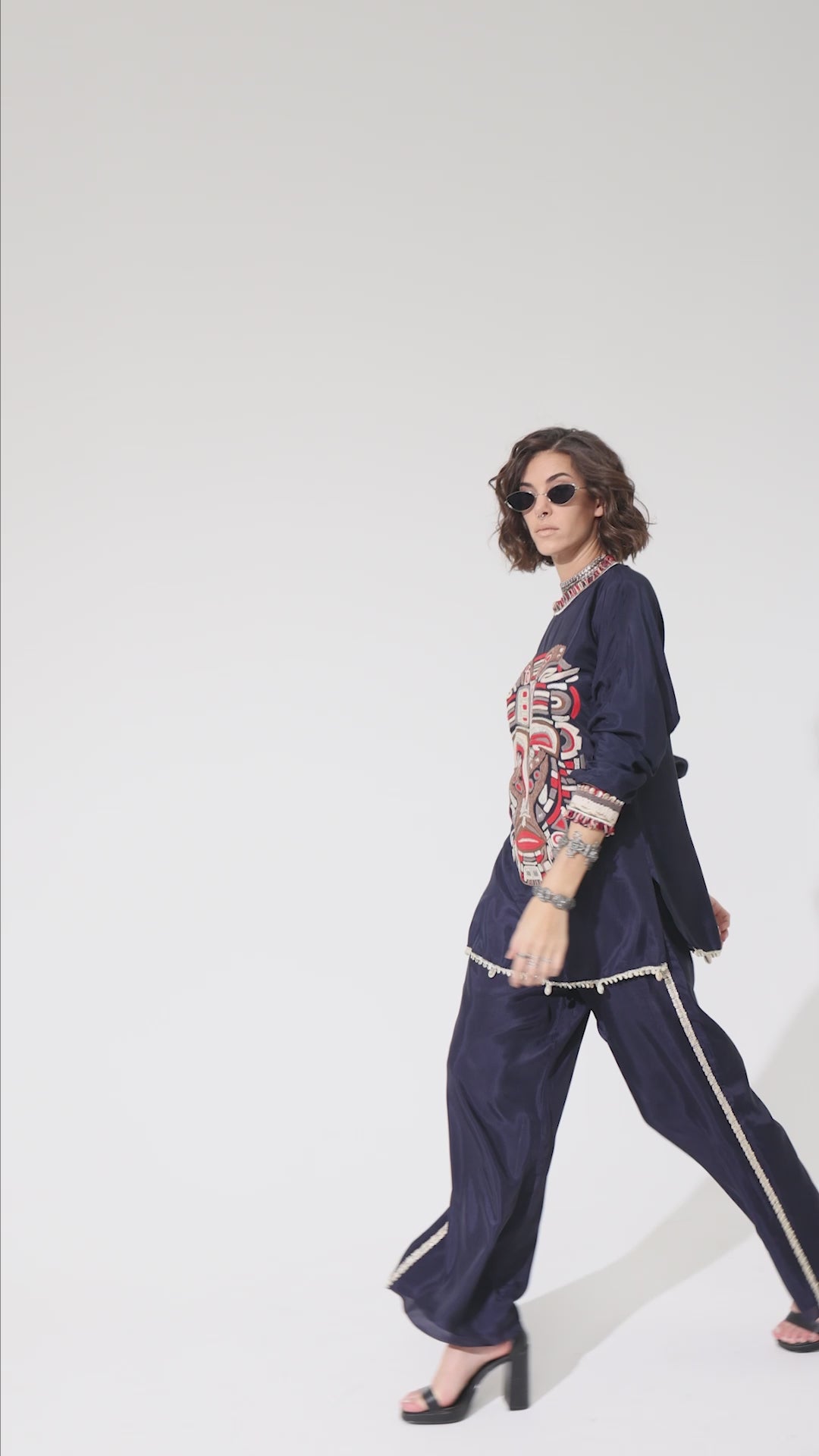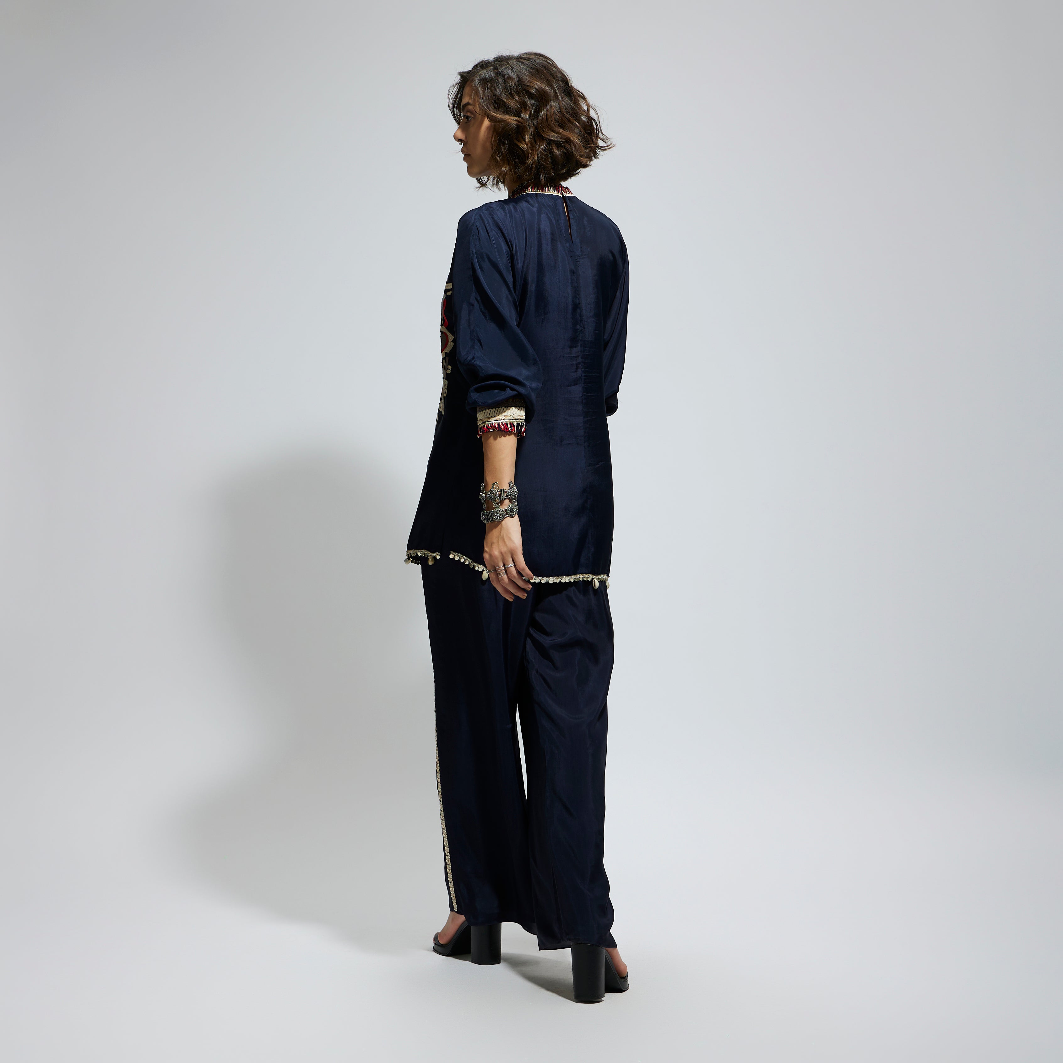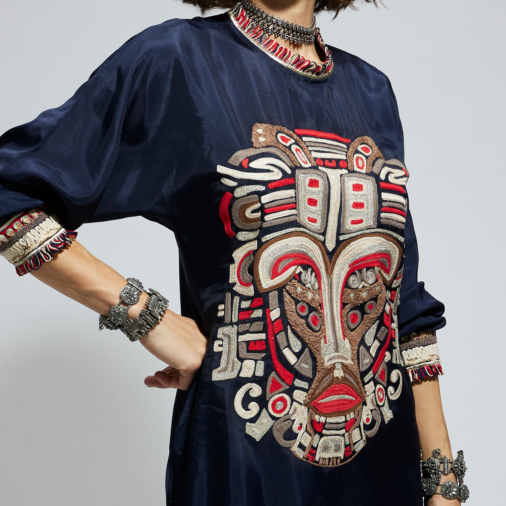 Featuring a blue embellished mask threadwork tunic set, fabric crepe, and component 2.