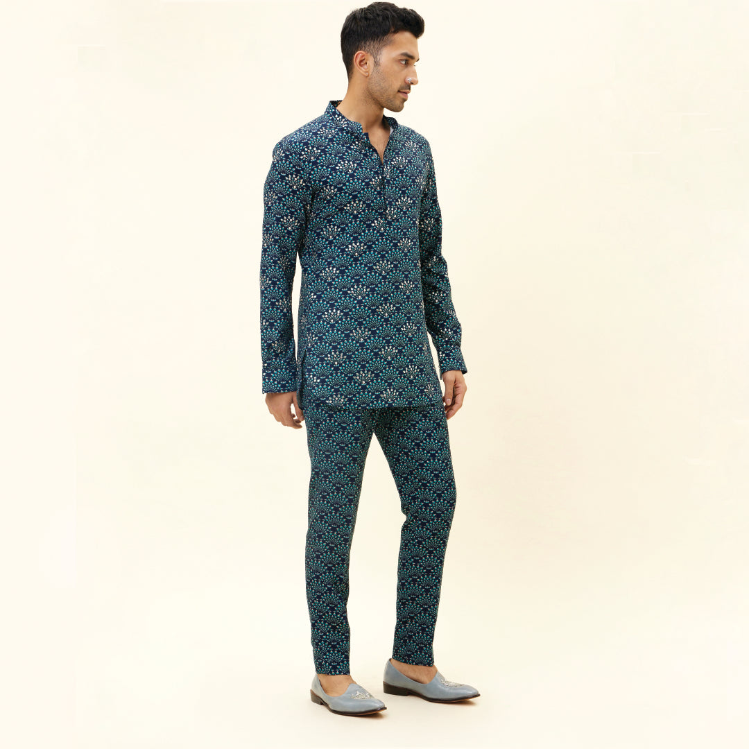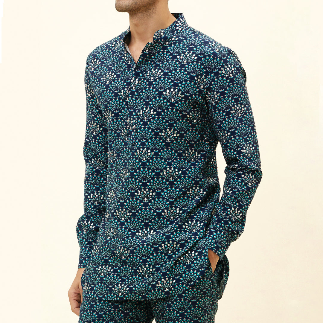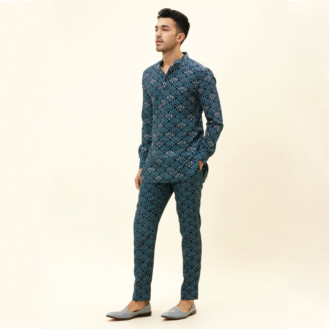 BLUE FEATHER PRINT FRONT TIE UP TUNIC SET