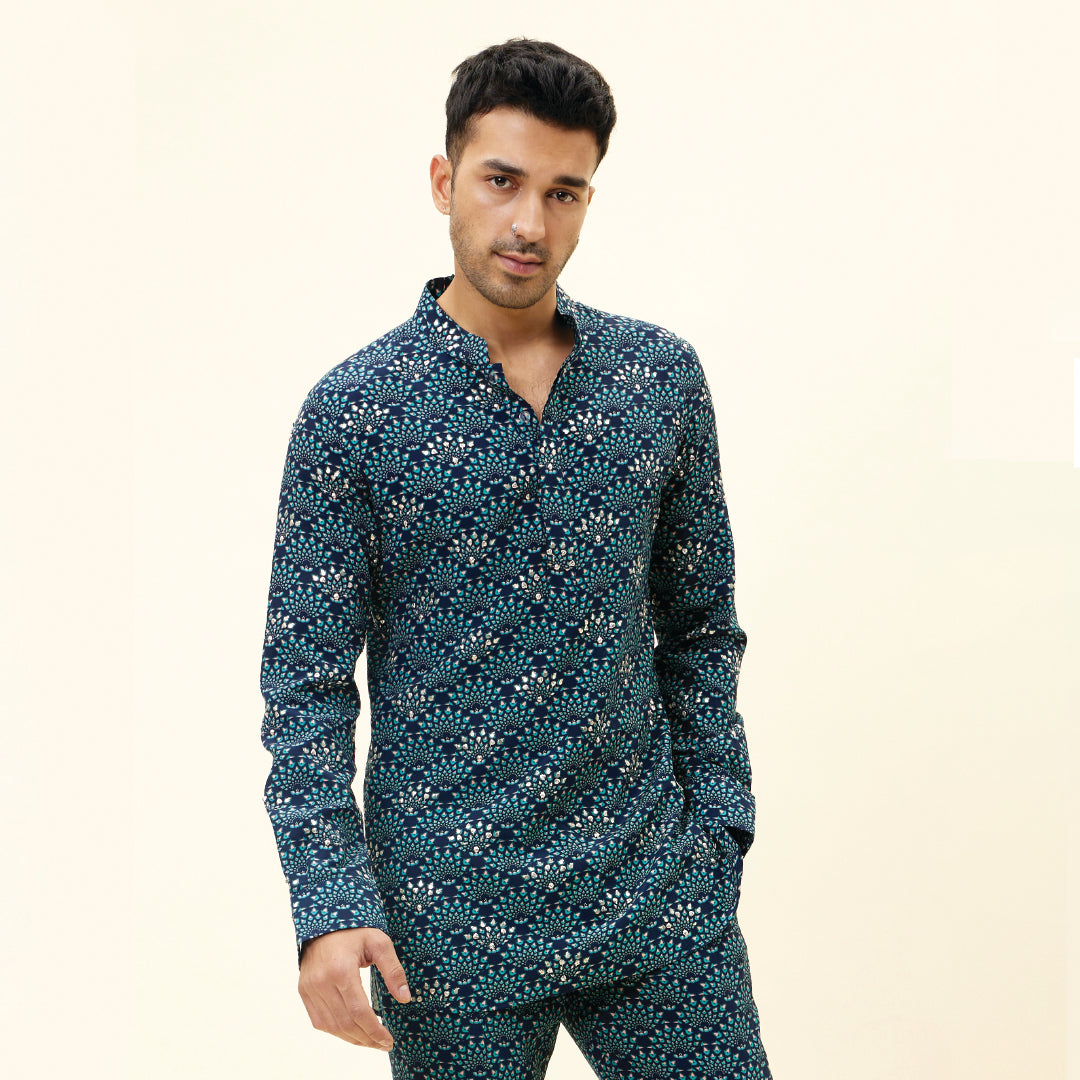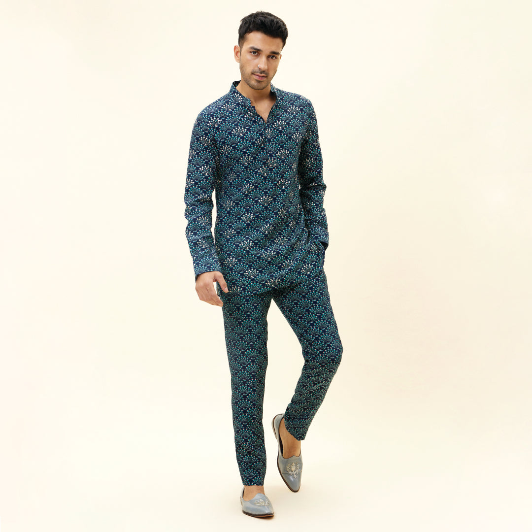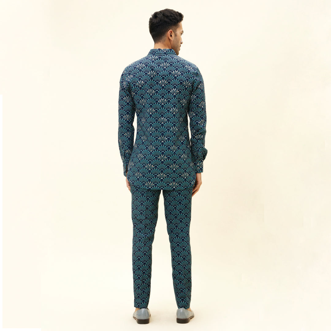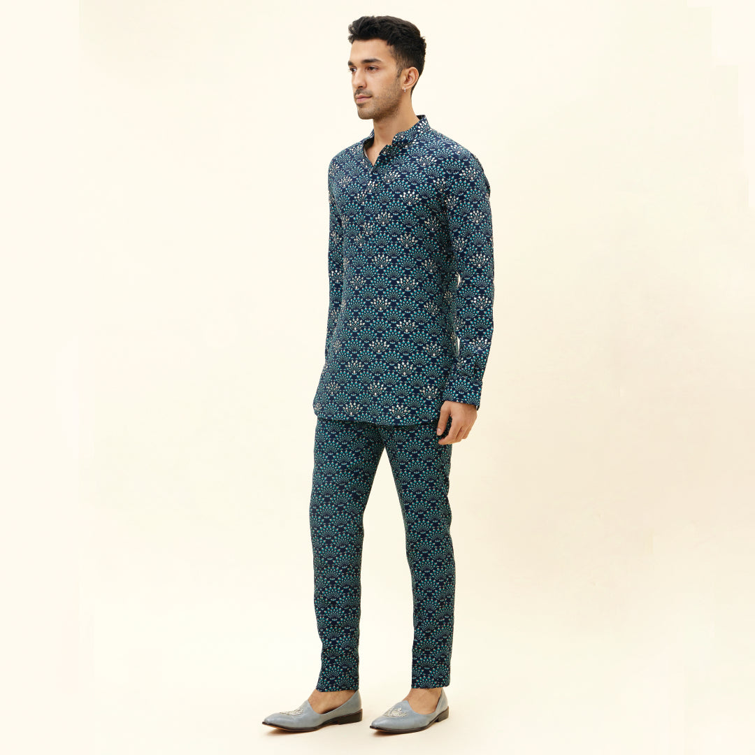 BLUE FEATHER PRINT FRONT TIE UP TUNIC SET