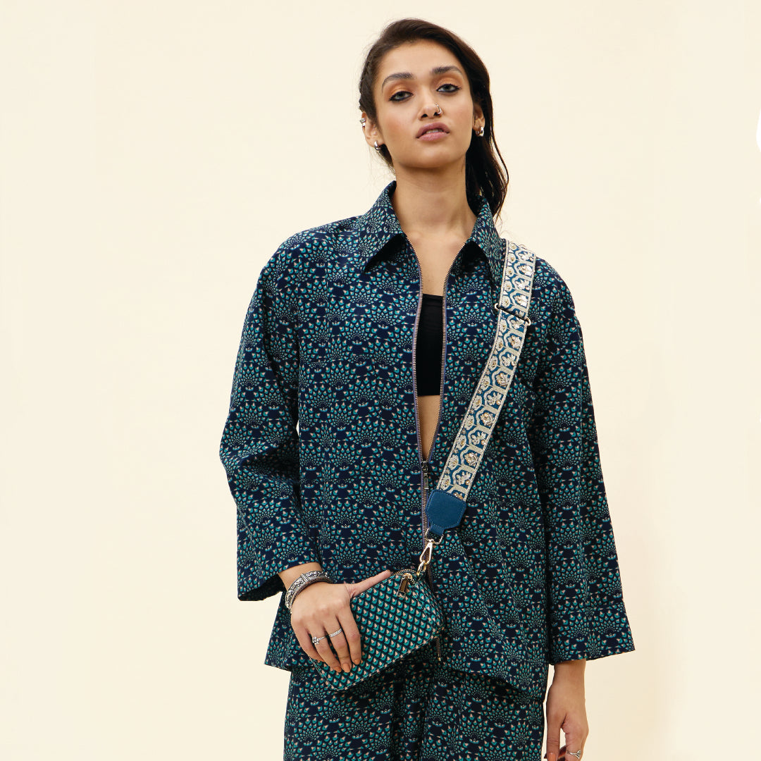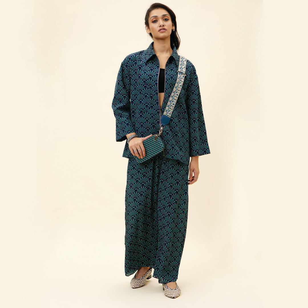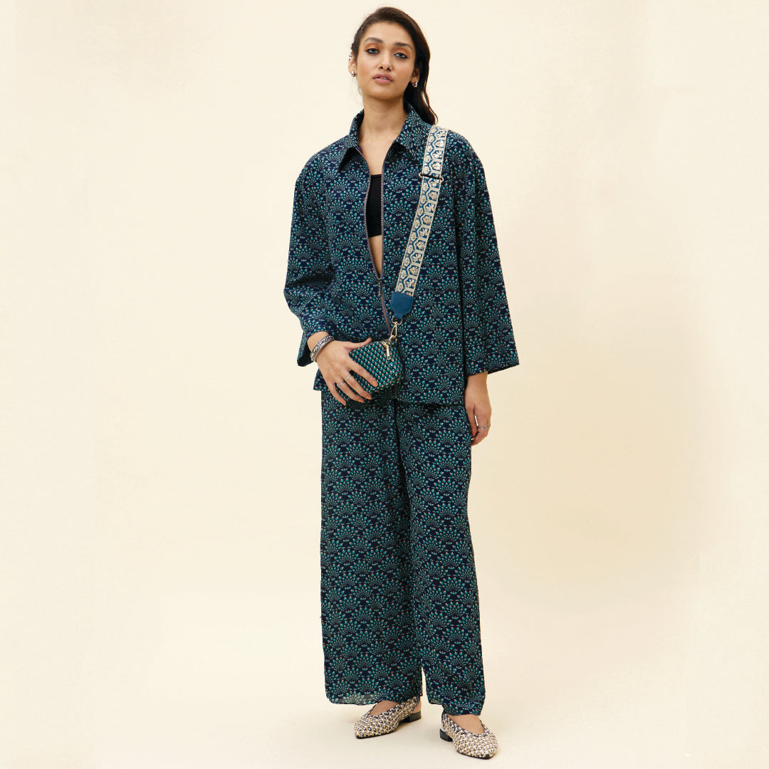 BLUE FEATHER PRINT OVERSIZED SHAKET WITH PANTS