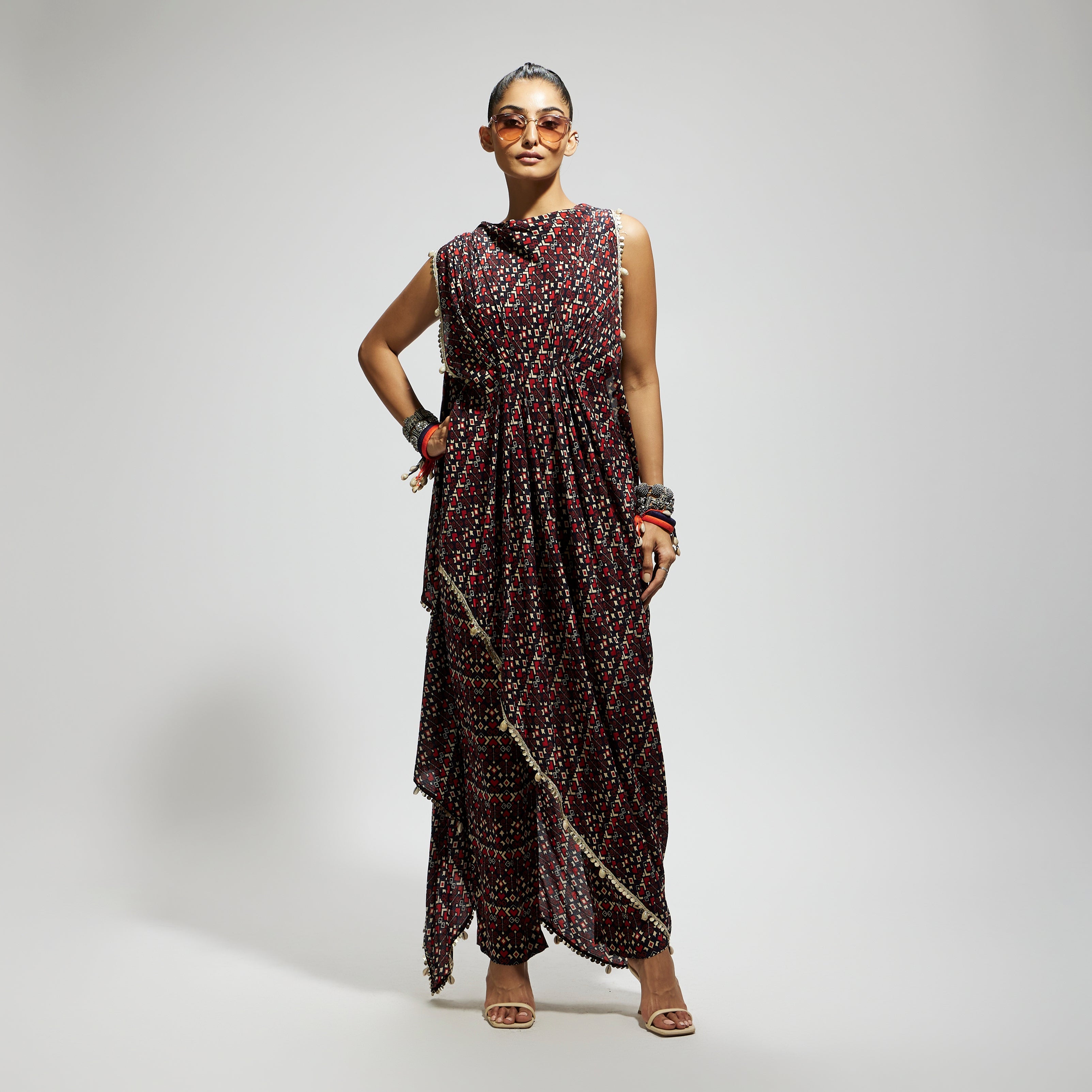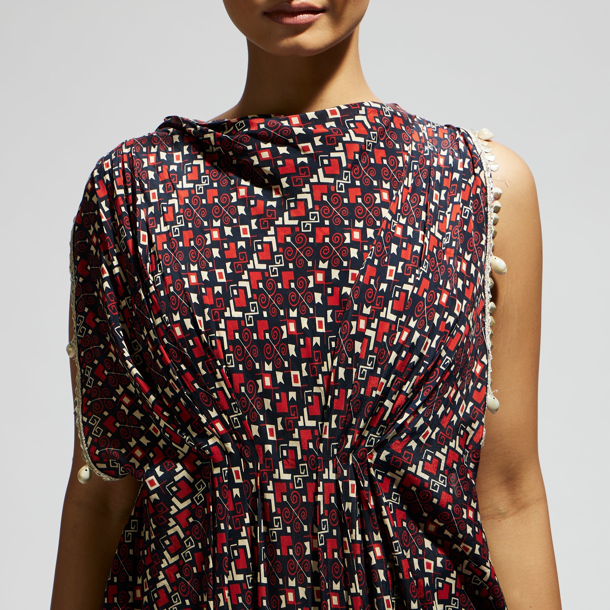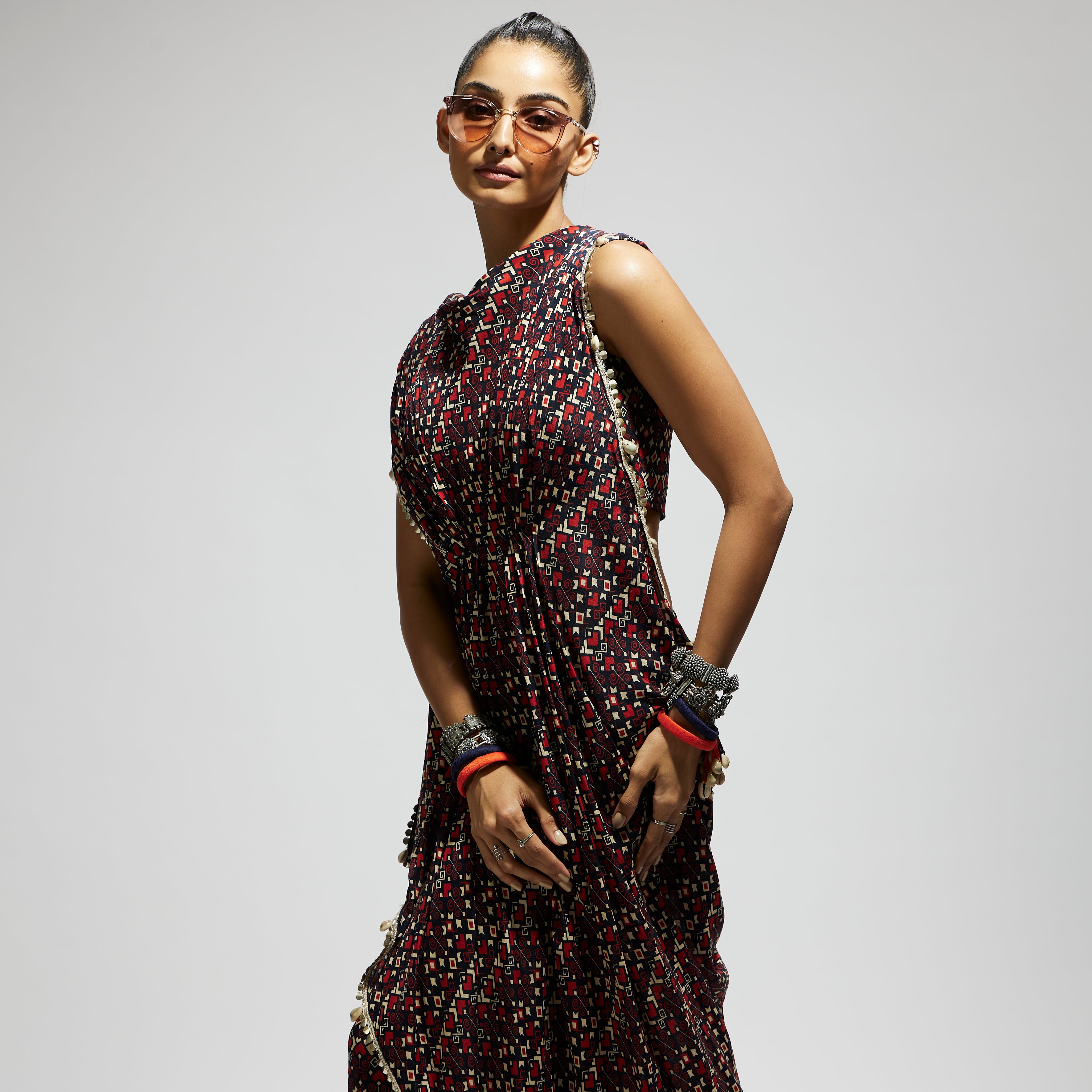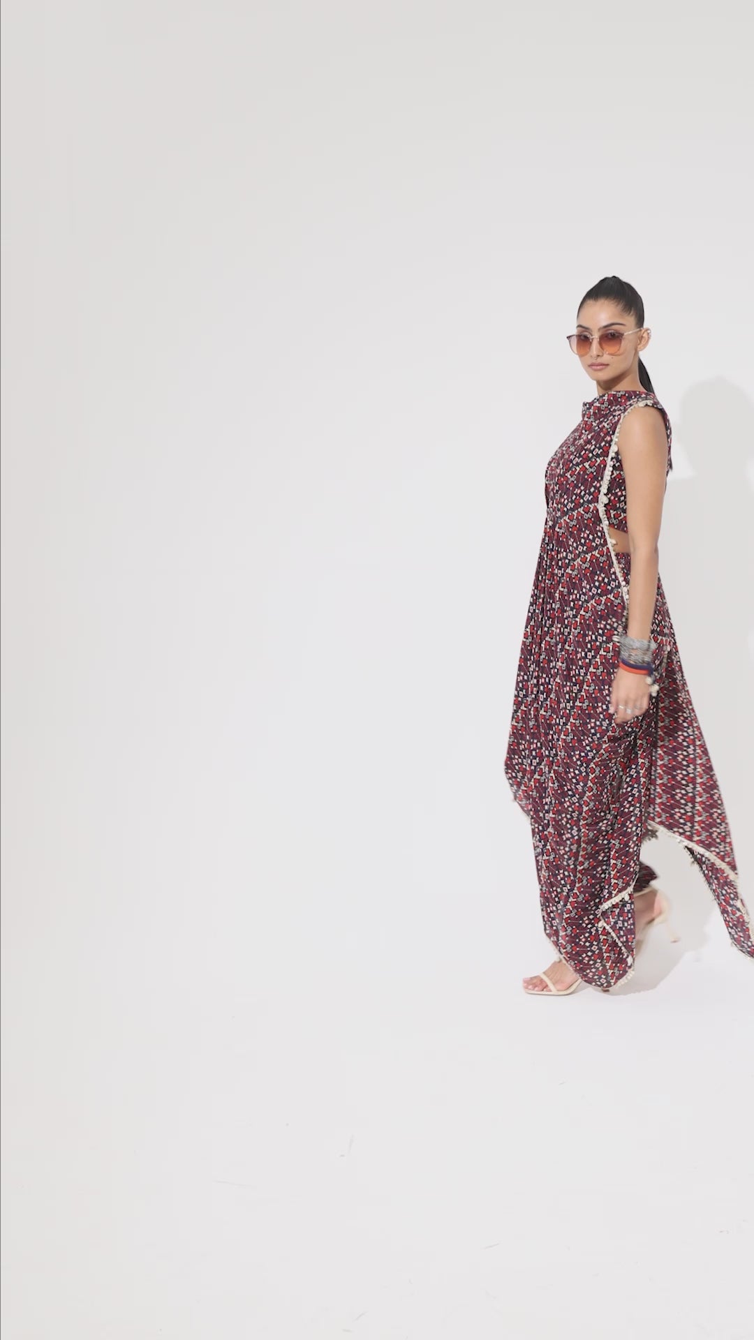 The blue geo print with attached drape and Kodi tassel border with pant, Fabric Crepe, Component 2.