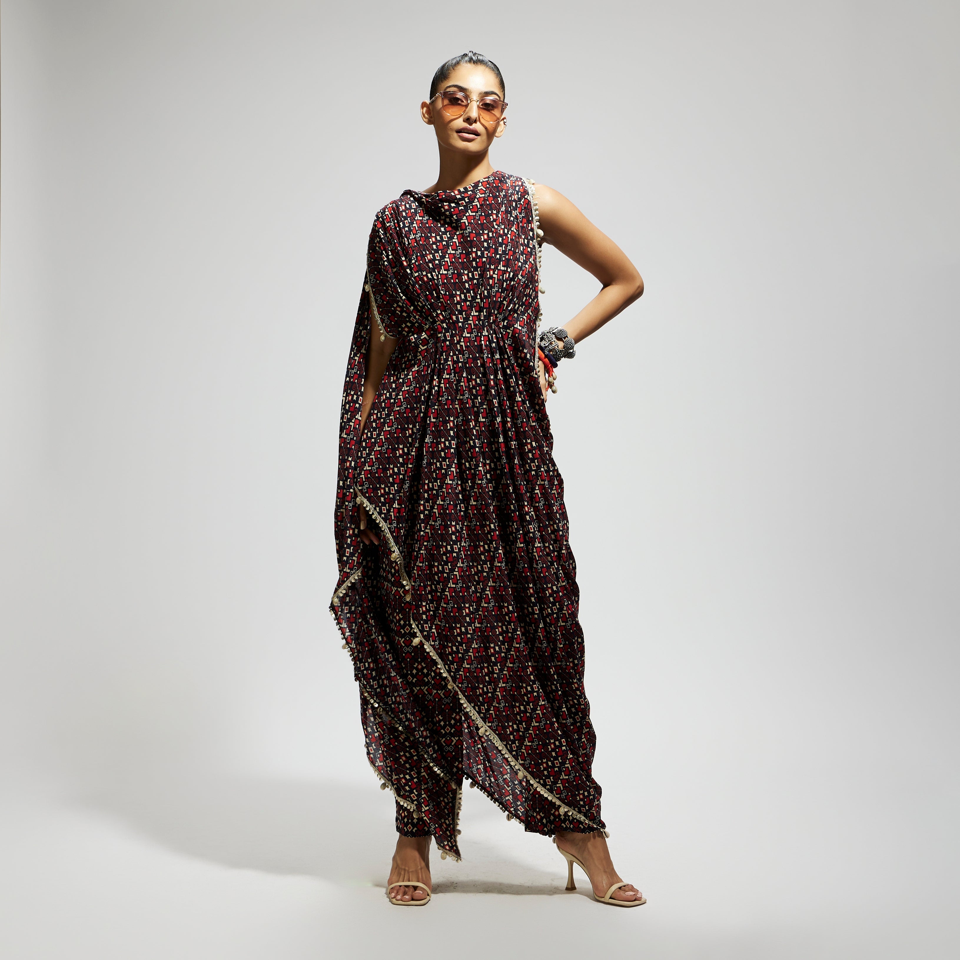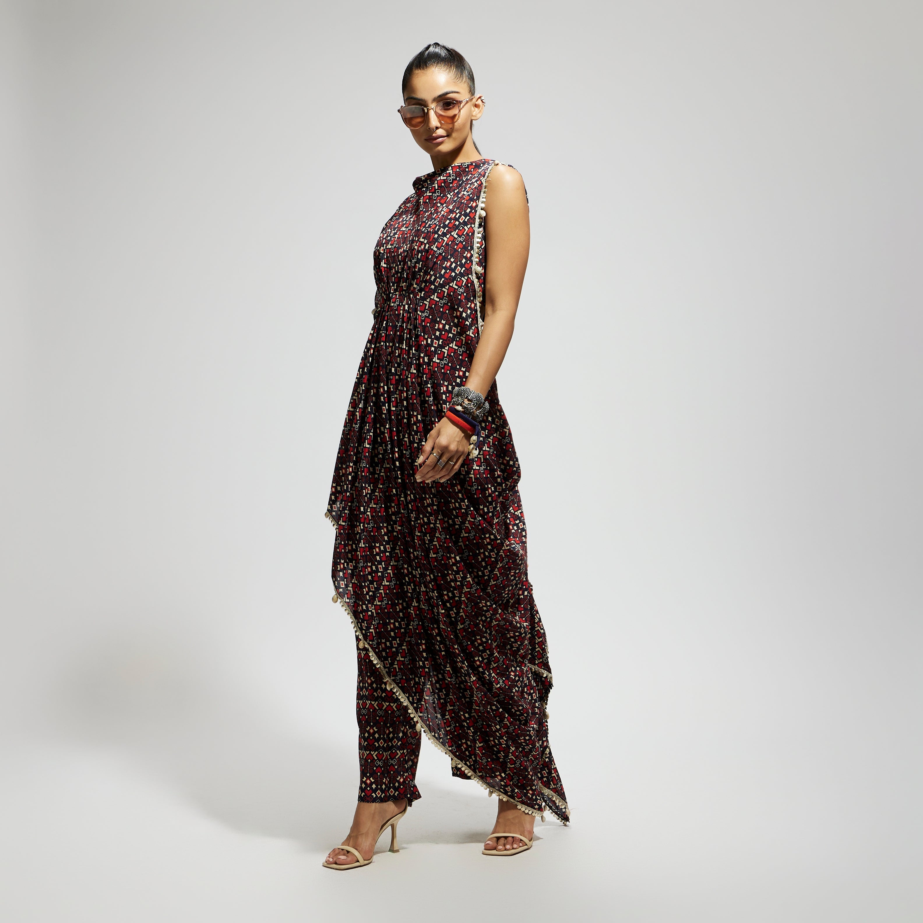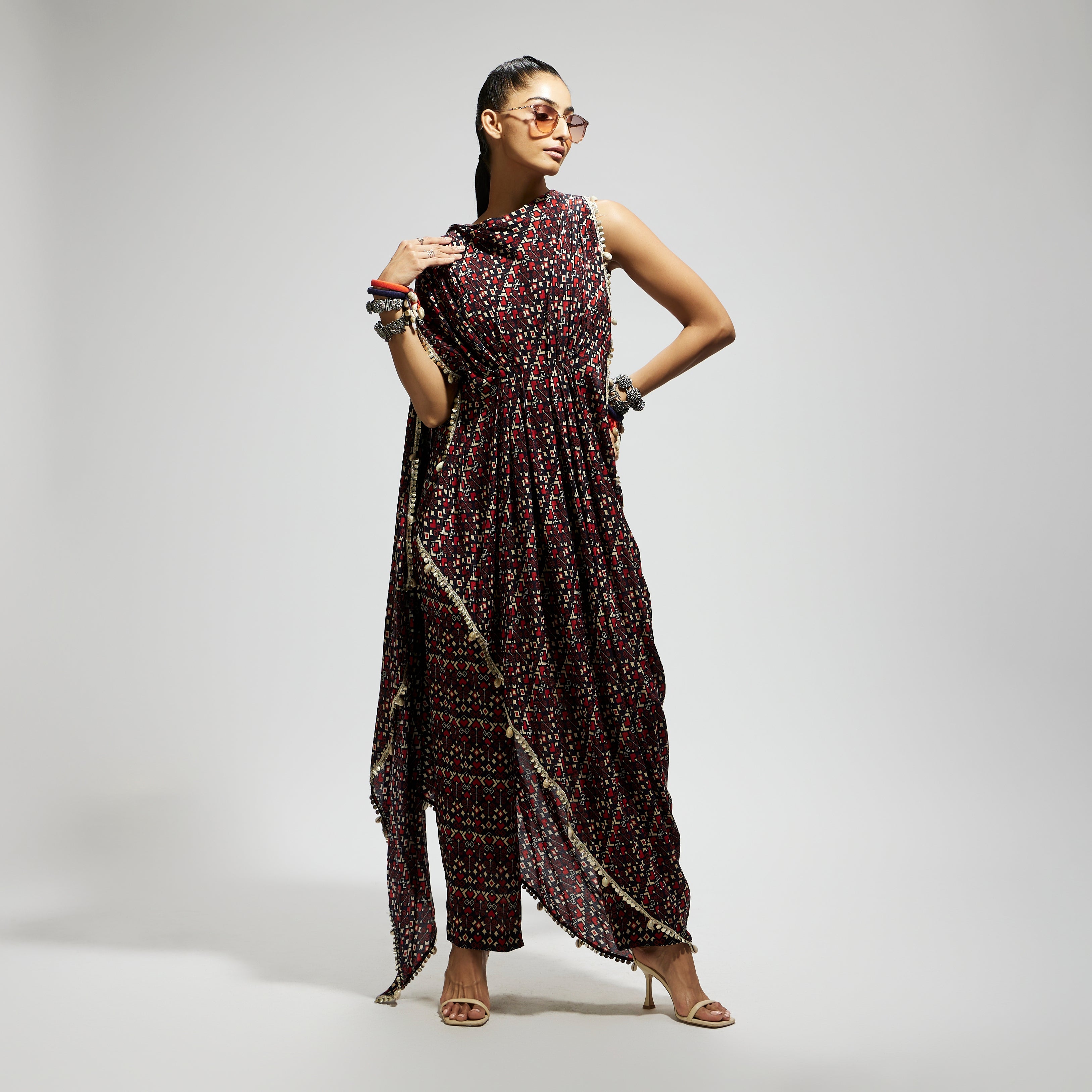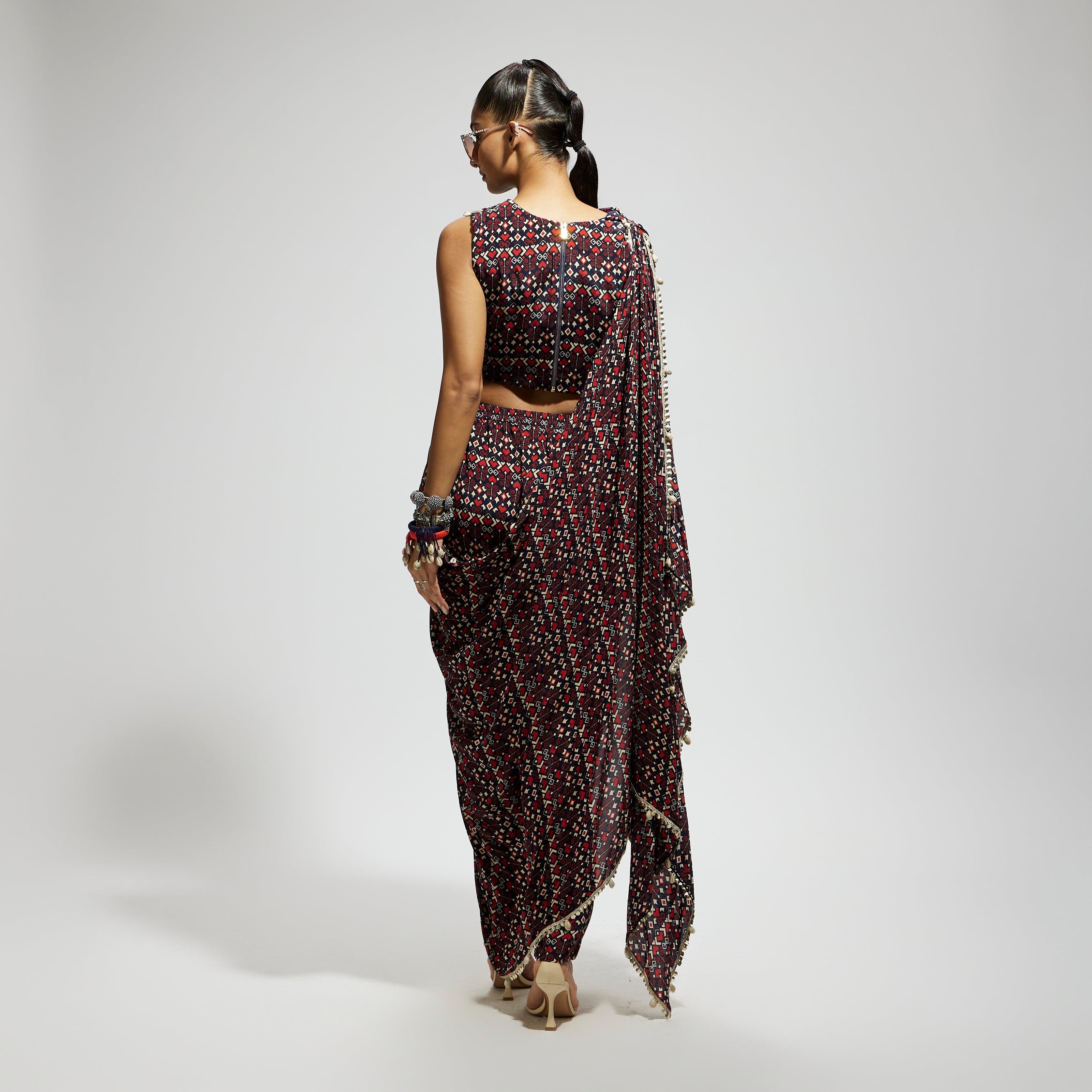The blue geo print with attached drape and Kodi tassel border with pant, Fabric Crepe, Component 2.