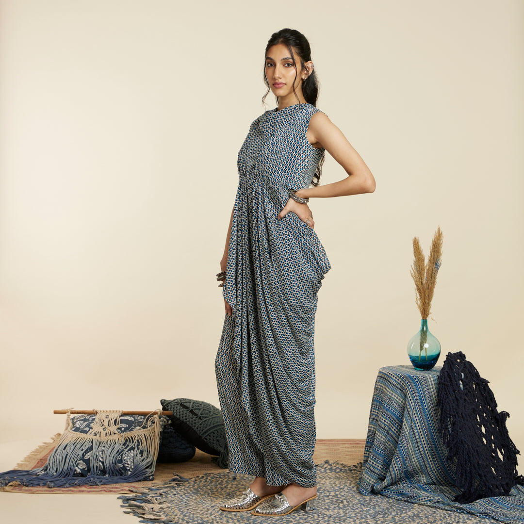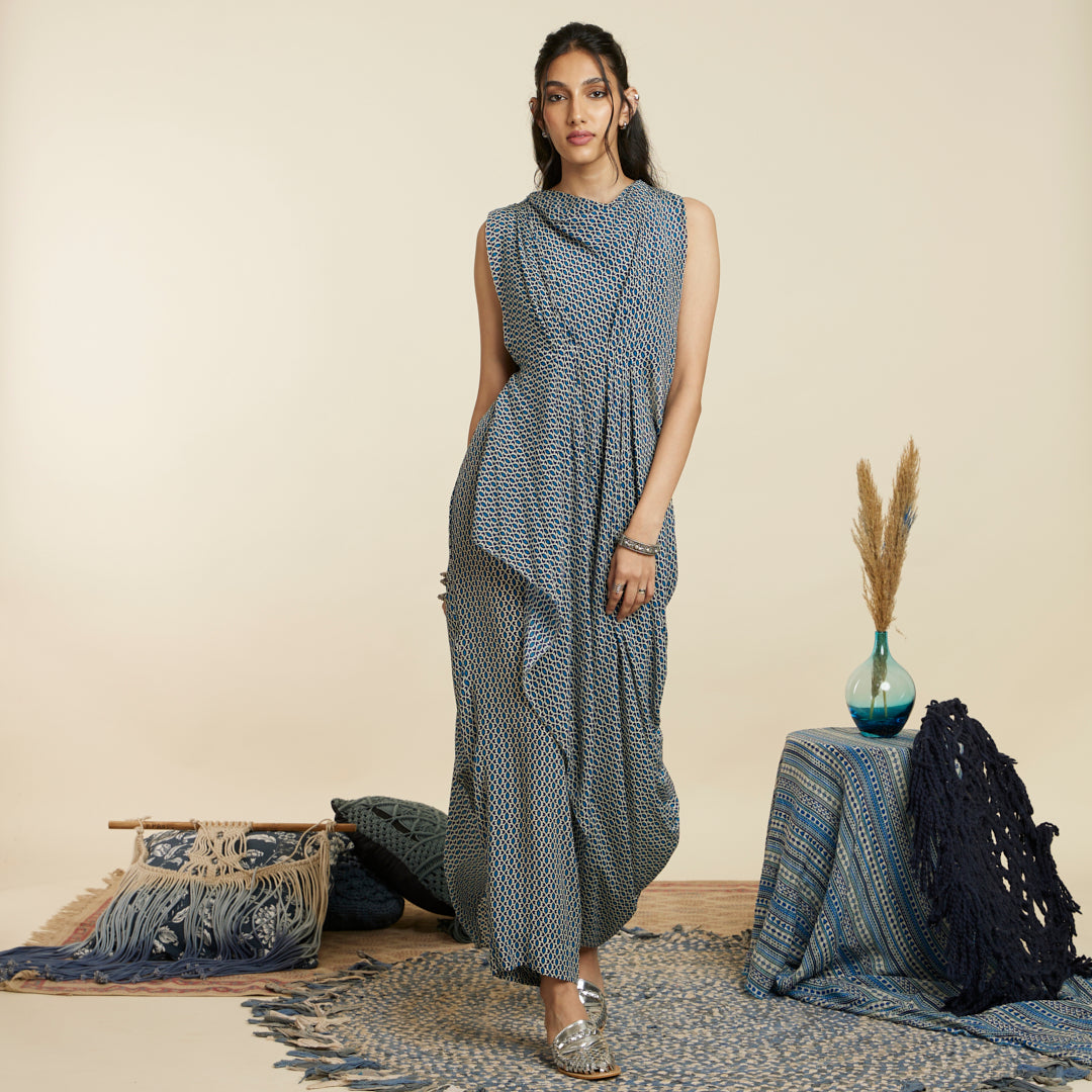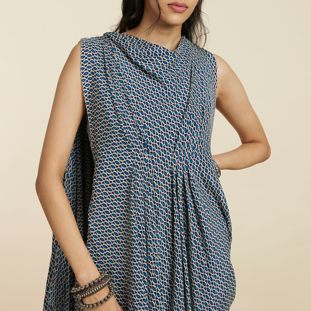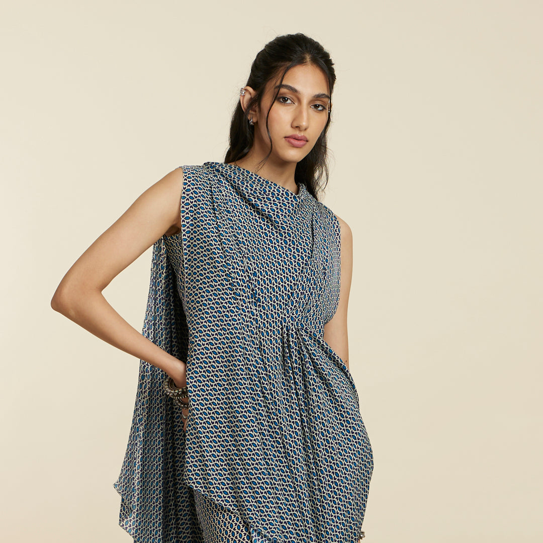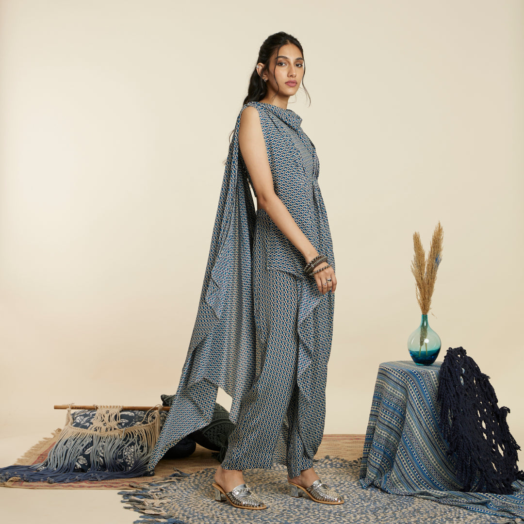 BLUE GEOMETRIC PRINT CROP TOP WITH ATTACHED DRAPE WITH PANTS