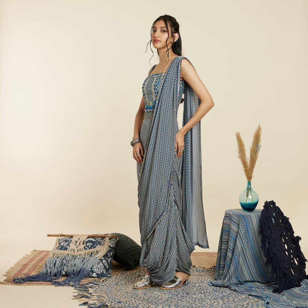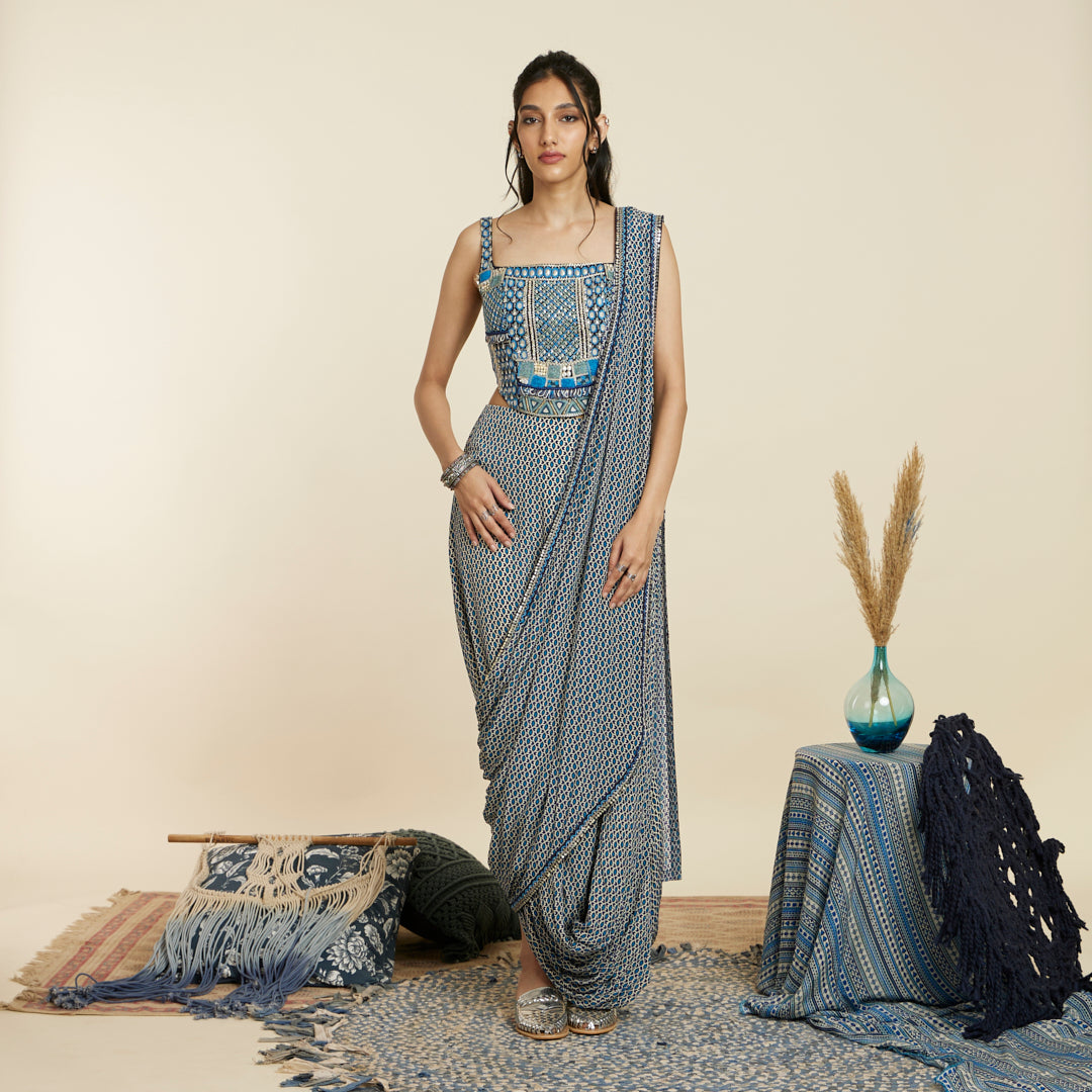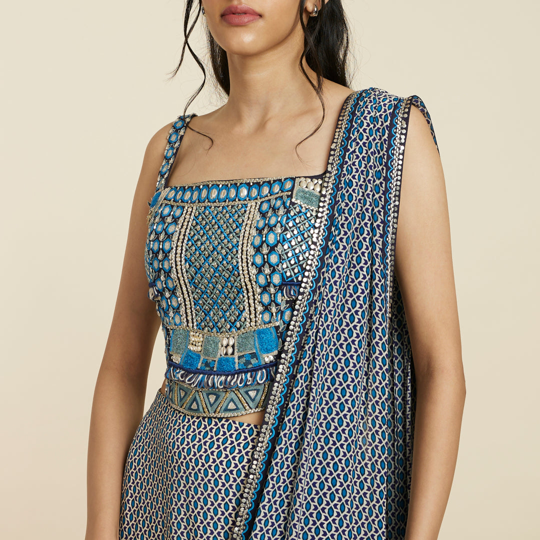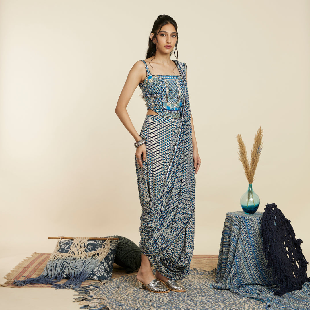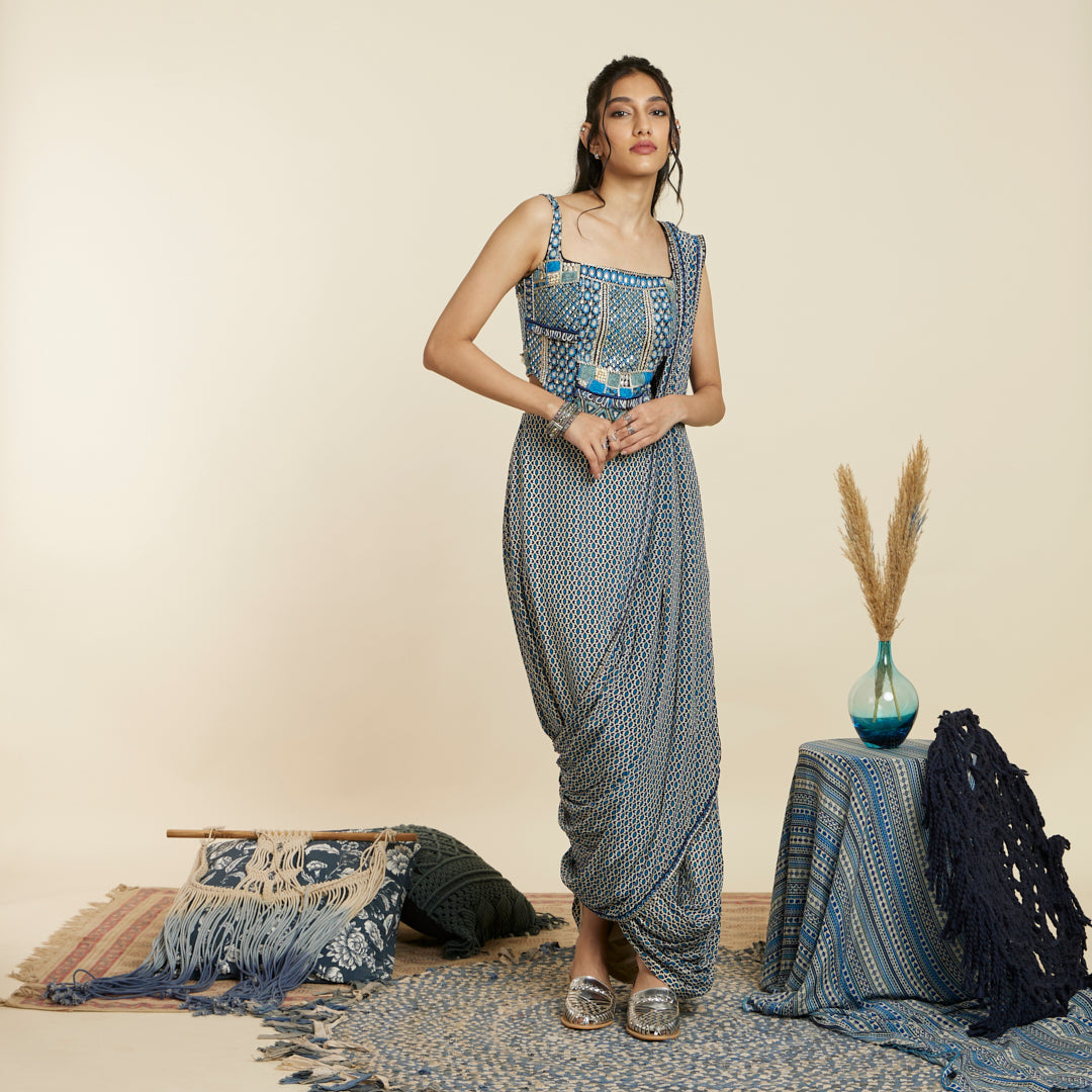 Featuring a blue embellished corset paired with blue geometric print drape skirt with attached drape