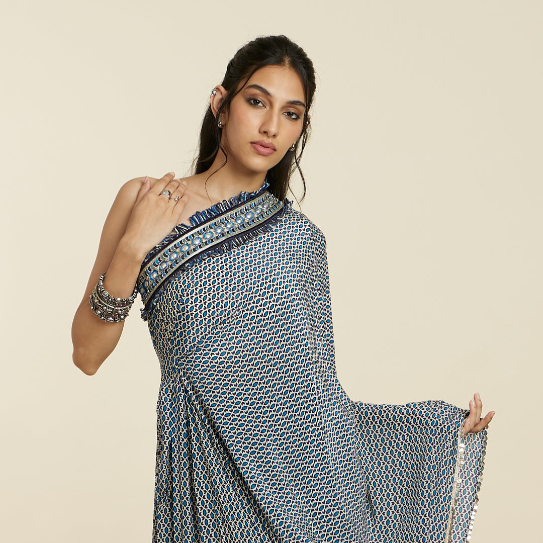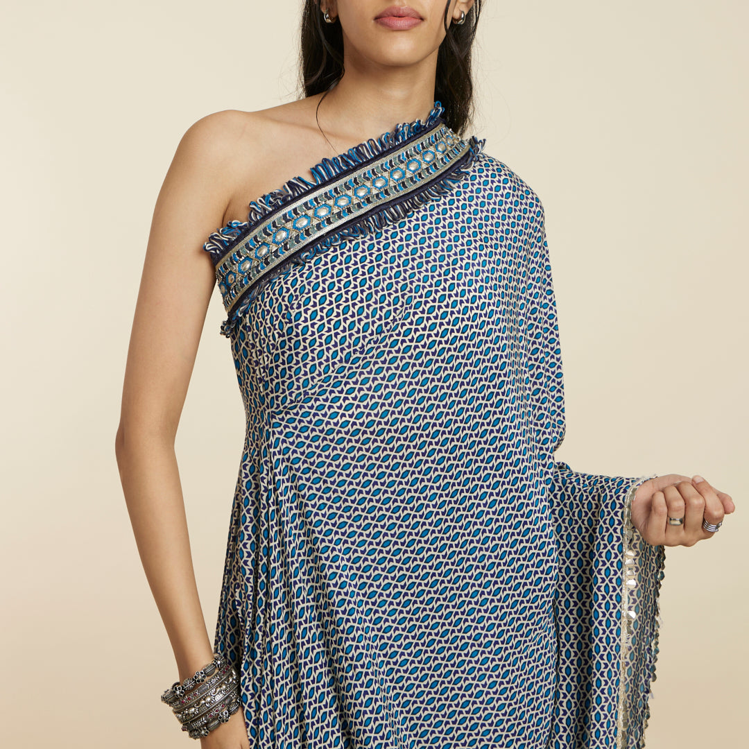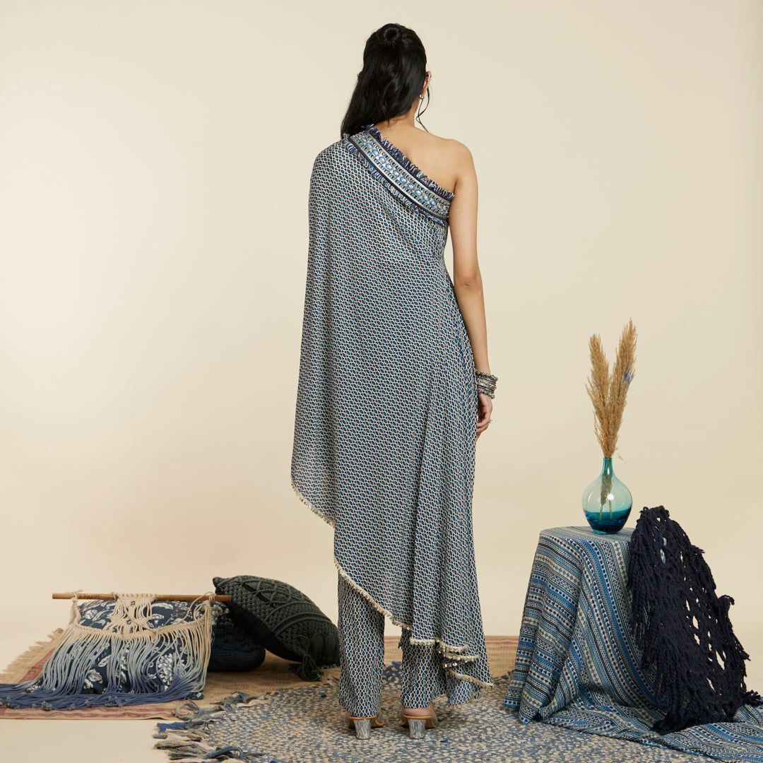 BLUE GEOMETRIC PRINT ONE SHOULDER SAREE WITH PANTS