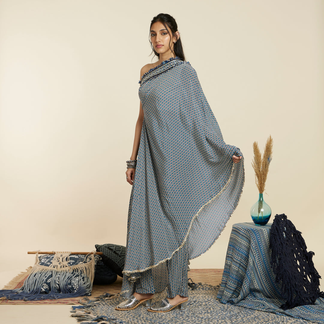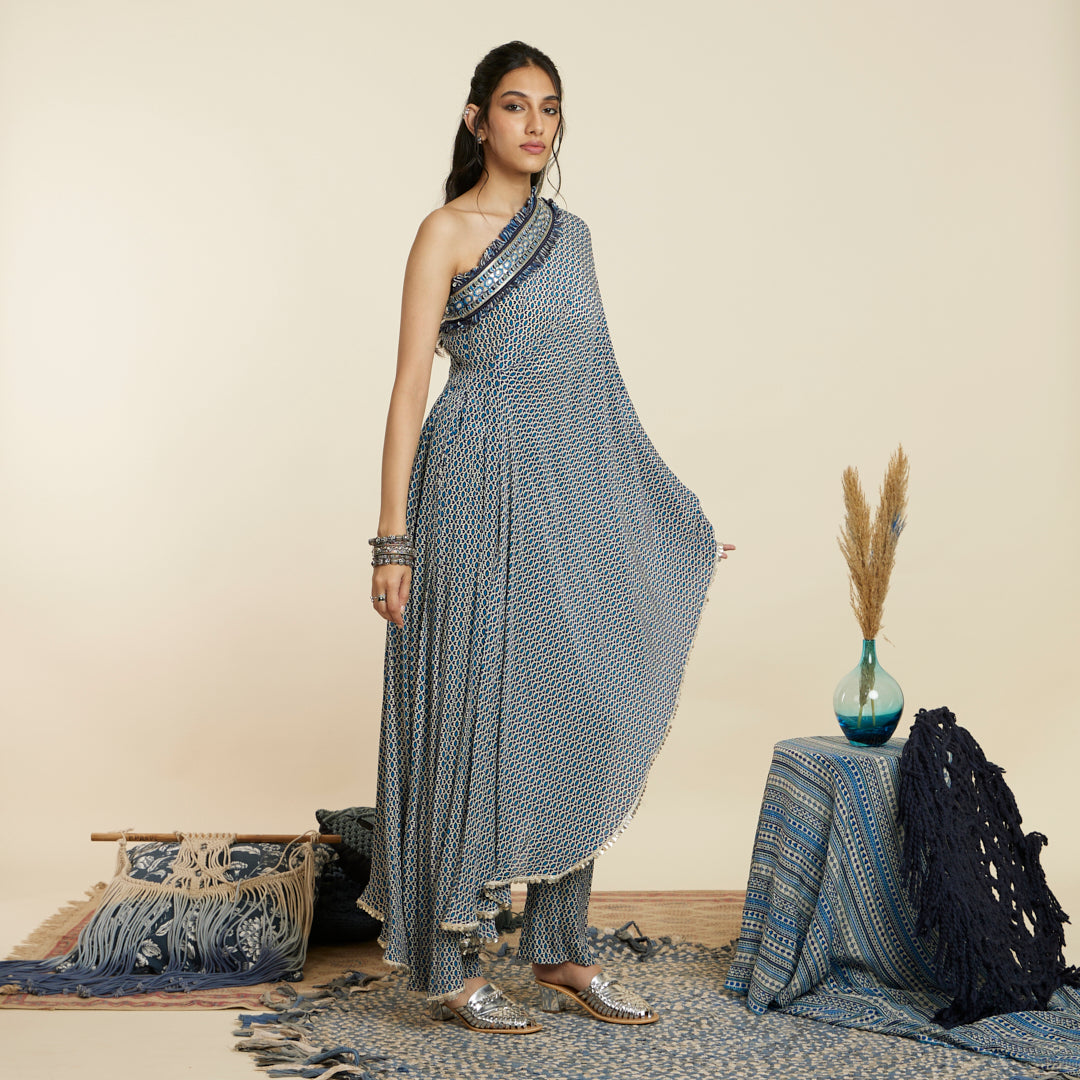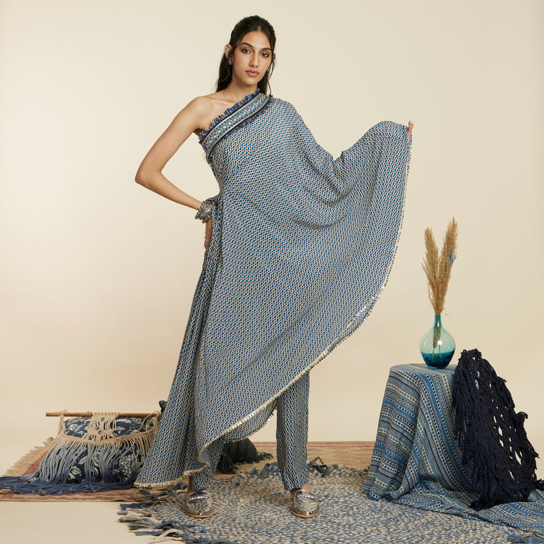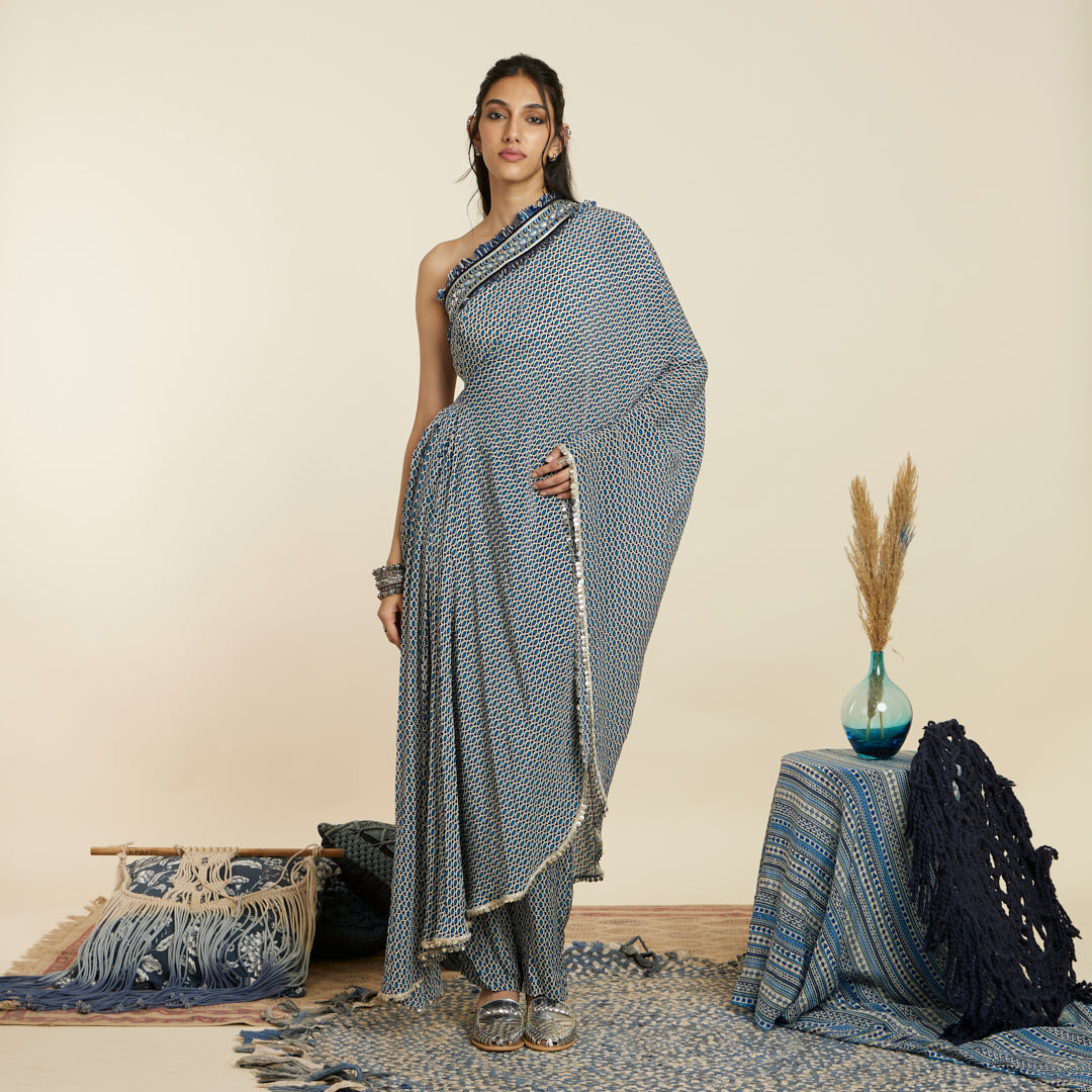 BLUE GEOMETRIC PRINT ONE SHOULDER SAREE WITH PANTS