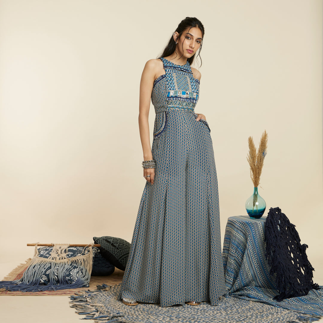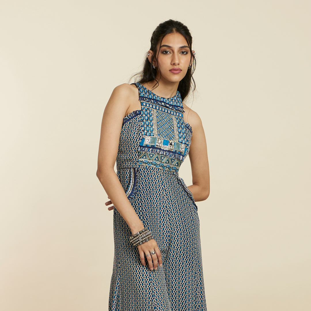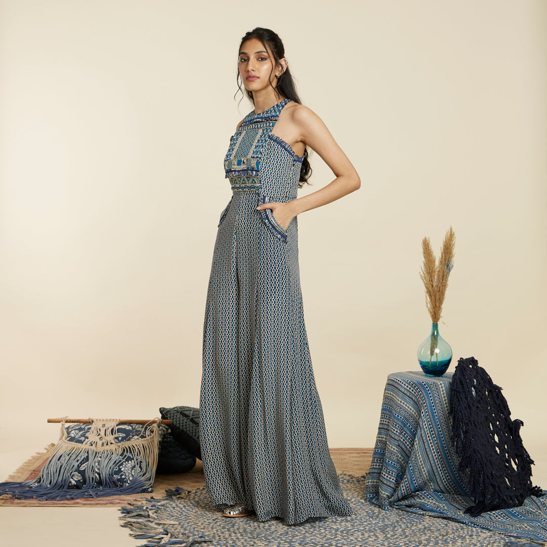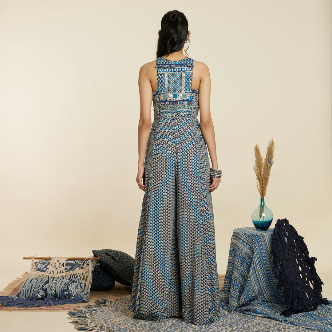 BLUE GEOMETRIC YOKE STYLE JUMPSUIT