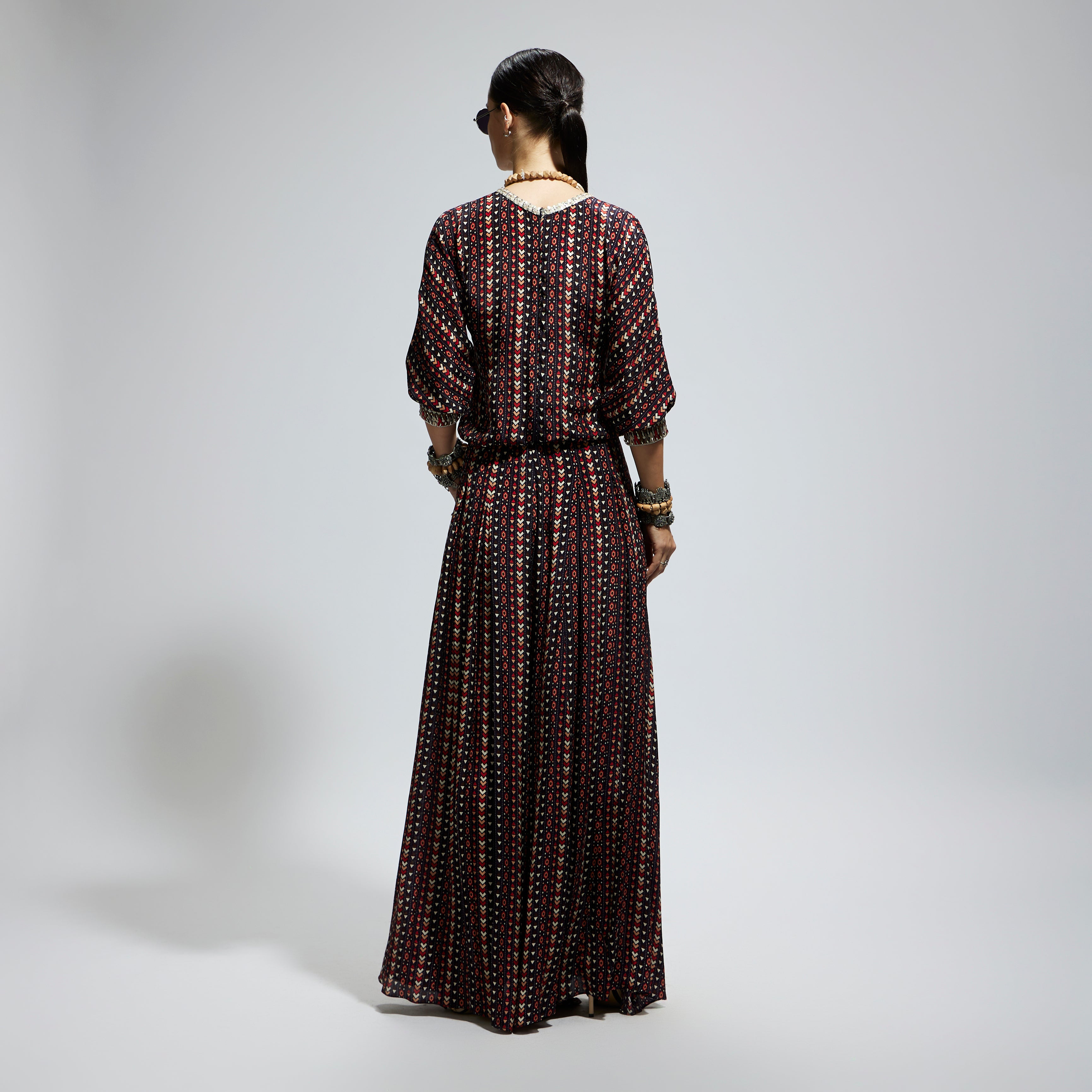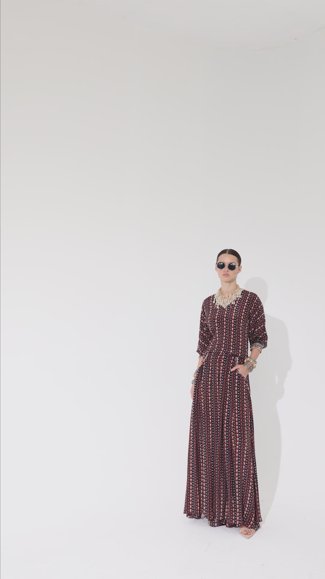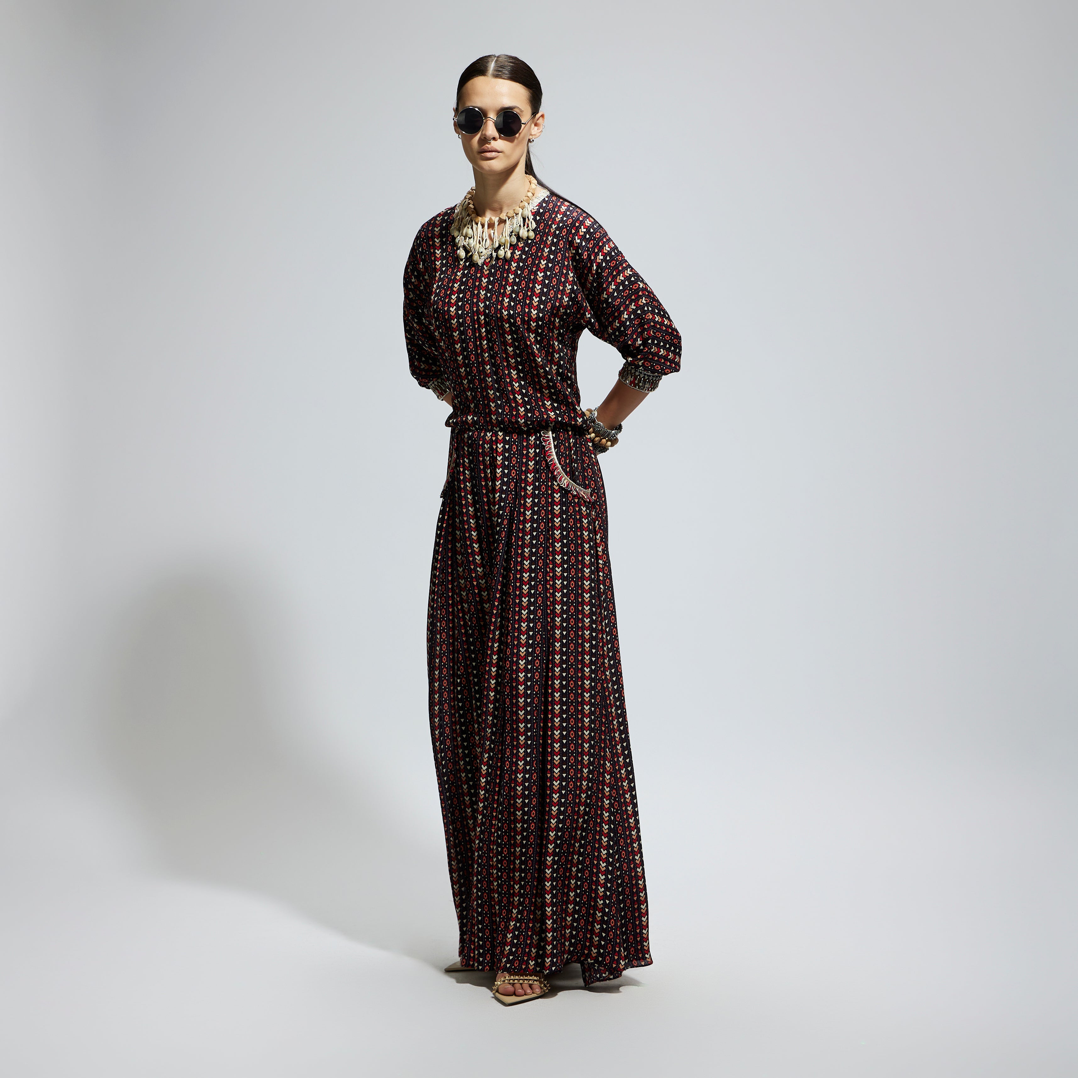 Featuring a blue printed dolman sleeves jumpsuit, crepe fabric, and component 1.